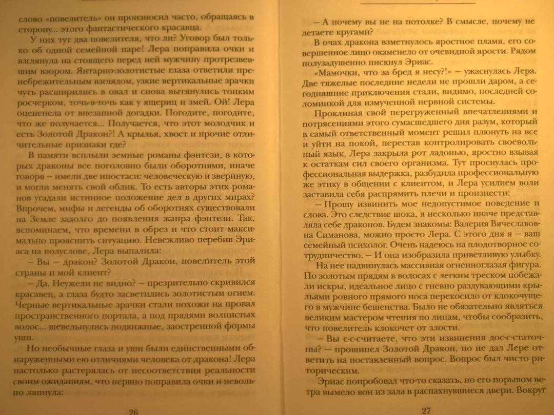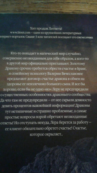 ОписаниеКто-то попадает в магический мир случайно, совершенно неожиданным для себя образом, а кого-то в другой мир официально приглашают: Золотому Дракону срочно требуется обрести счастье в браке и семейному психологу Валерии Вячеславовне предлагают договор: счастье дракона в обмен на здоровье ее неизлечимо больного сына. И все хорошо, если бы не одно "но": Леру не предупредили о существенных особенностях драконьего сообщества. Да что там не предупредили - от нее скрыли девяносто девять процентов важнейшей информации! Драконы тут нетипические и страшно проблемные, а самые простые вопросы порой обретают неожиданные ответы! Но отступать некуда, Лера берется за работу - ее клиент обязательно обретет счастье! Счастье, которое окрыляет...Кто-то попадает в магический мир случайно, совершенно неожиданным для себя образом, а кого-то в другой мир официально приглашают: Золотому Дракону срочно требуется обрести счастье в браке и семейному психологу Валерии Вячеславовне предлагают договор: счастье дракона в обмен на здоровье ее неизлечимо больного сына. И все хорошо, если бы не одно "но": Леру не предупредили о существенных особенностях драконьего сообщества. Да что там не предупредили - от нее скрыли девяносто девять процентов важнейшей информации! Драконы тут нетипические и страшно проблемные, а самые простые вопросы порой обретают неожиданные ответы! Но отступать некуда, Лера берется за работу - ее клиент обязательно обретет счастье! Счастье, которое окрыляет...