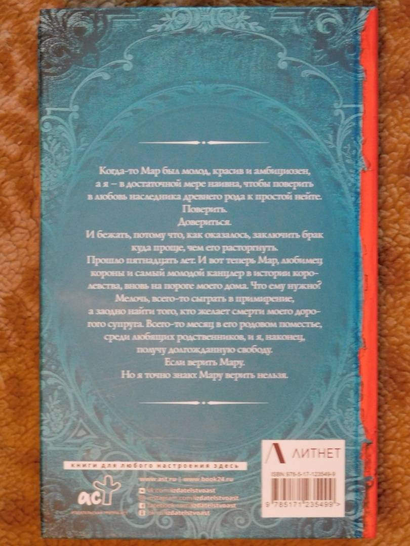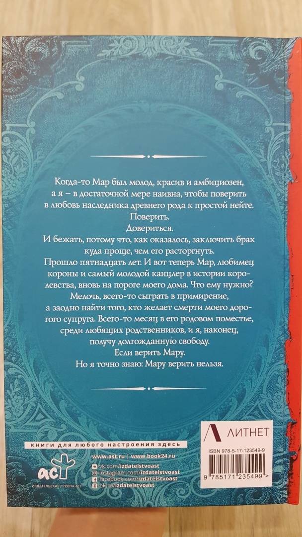 ОписаниеКогда-то Мар был молод, красив и амбициозен, а я – в достаточной мере наивна, чтобы поверить в любовь наследника древнего рода к простой нейте.Поверить.Довериться.И бежать, потому что, как оказалось, заключить брак куда проще, чем его расторгнуть.Прошло пятнадцать лет. И вот теперь Мар, любимец короны и самый молодой канцлер в истории королевства, вновь на пороге моего дома. Что ему нужно? Мелочь, всего-то сыграть в примирение, а заодно найти того, кто желает смерти моего дорогого супруга. Всего-то месяц в его родовом поместье, среди любящих родственников, и я, наконец, получу долгожданную свободу.Если верить Мару.Но я точно знаю: Мару верить нельзя.Когда-то Мар был молод, красив и амбициозен, а я – в достаточной мере наивна, чтобы поверить в любовь наследника древнего рода к простой нейте.Поверить.Довериться.И бежать, потому что, как оказалось, заключить брак куда проще, чем его расторгнуть.Прошло пятнадцать лет. И вот теперь Мар, любимец короны и самый молодой канцлер в истории королевства, вновь на пороге моего дома. Что ему нужно? Мелочь, всего-то сыграть в примирение, а заодно найти того, кто желает смерти моего дорогого супруга. Всего-то месяц в его родовом поместье, среди любящих родственников, и я, наконец, получу долгожданную свободу.Если верить Мару.Но я точно знаю: Мару верить нельзя.