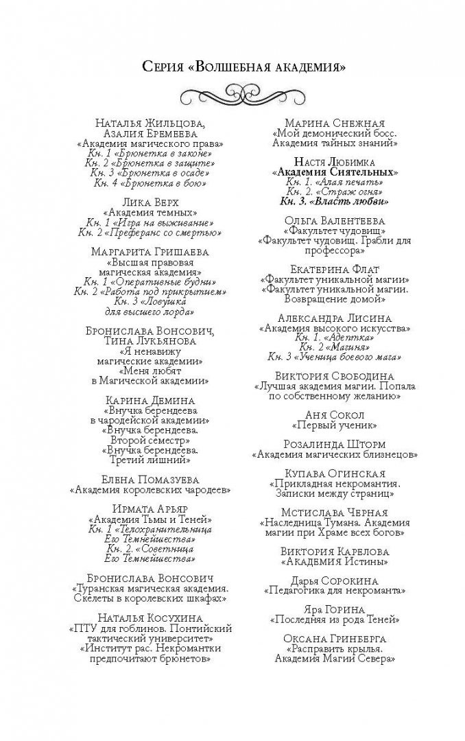 ---Настя Любимка: Власть любви. Академия сиятельныхРусская классическая и современная литератураДетектив. Остросюжетная литератураЗарубежная художественная литератураРусская художественная литератураФэнтезиДраматургияПоэзияПриключенияФантастикаЭпос и фольклорКлассическая прозаАфоризмыИсторическая прозаДетективыБасниСентиментальная прозаОтечественный боевикСовременная прозаМолодежная литератураЗарубежная классическая и современная литература