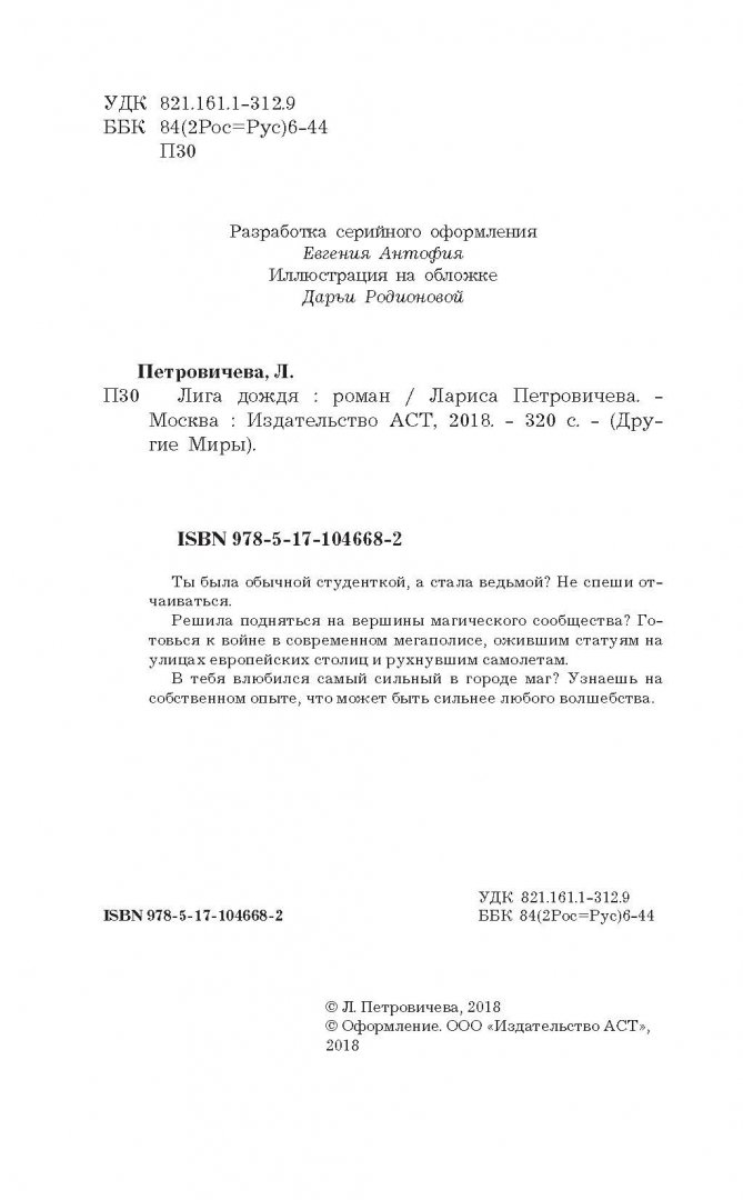 Объем, стр. 320 ISBN 978-5-17-104668-2 Автор Петровичева Лариса Константиновна Серия Другие миры Язык Русский Минимальный возраст 16+ Год издания книги 2018 Тип обложки Твердый переплет Иллюстрации Без иллюстраций Вес, г 252г Размеры 207х135х23 мм - Отзывы