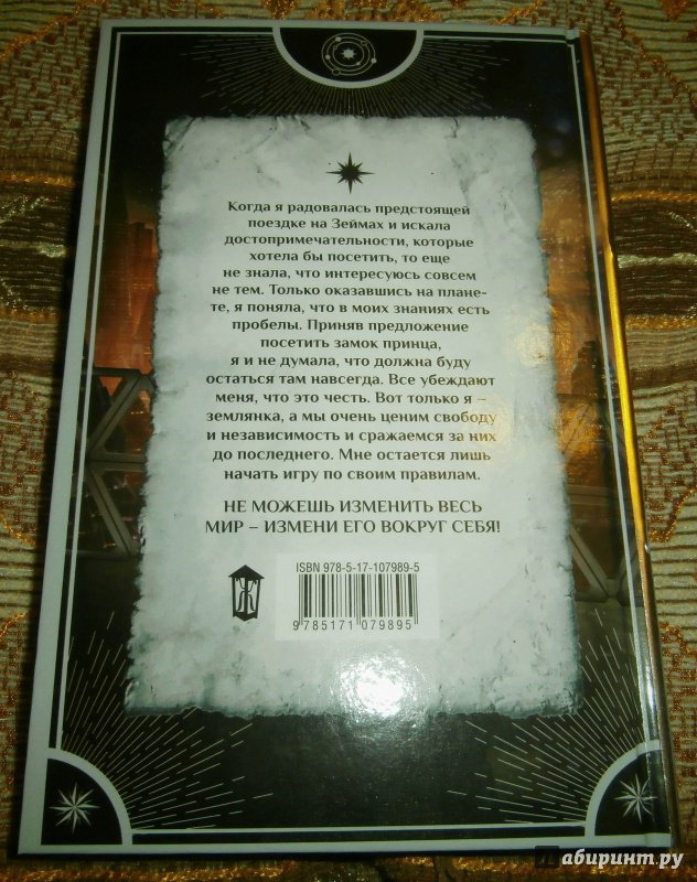 ОписаниеКогда я радовалась предстоящей поездке на Зеймах и искала достопримечательности, которые хотела бы посетить, то еще не знала, что интересуюсь совсем не тем. Только оказавшись на планете, я поняла, что в моих знаниях есть пробелы. Приняв предложение посетить замок принца, я и не думала, что должна буду остаться там навсегда. Все убеждают меня, что это честь. Вот только я - землянка, а мы очень ценим свободу и независимость и сражаемся за них до последнего. Мне остается лишь начать игру по своим правилам.Не можешь изменить весь мир - измени его вокруг себя!Когда я радовалась предстоящей поездке на Зеймах и искала достопримечательности, которые хотела бы посетить, то еще не знала, что интересуюсь совсем не тем. Только оказавшись на планете, я поняла, что в моих знаниях есть пробелы. Приняв предложение посетить замок принца, я и не думала, что должна буду остаться там навсегда. Все убеждают меня, что это честь. Вот только я - землянка, а мы очень ценим свободу и независимость и сражаемся за них до последнего. Мне остается лишь начать игру по своим правилам.Не можешь изменить весь мир - измени его вокруг себя!