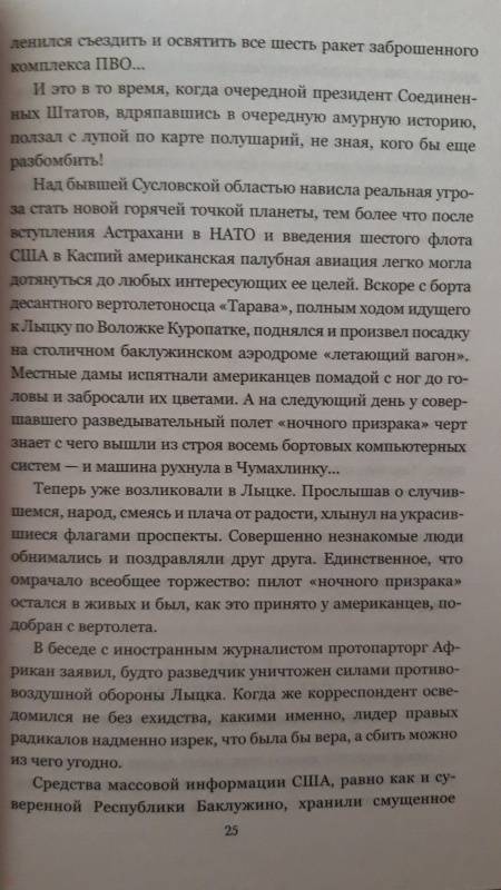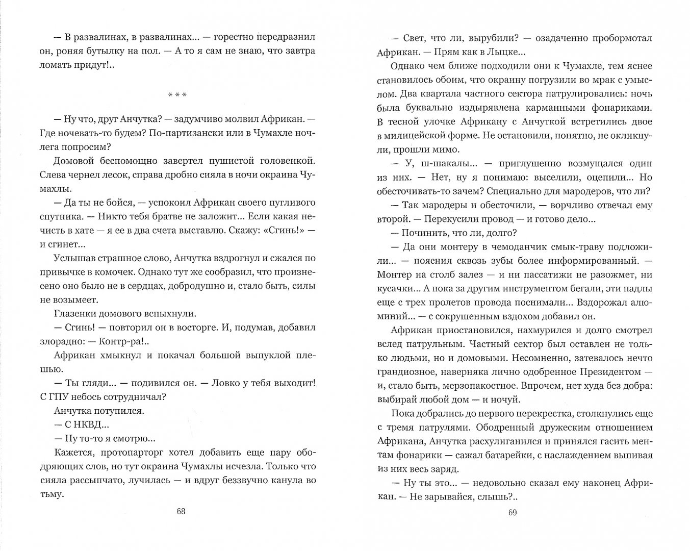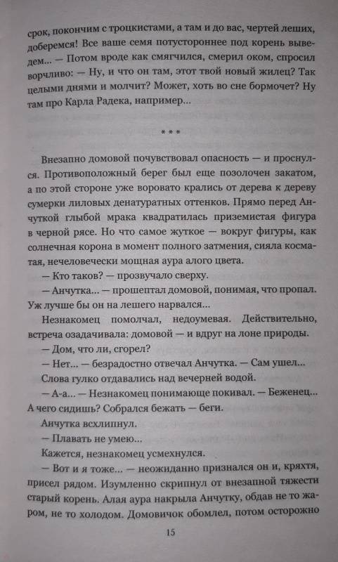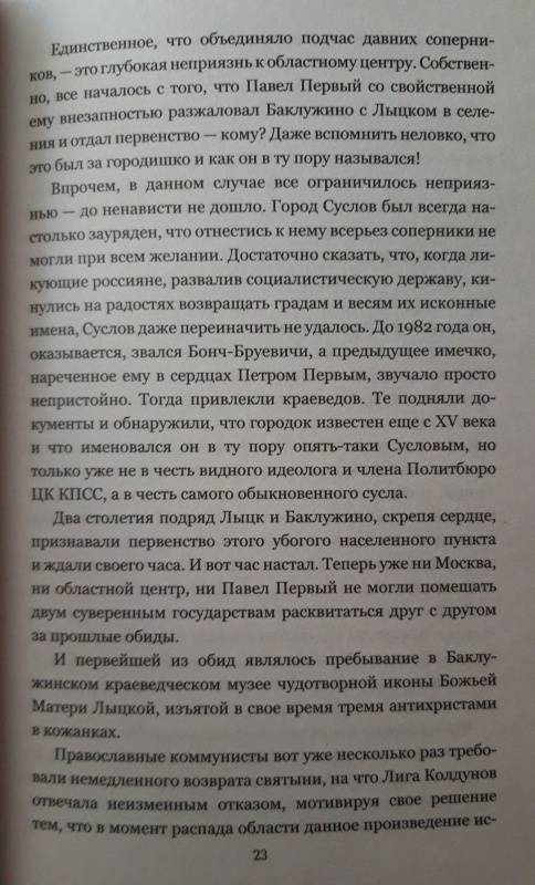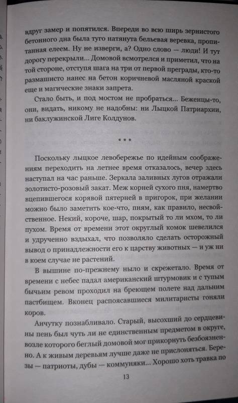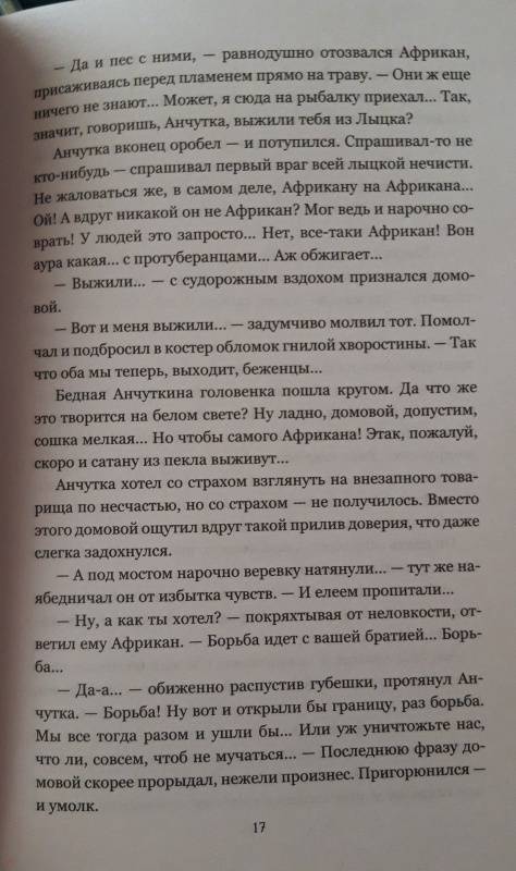 ОписаниеВ наши дни прожить вне политики невозможно, причём не только людям, но даже и нечистой силе. Домовой Анчутка вынужден бежать из социалистического православного Лыцка в демократическое Баклужино, где у власти стоит Лига колдунов. С помощью опального протопарторга Африкана беженец пересекает по воде, аки посуху, государственную границу - и попадает из огня в полымя…В наши дни прожить вне политики невозможно, причём не только людям, но даже и нечистой силе. Домовой Анчутка вынужден бежать из социалистического православного Лыцка в демократическое Баклужино, где у власти стоит Лига колдунов. С помощью опального протопарторга Африкана беженец пересекает по воде, аки посуху, государственную границу - и попадает из огня в полымя…