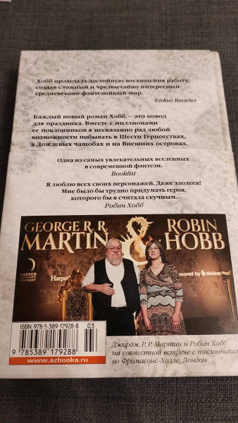 Объем, стр. 608 ISBN 978-5-389-17928-8 Автор 12577, 152438 Переводчик Черезова Татьяна Серия 31344 Язык Русский Минимальный возраст 16+ Год издания книги 2022 Автор Хобб Робин, Мартин Джордж Р. Р. Серия Звезды новой фэнтези Тип обложки Твердый переплет Иллюстрации Без иллюстраций Вес, г 726г Размеры 220х150х30 мм - Отзывы