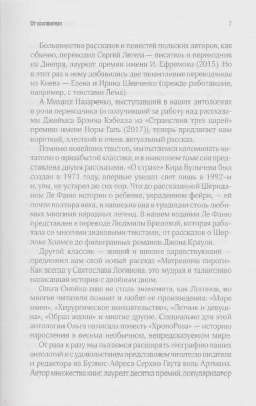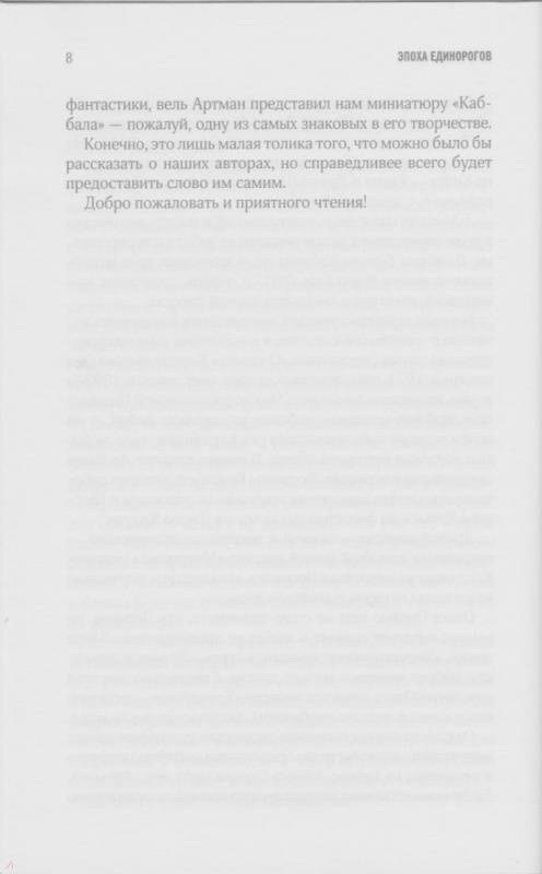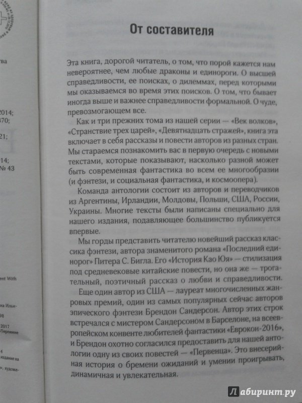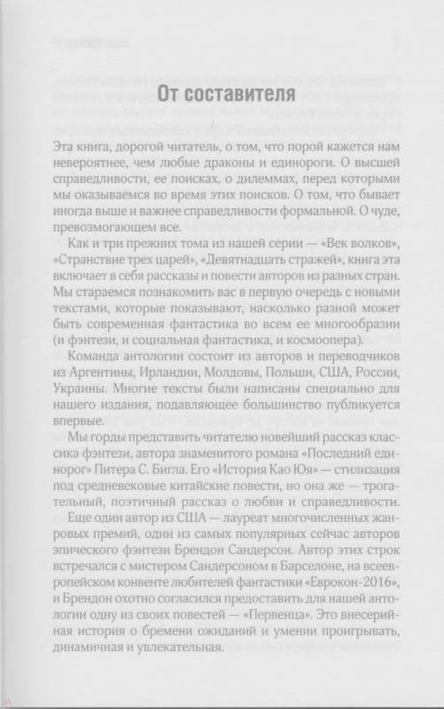 ОписаниеСборник фантастики от лучших авторов со всего мира!- 17 рассказов и повестей- Новые имена и классика- Авторы, награждённые премиями Nebula, Hugo, LocusКогда попрана справедливость и нет надежды на судью неподкупного, наступает время злых чудес. Чудовищные смерти происходят в уютном городке, в холмах пропадают невинные дети, несут с собою пламя и смерть всадники с крестами на плащах…Древние называли такие времена эпохой единорогов - тех, кто способен распознать яд в вине, узреть невинность под наветами. Тех, кто защитит, станет на пути у боли, смерти, отчаяния. В степях Речи Посполитой и в древнем Китае, во время безнадежного сражения в далеком космосе и на волнах немыслимых магических морей - и, конечно же, на Земле, здесь и сейчас, когда они нужнее всего. Единороги, адмиралы космического флота, деревенские знахарки, биотехнологи и даже великие боги древности - каждому потребуется стойкость, терпение и толика настоящего чуда…Семнадцать рассказов и повестей от писателей из Аргентины, Ирландии, Польши, России, США, Украины, в том числе лауреатов премий имени Януша Зайделя и "Еврокона". Самые новые и актуальные тексты, а также несколько жемчужин забытой классики - в очередной, четвертой международной антологии, составленной Владимиром Ареневым.СвернутьСборник фантастики от лучших авторов со всего мира!- 17 рассказов и повестей- Новые имена и классика- Авторы, награждённые премиями Nebula, Hugo, LocusКогда попрана справедливость и нет надежды на судью неподкупного, наступает время злых чудес. Чудовищные смерти происходят в уютном городке, в холмах пропадают невинные дети, несут с собою пламя и смерть всадники с крестами на плащах…Древние называли такие времена эпохой единорогов - тех, кто способен распознать яд в вине, узреть невинность под наветами. Тех, кто защитит, станет на пути у боли, смерти, отчаяния. В степях Речи Посполитой и в древнем Китае, во время безнадежного сражения в далеком космосе и на волнах немыслимых магических морей - и, конечно же, на Земле, здесь и сейчас, когда они нужнее всего. Единороги, адмиралы космического флота, деревенские знахарки, биотехнологи и даже великие боги древности - каждому потребуется стойкость, терпение и толика настоящего чуда…Семнадцать рассказов и повестей от писателей из Аргентины, Ирландии, Польши, России, США, Украины, в том числе лауреатов премий имени Януша Зайделя и "Еврокона". Самые новые и актуальные тексты, а также несколько жемчужин забытой классики - в очередной, четвертой международной антологии, составленной Владимиром Ареневым.СвернутьСвернуть