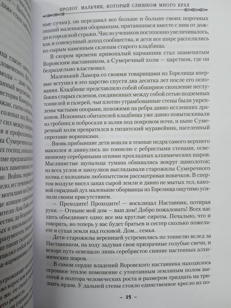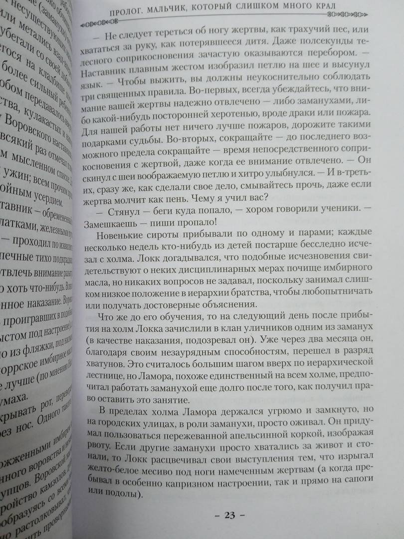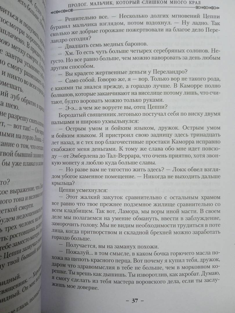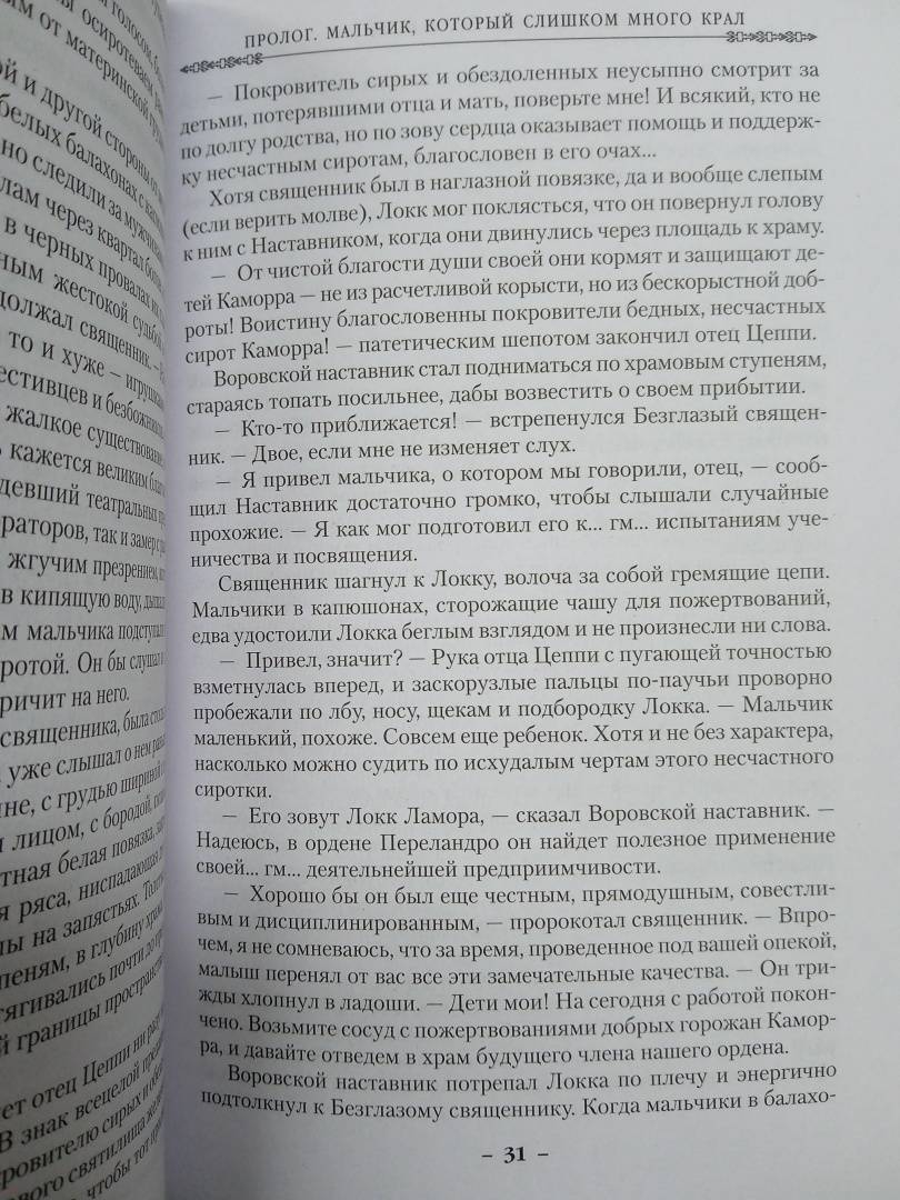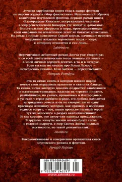 Описание"Свежо, оригинально, крайне занимательно - и великолепно исполнено" (Джордж Мартин). Однажды Воровской наставник явился к отцу Цеппи, Безглазому священнику храма Переландро, чтобы сбыть с рук несносного мальчишку Локка Ламору. Ведь Ламора, хоть и прирожденный вор, был воистину несносен, и для его исключительных талантов город-государство Каморр - прорезанное десятками каналов, раскинувшееся на множестве островов под сенью исполинских башен из стекла Древних - могло оказаться тесным. С течением лет Локку и его Благородным Канальям сходит с рук многое, вплоть до нарушения Тайного уговора, регулирующего всю жизнь Путных людей Каморра, но вот в закулисье преступного сообщества появляется Серый король - безжалостный, невидимый и неуязвимый убийца, - внося свои коррективы в очередную гениальную аферу Локка…"Свежо, оригинально, крайне занимательно - и великолепно исполнено" (Джордж Мартин). Однажды Воровской наставник явился к отцу Цеппи, Безглазому священнику храма Переландро, чтобы сбыть с рук несносного мальчишку Локка Ламору. Ведь Ламора, хоть и прирожденный вор, был воистину несносен, и для его исключительных талантов город-государство Каморр - прорезанное десятками каналов, раскинувшееся на множестве островов под сенью исполинских башен из стекла Древних - могло оказаться тесным. С течением лет Локку и его Благородным Канальям сходит с рук многое, вплоть до нарушения Тайного уговора, регулирующего всю жизнь Путных людей Каморра, но вот в закулисье преступного сообщества появляется Серый король - безжалостный, невидимый и неуязвимый убийца, - внося свои коррективы в очередную гениальную аферу Локка…