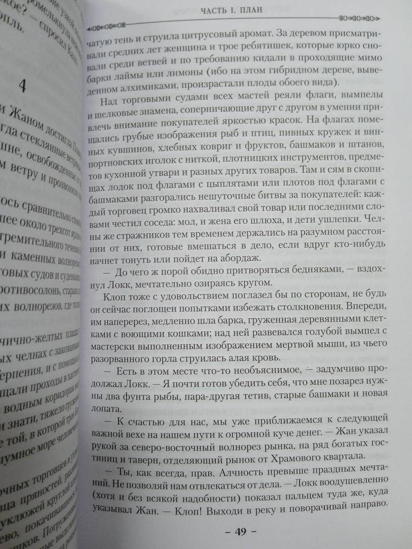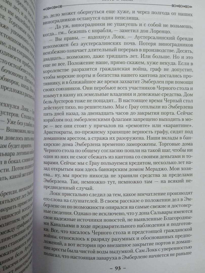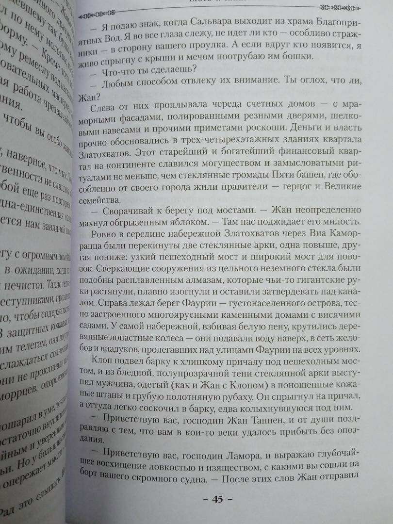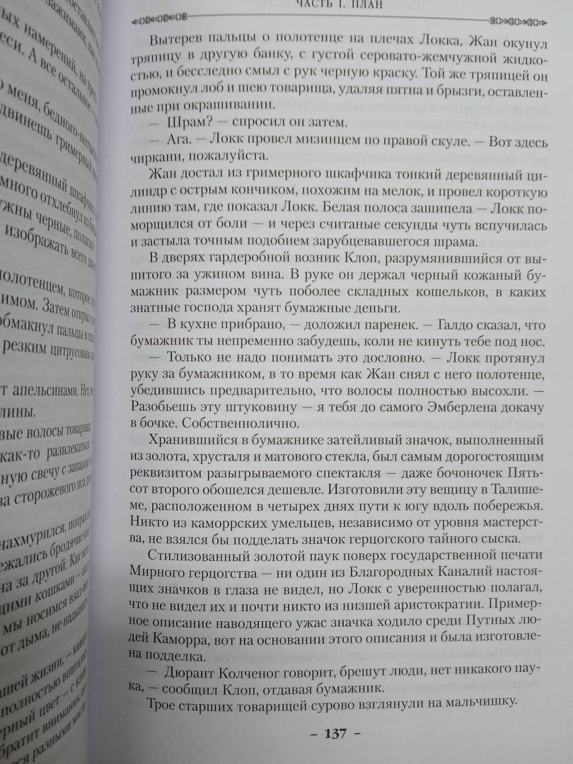 Описание"Свежо, оригинально, крайне занимательно - и великолепно исполнено" (Джордж Мартин). Однажды Воровской наставник явился к отцу Цеппи, Безглазому священнику храма Переландро, чтобы сбыть с рук несносного мальчишку Локка Ламору. Ведь Ламора, хоть и прирожденный вор, был воистину несносен, и для его исключительных талантов город-государство Каморр - прорезанное десятками каналов, раскинувшееся на множестве островов под сенью исполинских башен из стекла Древних - могло оказаться тесным. С течением лет Локку и его Благородным Канальям сходит с рук многое, вплоть до нарушения Тайного уговора, регулирующего всю жизнь Путных людей Каморра, но вот в закулисье преступного сообщества появляется Серый король - безжалостный, невидимый и неуязвимый убийца, - внося свои коррективы в очередную гениальную аферу Локка…"Свежо, оригинально, крайне занимательно - и великолепно исполнено" (Джордж Мартин). Однажды Воровской наставник явился к отцу Цеппи, Безглазому священнику храма Переландро, чтобы сбыть с рук несносного мальчишку Локка Ламору. Ведь Ламора, хоть и прирожденный вор, был воистину несносен, и для его исключительных талантов город-государство Каморр - прорезанное десятками каналов, раскинувшееся на множестве островов под сенью исполинских башен из стекла Древних - могло оказаться тесным. С течением лет Локку и его Благородным Канальям сходит с рук многое, вплоть до нарушения Тайного уговора, регулирующего всю жизнь Путных людей Каморра, но вот в закулисье преступного сообщества появляется Серый король - безжалостный, невидимый и неуязвимый убийца, - внося свои коррективы в очередную гениальную аферу Локка…
