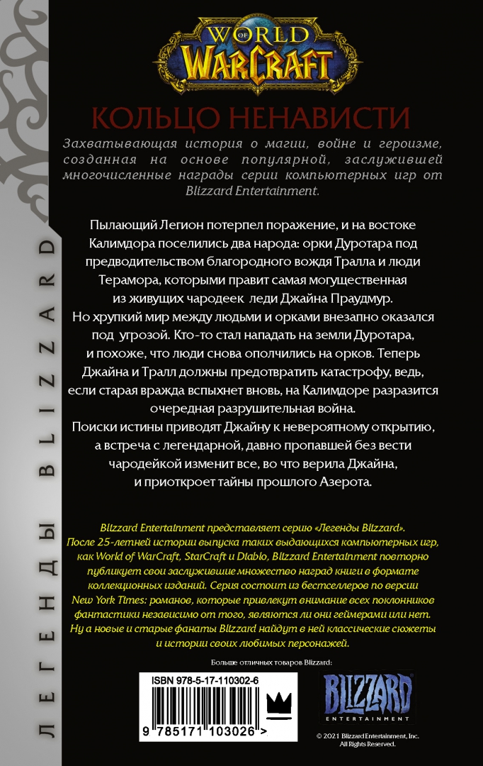 ОписаниеПылающий Легион потерпел поражение, и на востоке Калимдора поселились два народа: орки Дуротара под предводительством благородного вождя Тралла, и люди Терамора, которыми правит самая могущественная из живущих чародеек - леди Джайна Праудмур.Но хрупкий мир между людьми и орками внезапно оказался под угрозой. Кто-то стал нападать на земли Дуротара, и, похоже, что люди снова ополчились на орков. Теперь Джайна и Тралл должны предотвратить катастрофу, ведь, если старая вражда вспыхнет вновь, на Калимдоре разразится очередная разрушительная война.Поиски истины приводят Джайну к невероятному открытию, а встреча с легендарной, давно пропавшей без вести чародейкой изменит все, во что верила Джайна, и приоткроет тайны прошлого Азерота.Пылающий Легион потерпел поражение, и на востоке Калимдора поселились два народа: орки Дуротара под предводительством благородного вождя Тралла, и люди Терамора, которыми правит самая могущественная из живущих чародеек - леди Джайна Праудмур.Но хрупкий мир между людьми и орками внезапно оказался под угрозой. Кто-то стал нападать на земли Дуротара, и, похоже, что люди снова ополчились на орков. Теперь Джайна и Тралл должны предотвратить катастрофу, ведь, если старая вражда вспыхнет вновь, на Калимдоре разразится очередная разрушительная война.Поиски истины приводят Джайну к невероятному открытию, а встреча с легендарной, давно пропавшей без вести чародейкой изменит все, во что верила Джайна, и приоткроет тайны прошлого Азерота.