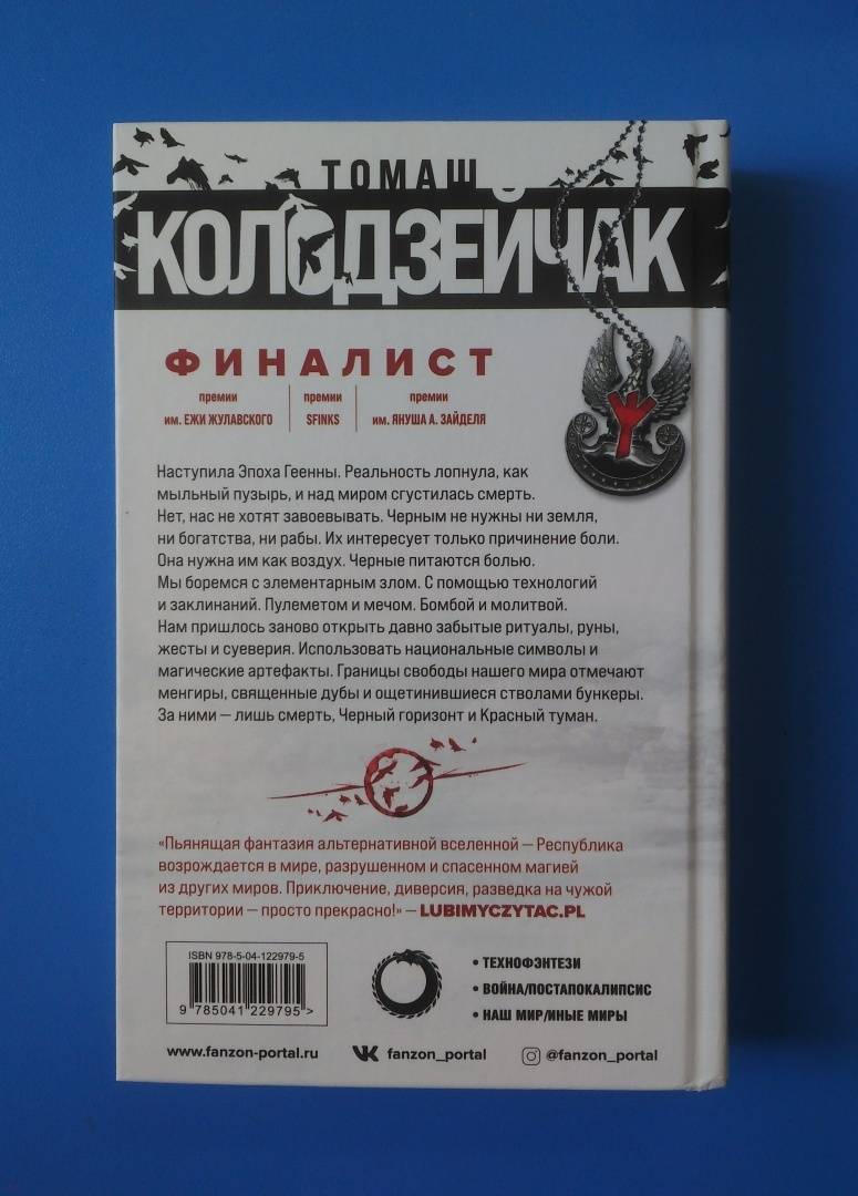 ОписаниеНаступила Эпоха Геенны. Реальность лопнула, как мыльный пузырь, и над миром сгустилась смерть. Нет, нас не хотят завоевывать. Черным не нужны ни земля, ни богатства, ни рабы. Их интересует только причинение боли. Она нужна им как воздух. Черные питаются болью. Мы боремся с элементарным злом. С помощью технологий и заклинаний. Пулеметом и мечом. Бомбой и молитвой. Нам пришлось заново открыть давно забытые ритуалы, руны, жесты и суеверия. Использовать национальные символы и магические артефакты. Границы свободы нашего мира отмечают менгиры, священные дубы и ощетинившиеся стволами бункеры. За ними - лишь смерть, Черный горизонт и Красный туман. Финалист премии им. Ежи Жулавского, премии им. Януша А. Зайделя, премии SFinks. "Пьянящая фантазия альтернативной вселенной - Республика возрождается в мире, разрушенном и спасенном магией из других миров. Приключение, диверсия, разведка на чужой территории - просто прекрасно!" - lubimyczytacНаступила Эпоха Геенны. Реальность лопнула, как мыльный пузырь, и над миром сгустилась смерть. Нет, нас не хотят завоевывать. Черным не нужны ни земля, ни богатства, ни рабы. Их интересует только причинение боли. Она нужна им как воздух. Черные питаются болью. Мы боремся с элементарным злом. С помощью технологий и заклинаний. Пулеметом и мечом. Бомбой и молитвой. Нам пришлось заново открыть давно забытые ритуалы, руны, жесты и суеверия. Использовать национальные символы и магические артефакты. Границы свободы нашего мира отмечают менгиры, священные дубы и ощетинившиеся стволами бункеры. За ними - лишь смерть, Черный горизонт и Красный туман. Финалист премии им. Ежи Жулавского, премии им. Януша А. Зайделя, премии SFinks. "Пьянящая фантазия альтернативной вселенной - Республика возрождается в мире, разрушенном и спасенном магией из других миров. Приключение, диверсия, разведка на чужой территории - просто прекрасно!" - lubimyczytac