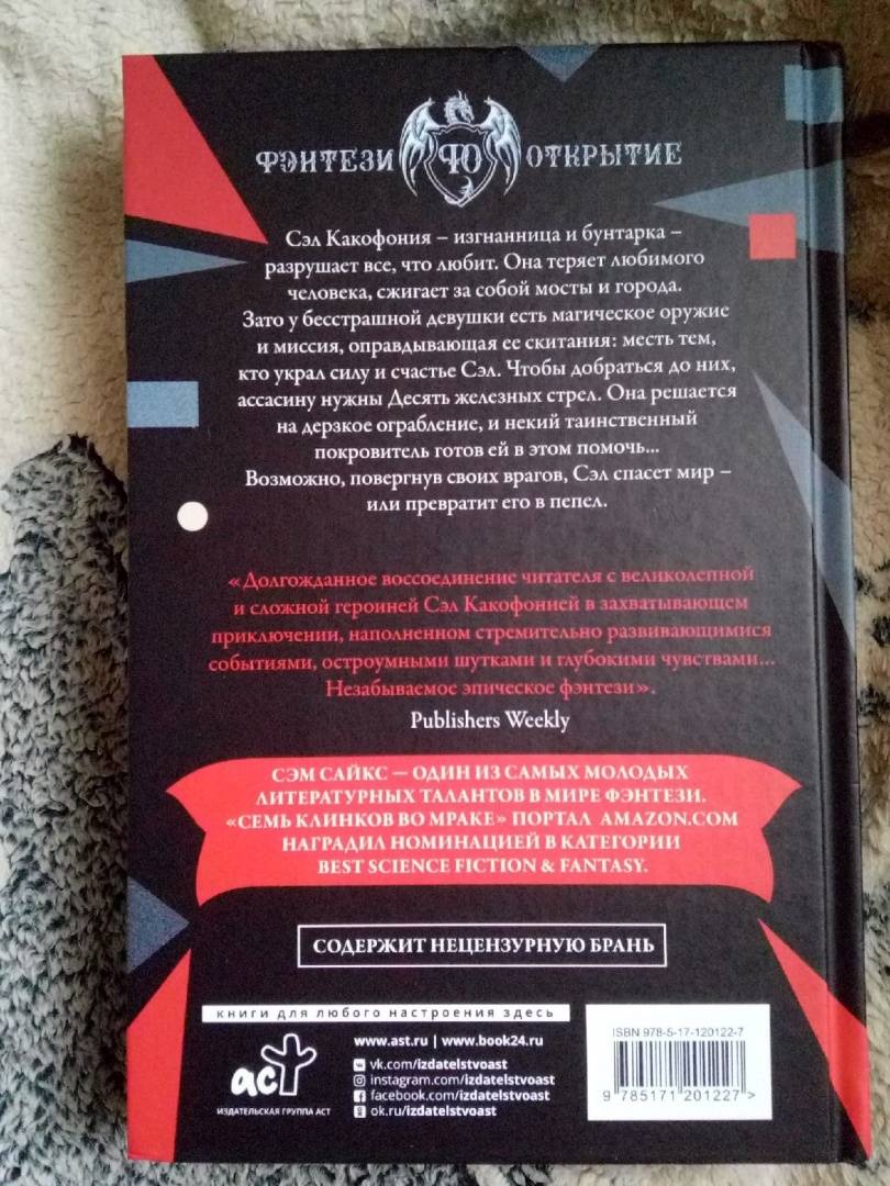 ОписаниеСэл Какофония - изгнанница и бунтарка - разрушает все, что любит. Она теряет любимого человека, сжигает за собой мосты и города. Зато у бесстрашной девушки есть магическое оружие и миссия, оправдывающая ее скитания: месть тем, кто украл силу и счастье Сэл. Чтобы добраться до них, ассасину нужны Десять железных стрел. Она решается на дерзкое ограбление, и некий таинственный покровитель готов ей в этом помочь… Возможно, повергнув своих врагов, Сэл спасет мир - или превратит его в пепел.Сэл Какофония - изгнанница и бунтарка - разрушает все, что любит. Она теряет любимого человека, сжигает за собой мосты и города. Зато у бесстрашной девушки есть магическое оружие и миссия, оправдывающая ее скитания: месть тем, кто украл силу и счастье Сэл. Чтобы добраться до них, ассасину нужны Десять железных стрел. Она решается на дерзкое ограбление, и некий таинственный покровитель готов ей в этом помочь… Возможно, повергнув своих врагов, Сэл спасет мир - или превратит его в пепел.