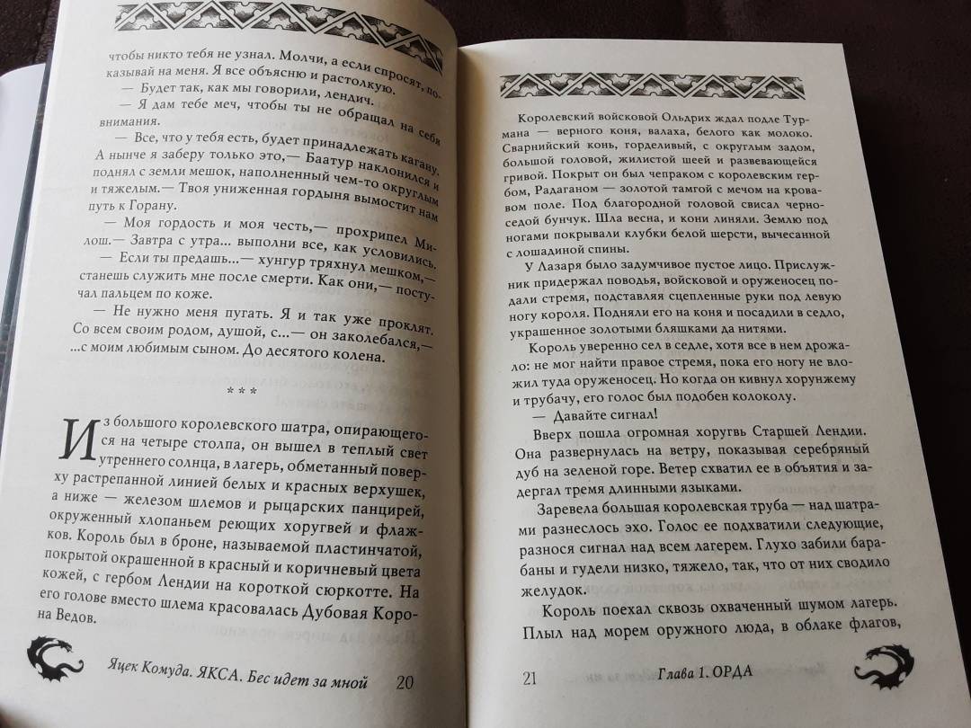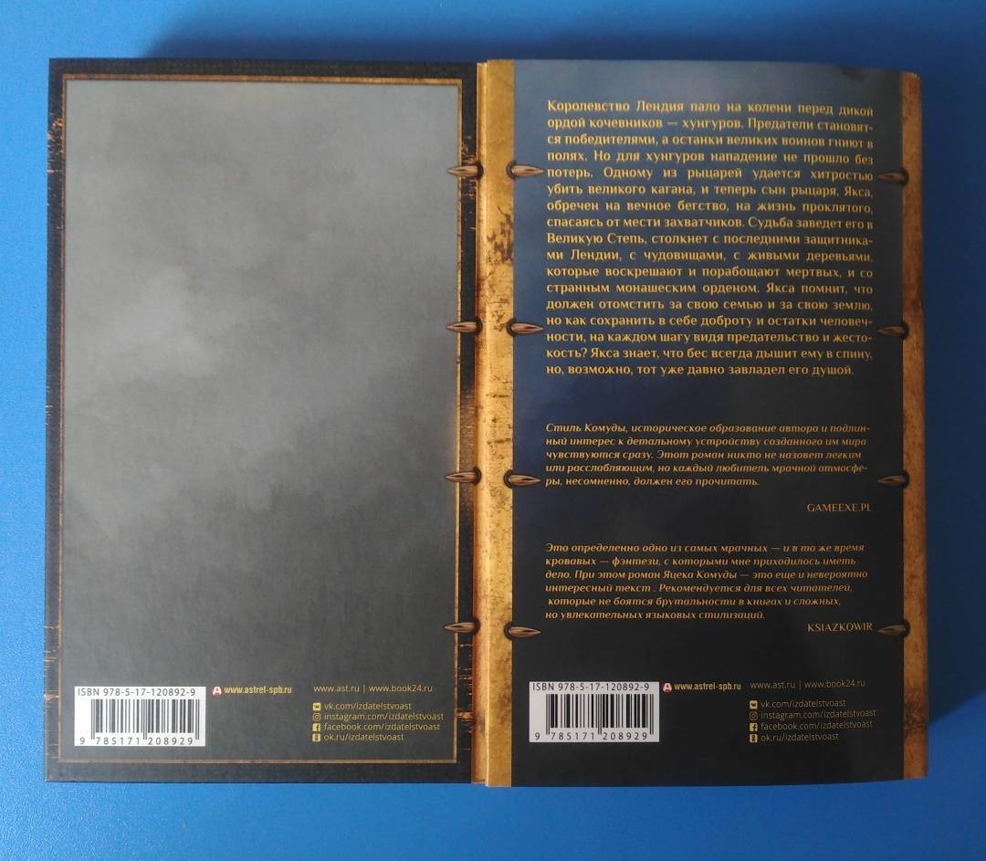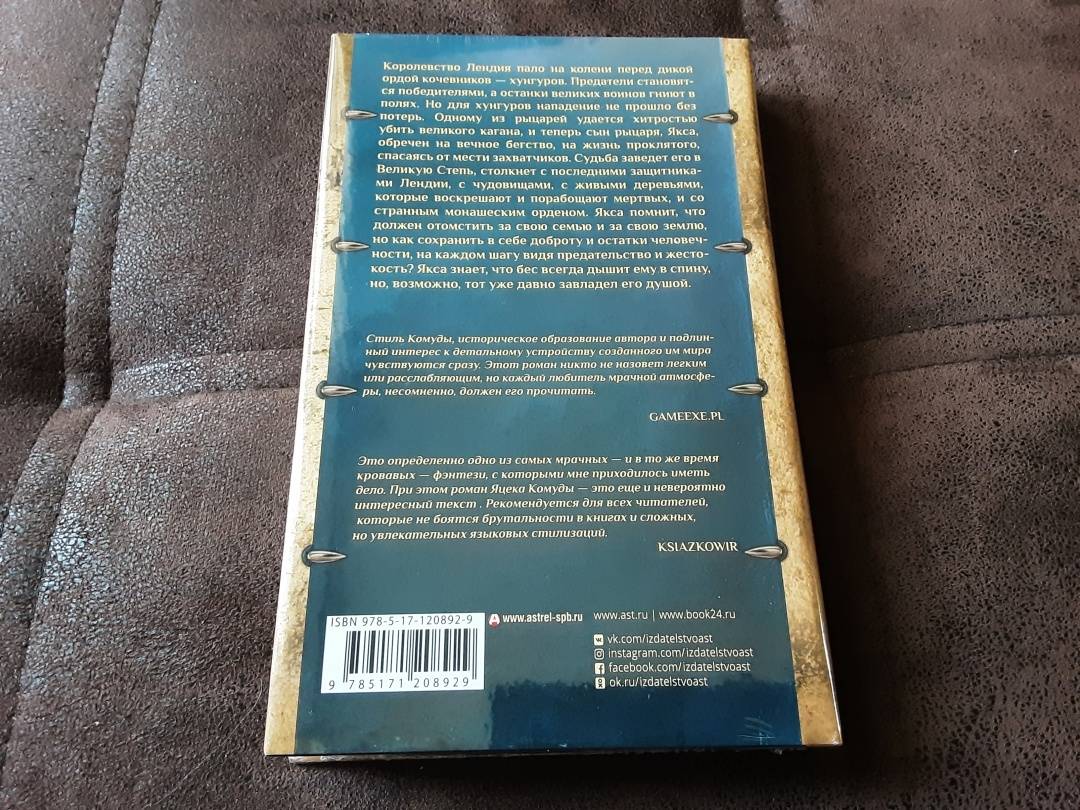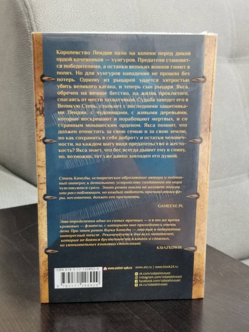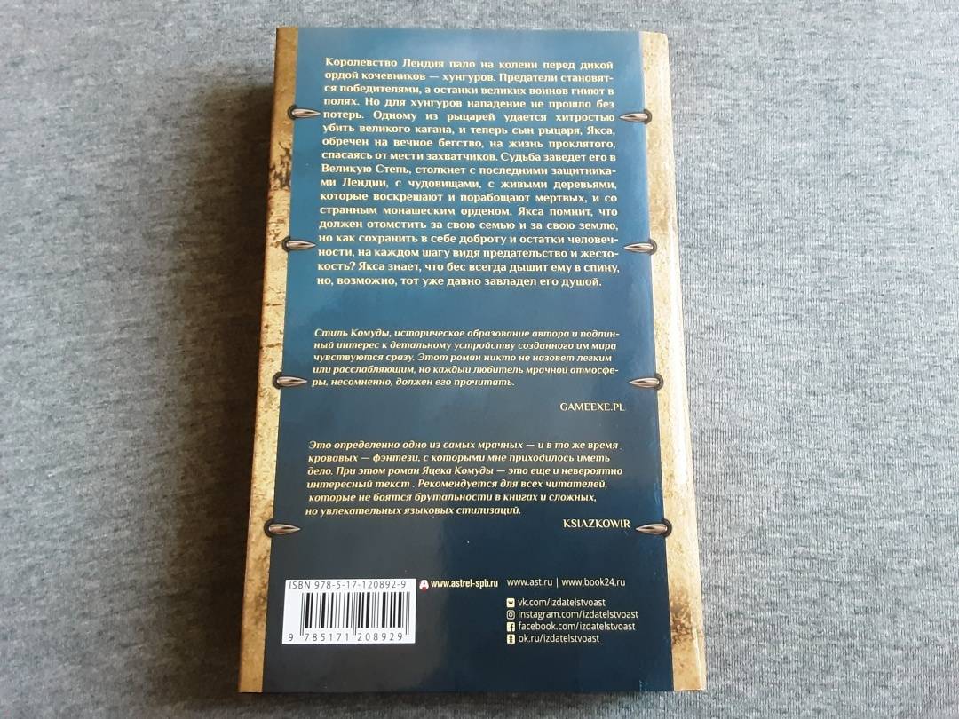 ОписаниеКоролевство Лендия пало на колени перед дикой ордой кочевников — хунгуров. Предатели становятся победителями, а останки великих воинов гниют в полях. Но для хунгуров нападение не прошло без потерь. Одному из рыцарей удается хитростью убить великого кагана, и теперь сын рыцаря, Якса, обречен на вечное бегство, на жизнь проклятого, спасаясь от мести захватчиков. Судьба заведет его в Великую Степь, столкнет с последними защитниками Лендии, с чудовищами, с живыми деревьями, которые воскрешают и порабощают мертвых, и со странным монашеским орденом. Якса помнит, что должен отомстить за свою семью и за свою землю, но как сохранить в себе доброту и остатки человечности, на каждом шагу видя предательство и жестокость? Якса знает, что бес всегда дышит ему в спину, но, возможно, тот уже давно завладел его душой.Королевство Лендия пало на колени перед дикой ордой кочевников — хунгуров. Предатели становятся победителями, а останки великих воинов гниют в полях. Но для хунгуров нападение не прошло без потерь. Одному из рыцарей удается хитростью убить великого кагана, и теперь сын рыцаря, Якса, обречен на вечное бегство, на жизнь проклятого, спасаясь от мести захватчиков. Судьба заведет его в Великую Степь, столкнет с последними защитниками Лендии, с чудовищами, с живыми деревьями, которые воскрешают и порабощают мертвых, и со странным монашеским орденом. Якса помнит, что должен отомстить за свою семью и за свою землю, но как сохранить в себе доброту и остатки человечности, на каждом шагу видя предательство и жестокость? Якса знает, что бес всегда дышит ему в спину, но, возможно, тот уже давно завладел его душой.