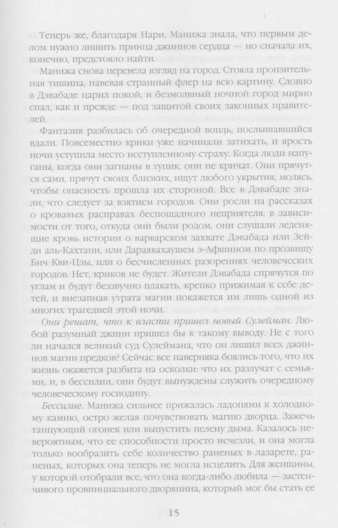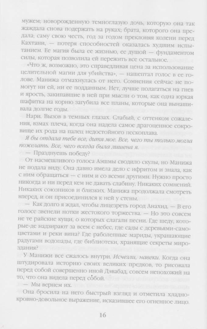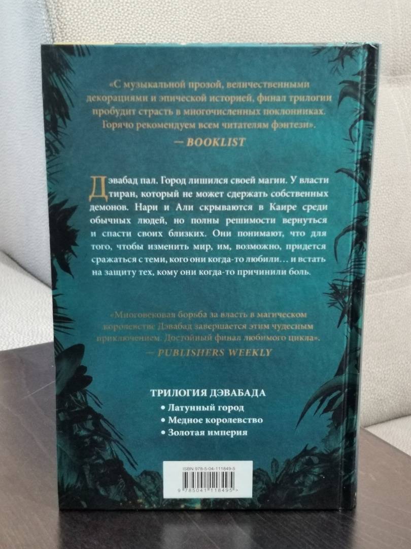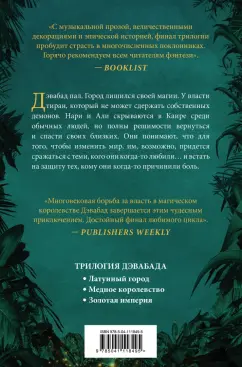 ОписаниеДэвабад пал.Город лишился своей магии. У власти тиран, который не может сдержать собственных демонов. Нари и Али скрываются в Каире среди обычных людей, но полны решимости вернуться и спасти своих близких. Они понимают, что для того, чтобы изменить мир, им, возможно, придется сражаться с теми, кого они когда-то любили… и встать на защиту тех, кому они когда-то причинили боль. Финал "Трилогии Дэвабада" - возвращение в магический мир джиннов.Дэвабад пал.Город лишился своей магии. У власти тиран, который не может сдержать собственных демонов. Нари и Али скрываются в Каире среди обычных людей, но полны решимости вернуться и спасти своих близких. Они понимают, что для того, чтобы изменить мир, им, возможно, придется сражаться с теми, кого они когда-то любили… и встать на защиту тех, кому они когда-то причинили боль. Финал "Трилогии Дэвабада" - возвращение в магический мир джиннов.
