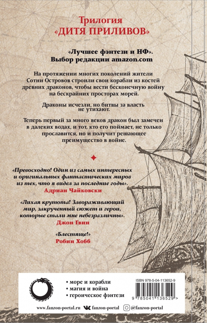 ОписаниеНа протяжении поколений мореходы Ста островов строили свои корабли из костей морских драконов, чтобы вести бесконечную войну. Драконы исчезли, но битвы за превосходство продолжались. Противники стараются захватить две главные ценности: драконью кость для строительства новых кораблей и детей, чьи души после жертвоприношения придают кораблям силы. И вот первый за века дракон был замечен в далеких водах, и обе стороны видят возможность изменить соотношение сил в свою пользу, ведь тот, кто его добудет, выиграет не только славу, но и войну.Дочь верховной правительницы сослана на корабль мертвых. Под ее началом - команда приговоренных к смерти преступников. Возможно ли проклятым остановить войну? Может ли бесчестный умереть с честью?На протяжении поколений мореходы Ста островов строили свои корабли из костей морских драконов, чтобы вести бесконечную войну. Драконы исчезли, но битвы за превосходство продолжались. Противники стараются захватить две главные ценности: драконью кость для строительства новых кораблей и детей, чьи души после жертвоприношения придают кораблям силы. И вот первый за века дракон был замечен в далеких водах, и обе стороны видят возможность изменить соотношение сил в свою пользу, ведь тот, кто его добудет, выиграет не только славу, но и войну.Дочь верховной правительницы сослана на корабль мертвых. Под ее началом - команда приговоренных к смерти преступников. Возможно ли проклятым остановить войну? Может ли бесчестный умереть с честью?