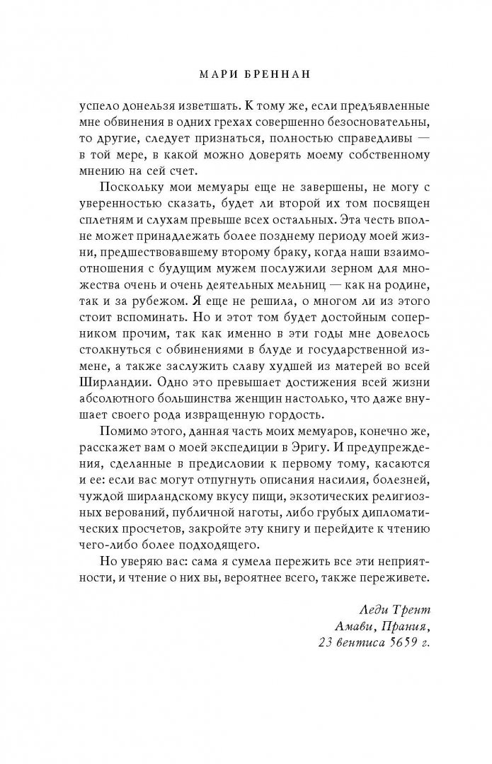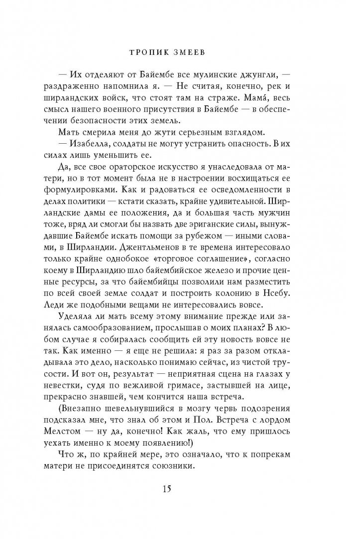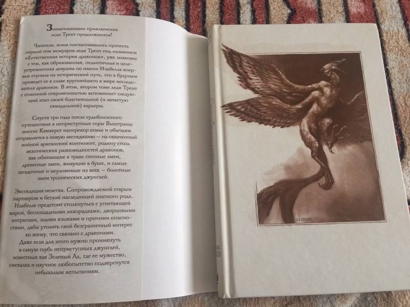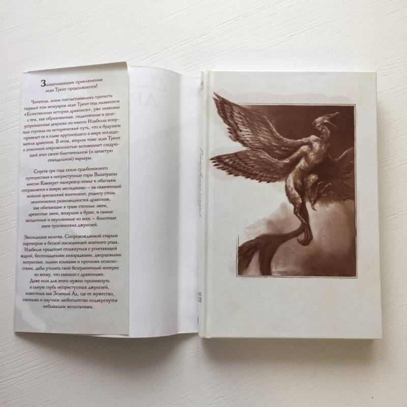 ОписаниеЗахватывающие приключения леди Трент продолжаются!Читатели, коим посчастливилось прочесть первый том мемуаров леди Трент под названием "Естественная история драконов", уже знакомы с тем, как образованная, педантичная и целеустремленная девушка по имени Изабелла впервые ступила на исторический путь, что в будущем приведет ее к славе крупнейшего в мире исследователя драконов. В этом, втором томе леди Трент с отменной откровенностью вспоминает следующий этап своей блистательной (и, зачастую, скандальной) карьеры.Спустя три года после своего судьбоносного путешествия в неприступные горы Выштраны миссис Кэмхерст наперекор семье и обычаям отправляется в новую экспедицию - на охваченный войной эриганский континент, родину столь экзотических разновидностей драконов, как обитающие в траве степные змеи, древесные змеи, живущие в буше, и самые загадочные и неуловимые из всех - болотные змеи тропических джунглей. Экспедиция нелегка. Сопровождаемой старым партнером и беглой наследницей знатного рода, Изабелле предстоит столкнуться с угнетающей жарой, беспощадными лихорадками, дворцовыми интригами, злыми языками и прочими опасностями, дабы утолить свой безграничный интерес ко всему, что связано с драконами. Даже если для этого нужно проникнуть в самую глубь неприступных джунглей, известных как Зеленый Ад, где ее мужество, смекалка и научное любопытство подвергнутся небывалым испытаниям.СвернутьЗахватывающие приключения леди Трент продолжаются!Читатели, коим посчастливилось прочесть первый том мемуаров леди Трент под названием "Естественная история драконов", уже знакомы с тем, как образованная, педантичная и целеустремленная девушка по имени Изабелла впервые ступила на исторический путь, что в будущем приведет ее к славе крупнейшего в мире исследователя драконов. В этом, втором томе леди Трент с отменной откровенностью вспоминает следующий этап своей блистательной (и, зачастую, скандальной) карьеры.Спустя три года после своего судьбоносного путешествия в неприступные горы Выштраны миссис Кэмхерст наперекор семье и обычаям отправляется в новую экспедицию - на охваченный войной эриганский континент, родину столь экзотических разновидностей драконов, как обитающие в траве степные змеи, древесные змеи, живущие в буше, и самые загадочные и неуловимые из всех - болотные змеи тропических джунглей. Экспедиция нелегка. Сопровождаемой старым партнером и беглой наследницей знатного рода, Изабелле предстоит столкнуться с угнетающей жарой, беспощадными лихорадками, дворцовыми интригами, злыми языками и прочими опасностями, дабы утолить свой безграничный интерес ко всему, что связано с драконами. Даже если для этого нужно проникнуть в самую глубь неприступных джунглей, известных как Зеленый Ад, где ее мужество, смекалка и научное любопытство подвергнутся небывалым испытаниям.СвернутьСвернуть