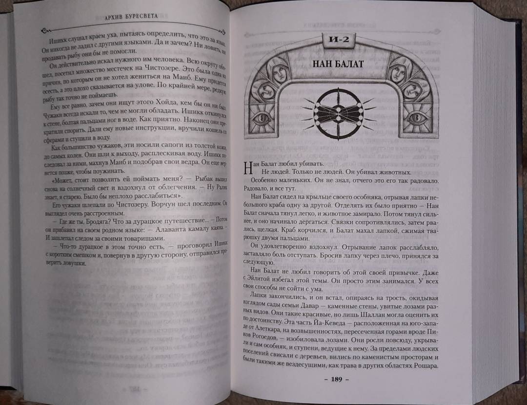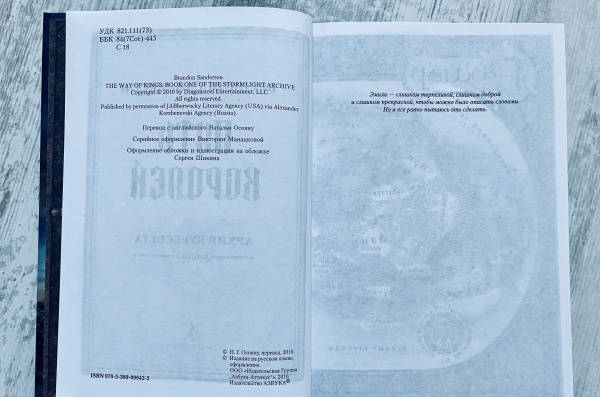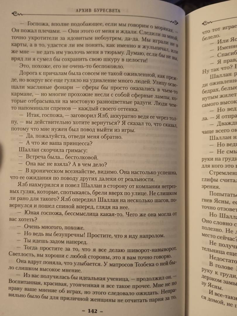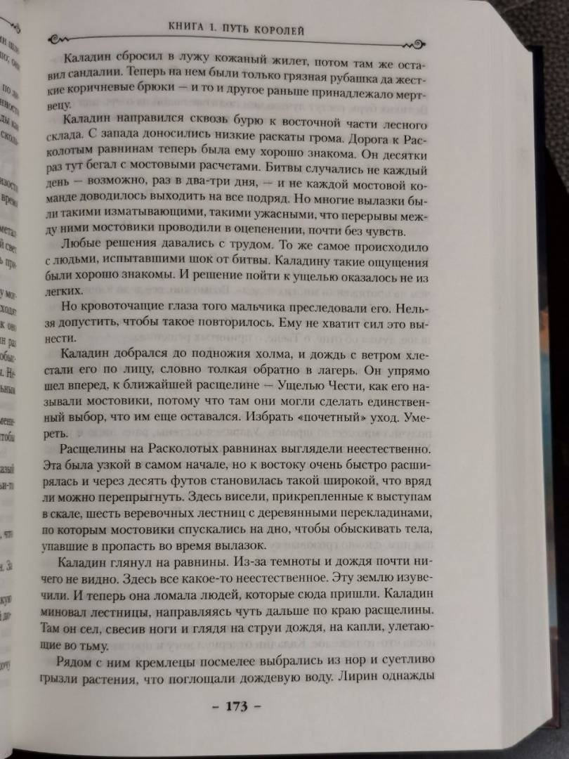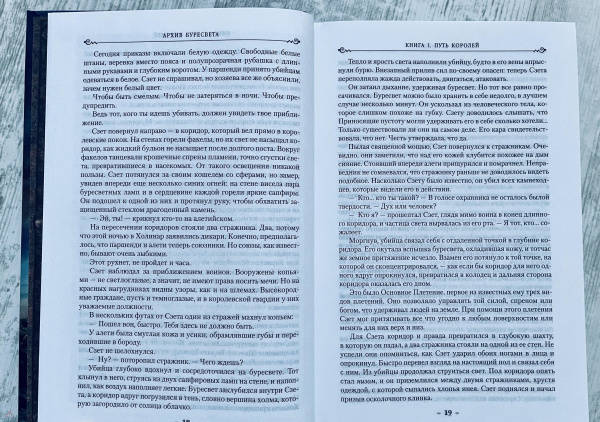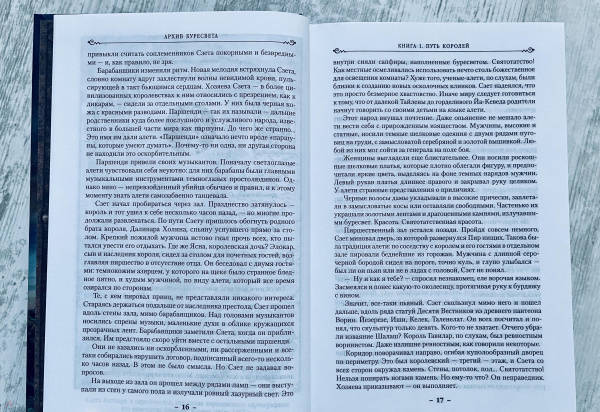 Рошар — мир во власти великих бурь, сметающих все живое на своем пути. Но есть и то, что страшнее любой великой бури, – это истинное опустошение. Одно лишь его ожидание меняет судьбы целых народов. Сумеют ли люди сплотиться перед лицом страшной угрозы? Найдется ли тот, для кого древняя клятва — жизнь прежде смерти, сила прежде слабости, путь прежде цели — станет чем-то большим, нежели просто слова?Масштабная сага погружает читателя в удивительный мир, не уступающий мирам Р. Р. Толкиена, Р. Джордана и Р. Сальваторе. Уникальная флора и фауна, тщательно продуманное политическое устройство и богатая духовная культура – здесь нет ничего случайного.
