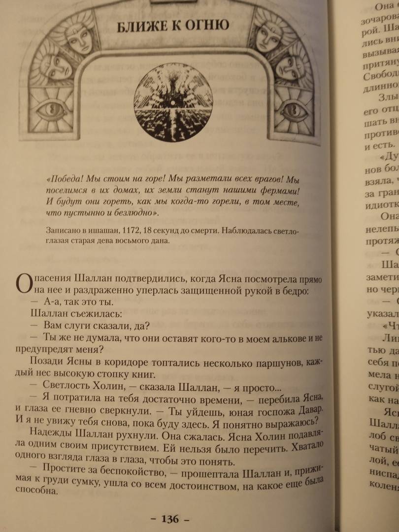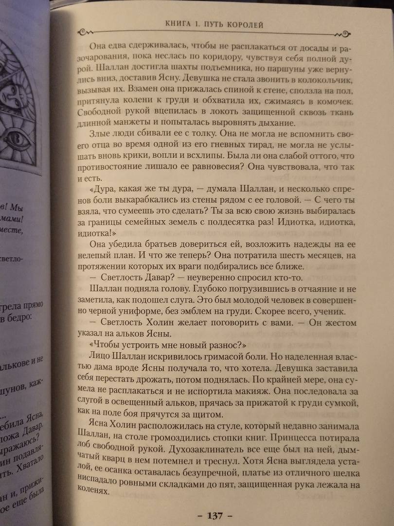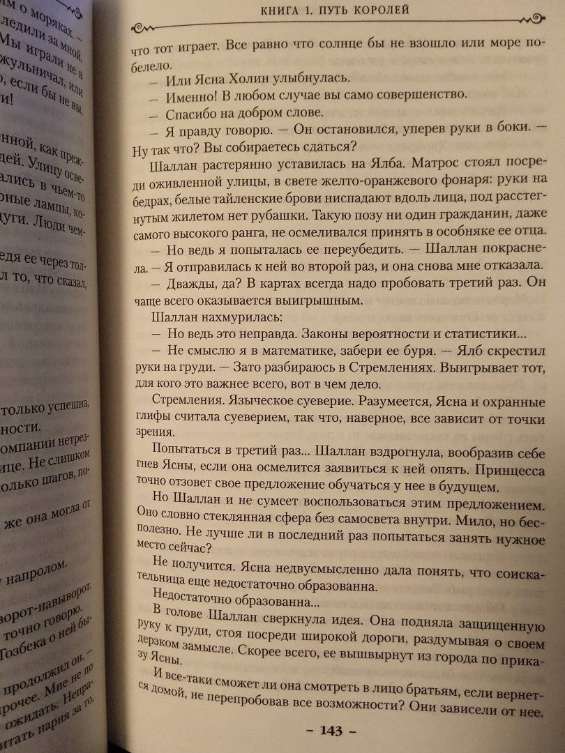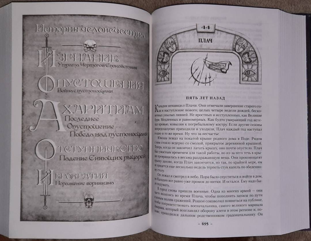 Рошар — мир во власти великих бурь, сметающих все живое на своем пути. Но есть и то, что страшнее любой великой бури, – это истинное опустошение. Одно лишь его ожидание меняет судьбы целых народов. Сумеют ли люди сплотиться перед лицом страшной угрозы? Найдется ли тот, для кого древняя клятва — жизнь прежде смерти, сила прежде слабости, путь прежде цели — станет чем-то большим, нежели просто слова?Масштабная сага погружает читателя в удивительный мир, не уступающий мирам Р. Р. Толкиена, Р. Джордана и Р. Сальваторе. Уникальная флора и фауна, тщательно продуманное политическое устройство и богатая духовная культура – здесь нет ничего случайного.