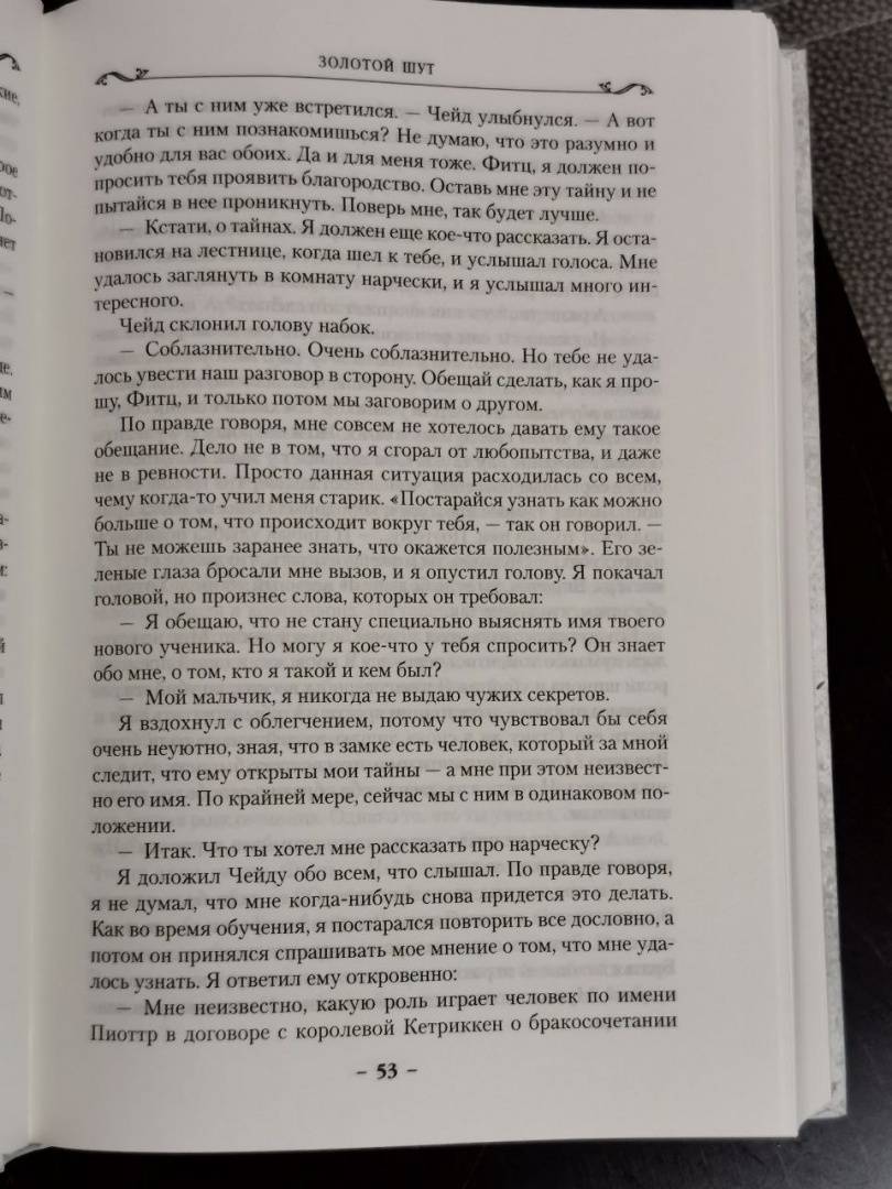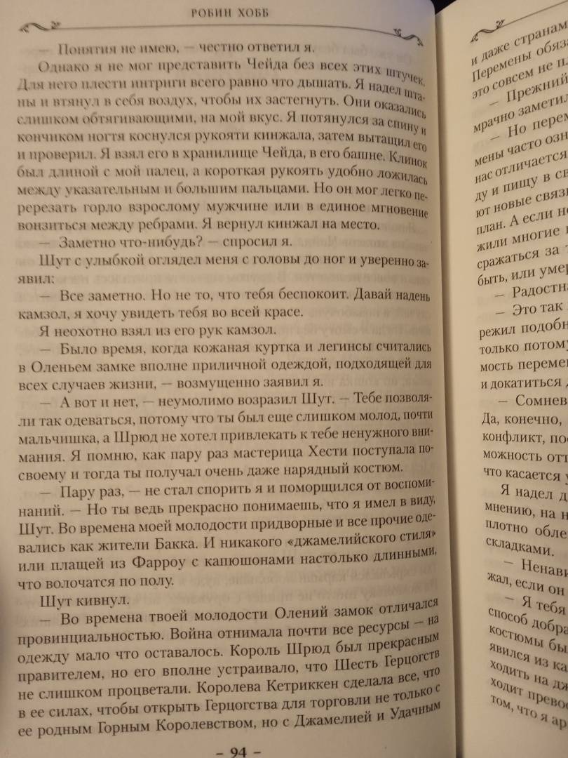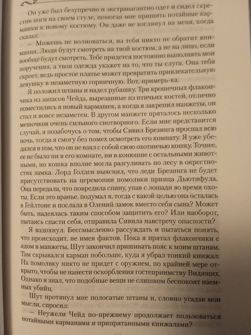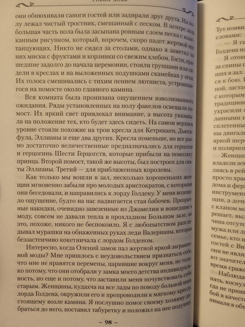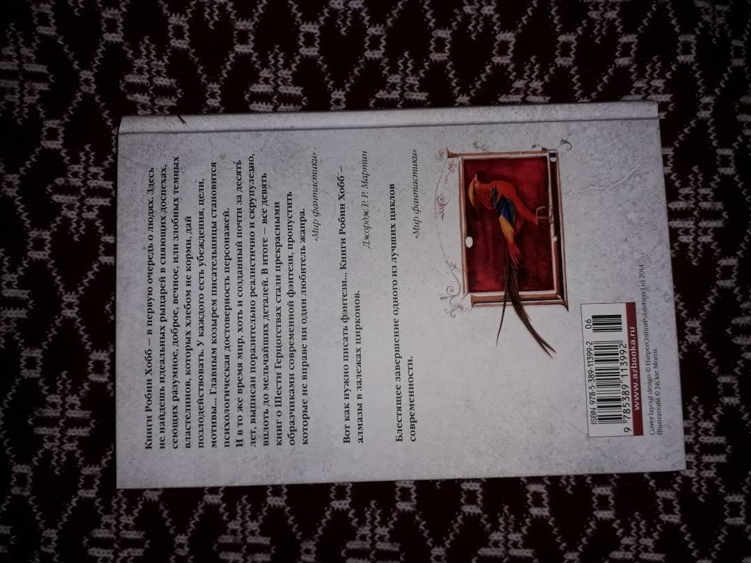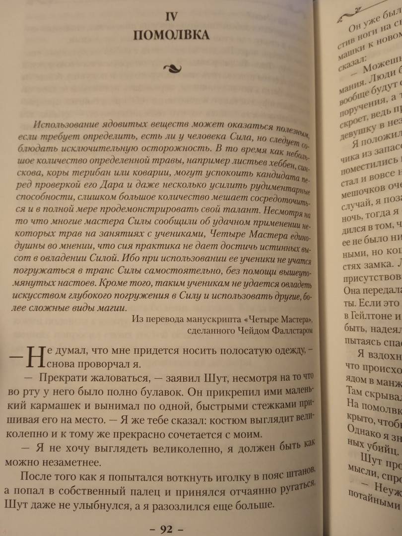 ОписаниеТрон Шести Герцогств опять нуждается в услугах королевского бастарда, способного ученика убийцы и одного из немногих, кто еще владеет древней магией Видящих. Помолвка наследного принца висит на волоске; мятежники-Полукровки по-прежнему угрожают выдать тайну королевского дома; в стране назревают бунты; послы из далекого Удачного просят военной помощи в войне с Калсидой. Кто-то должен научить принца владению магией Видящих, создать для него отряд магов, который в решающий момент поддержит наследника трона. Кто-то должен... Шут, старый друг Фитца и Белый Пророк, верит, что эту ношу может вынести только один человек - Фитц Чивэл Видящий.Трон Шести Герцогств опять нуждается в услугах королевского бастарда, способного ученика убийцы и одного из немногих, кто еще владеет древней магией Видящих. Помолвка наследного принца висит на волоске; мятежники-Полукровки по-прежнему угрожают выдать тайну королевского дома; в стране назревают бунты; послы из далекого Удачного просят военной помощи в войне с Калсидой. Кто-то должен научить принца владению магией Видящих, создать для него отряд магов, который в решающий момент поддержит наследника трона. Кто-то должен... Шут, старый друг Фитца и Белый Пророк, верит, что эту ношу может вынести только один человек - Фитц Чивэл Видящий.