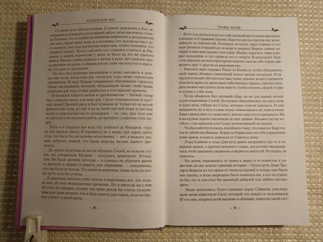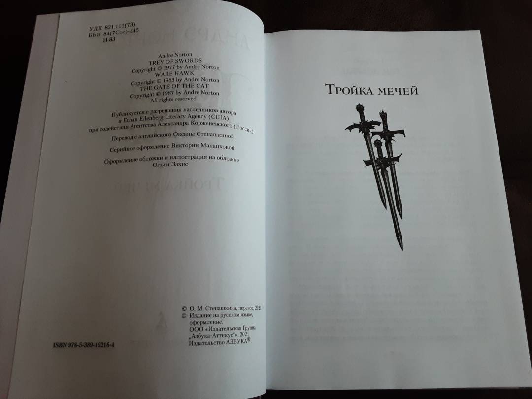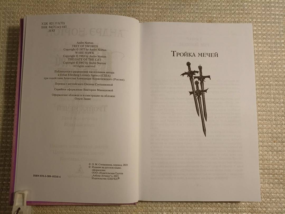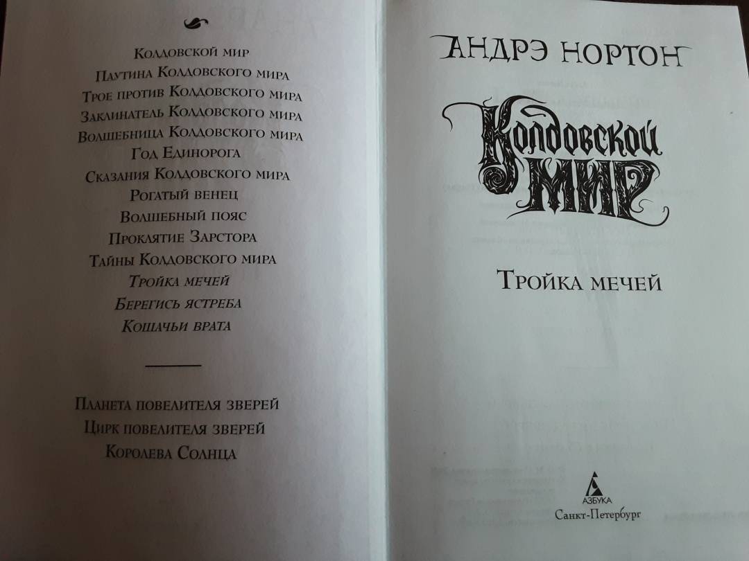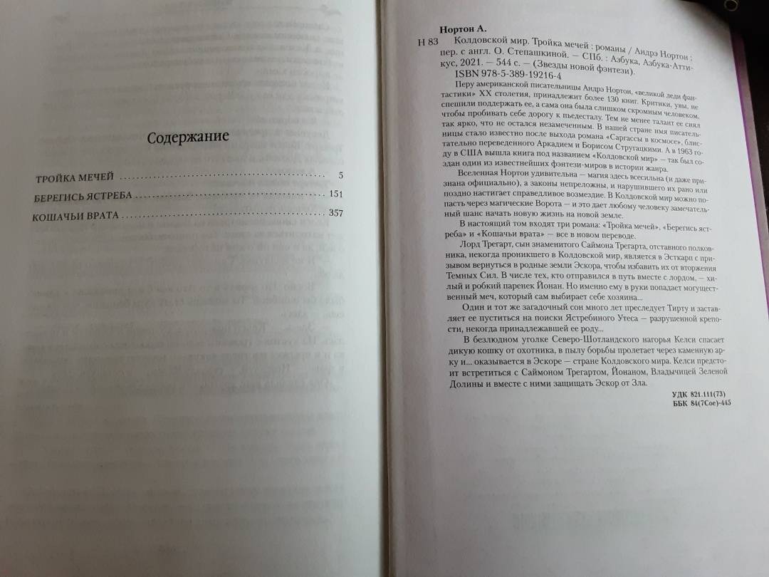 ОписаниеПеру американской писательницы Андрэ Нортон, "великой леди фантастики" XX столетия, принадлежит более 130 книг. Критики, увы, не спешили поддержать ее, а сама она была слишком скромным человеком, чтобы пробивать себе дорогу к пьедесталу. Тем не менее талант ее сиял так ярко, что не остался незамеченным. В нашей стране имя писательницы стало известно после выхода романа "Саргассы в космосе", блистательно переведенного Аркадием и Борисом Стругацкими. А в 1963 году в США вышла книга под названием "Колдовской мир" - так был создан один из известнейших фэнтези-миров в истории жанра.Вселенная Нортон удивительна - магия здесь всесильна (и даже признана официально), а законы непреложны, и нарушившего их рано или поздно настигает справедливое возмездие. В Колдовской мир можно попасть через магические Ворота - и это дает любому человеку замечательный шанс начать новую жизнь на новой земле.В настоящий том входят три романа: "Тройка мечей", "Берегись ястреба" и "Кошачьи врата" - все в новом переводе.Лорд Трегарт, сын знаменитого Саймона Трегарта, отставного полковника, некогда проникшего в Колдовской мир, является в Эсткарп с призывом вернуться в родные земли Эскора, чтобы избавить их от вторжения Темных Сил. В числе тех, кто отправился в путь вместе с лордом, - хилый и робкий паренек Йонан. Но именно ему в руки попадает могущественный меч, который сам выбирает себе хозяина…Один и тот же загадочный сон много лет преследует Тирту и заставляет ее пуститься на поиски Ястребиного Утеса - разрушенной крепости, некогда принадлежавшей ее роду...В безлюдном уголке Северо-Шотландского нагорья Келси спасает дикую кошку от охотника, в пылу борьбы пролетает через каменную арку и... оказывается в Эскоре - стране Колдовского мира. Келси предстоит встретиться с Саймоном Трегартом, Йонаном, Владычицей Зеленой Долины и вместе с ними защищать Эскор от Зла.СвернутьПеру американской писательницы Андрэ Нортон, "великой леди фантастики" XX столетия, принадлежит более 130 книг. Критики, увы, не спешили поддержать ее, а сама она была слишком скромным человеком, чтобы пробивать себе дорогу к пьедесталу. Тем не менее талант ее сиял так ярко, что не остался незамеченным. В нашей стране имя писательницы стало известно после выхода романа "Саргассы в космосе", блистательно переведенного Аркадием и Борисом Стругацкими. А в 1963 году в США вышла книга под названием "Колдовской мир" - так был создан один из известнейших фэнтези-миров в истории жанра.Вселенная Нортон удивительна - магия здесь всесильна (и даже признана официально), а законы непреложны, и нарушившего их рано или поздно настигает справедливое возмездие. В Колдовской мир можно попасть через магические Ворота - и это дает любому человеку замечательный шанс начать новую жизнь на новой земле.В настоящий том входят три романа: "Тройка мечей", "Берегись ястреба" и "Кошачьи врата" - все в новом переводе.Лорд Трегарт, сын знаменитого Саймона Трегарта, отставного полковника, некогда проникшего в Колдовской мир, является в Эсткарп с призывом вернуться в родные земли Эскора, чтобы избавить их от вторжения Темных Сил. В числе тех, кто отправился в путь вместе с лордом, - хилый и робкий паренек Йонан. Но именно ему в руки попадает могущественный меч, который сам выбирает себе хозяина…Один и тот же загадочный сон много лет преследует