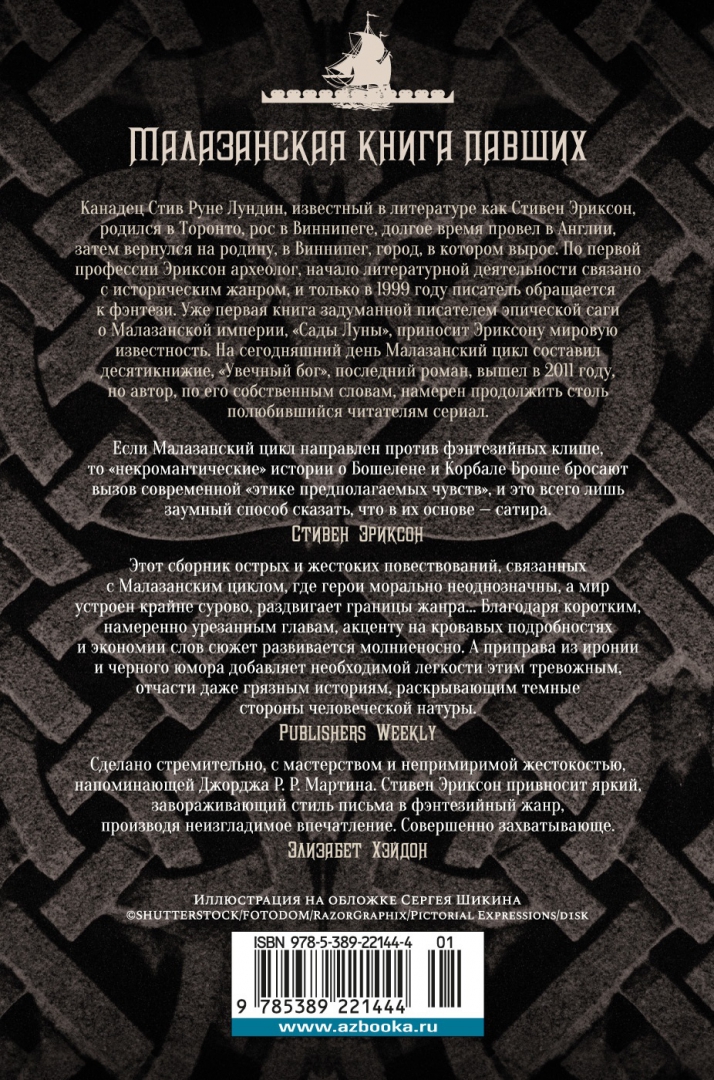 ОписаниеСтивен Эриксон, создатель знаменитого Малазанского цикла ("Малазанская книга павших"), оцененного по достоинству как читателями, так и признанными мастерами фэнтезийного жанра, вновь ведет нас по запутанным тропам своей вселенной, где искусство магии столь же обыденно, как в нашем мире самолет и автомобиль. Шесть историй о Бошелене и Корбале Броше, двух странствующих чародеях-некромантах, и их горемычном слуге Эмансипоре Ризе ввергнут нас в такую бездну страстей, что мало не покажется никому. Герои наши не отличаются благонравием, ведь в мире, который их окружает, нет места сентиментальности и доверчивости, здесь надо держать ухо востро, чтобы тебя не съели - и в переносном, и в прямом смысле. Им, правда, по роду деятельности помогают души умерших, способные прорицать будущее, - но не всегда и без особой охоты, так что лучше надеяться на себя, на удачу и на попутный ветер. Впервые на русском!Стивен Эриксон, создатель знаменитого Малазанского цикла ("Малазанская книга павших"), оцененного по достоинству как читателями, так и признанными мастерами фэнтезийного жанра, вновь ведет нас по запутанным тропам своей вселенной, где искусство магии столь же обыденно, как в нашем мире самолет и автомобиль. Шесть историй о Бошелене и Корбале Броше, двух странствующих чародеях-некромантах, и их горемычном слуге Эмансипоре Ризе ввергнут нас в такую бездну страстей, что мало не покажется никому. Герои наши не отличаются благонравием, ведь в мире, который их окружает, нет места сентиментальности и доверчивости, здесь надо держать ухо востро, чтобы тебя не съели - и в переносном, и в прямом смысле. Им, правда, по роду деятельности помогают души умерших, способные прорицать будущее, - но не всегда и без особой охоты, так что лучше надеяться на себя, на удачу и на попутный ветер. Впервые на русском!