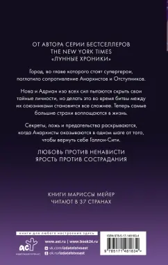 Город, во главе которого стоят супергерои, поглотило сопротивление Анархистов и Отступников.Нова и Адриан изо всех сил пытаются скрыть свои тайные личности, но делать это во время битвы между их союзниками становится все сложнее. Теперь самые большие страхи воплощаются в жизнь.Секреты, ложь и предательства раскрываются, когда Анархисты оказываются в одном шаге от того, чтобы вернуть себе Галлон-Сити.«Это лучший супергеройский роман, который я читала! А я читала более 100 супергеройских романов и знаю, о чем говорю. 10 из 10. Марисса Мейер блестяще справилась с финалом».