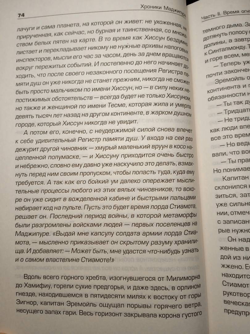 ОписаниеУличный мальчишка Хиссун, за свою помощь лорду Валентину, получил работу государственного чиновника в Лабиринте. Теперь он клерк в Доме Записей. Его задание - организации архивов сборщиков налогов со всех континентов планеты. От этого можно впасть в уныние. Бесполезная работа - никому никогда не понадобятся его находки и результаты труда…Но в Лабиринте, рядом с Домом Записей, есть более интересное место - Регистр памяти душ.Здесь хранятся миллионы телепатически загруженных сознаний разных существ, которые жили здесь на протяжении тысячелетий. Их жизни полны рассказов о любви и потере, триумфе и падении… И по мере того, как Хиссун погружается в истории тех, кто жил в другие времена, он создает свою собственную хронику - хронику Маджипура.Уличный мальчишка Хиссун, за свою помощь лорду Валентину, получил работу государственного чиновника в Лабиринте. Теперь он клерк в Доме Записей. Его задание - организации архивов сборщиков налогов со всех континентов планеты. От этого можно впасть в уныние. Бесполезная работа - никому никогда не понадобятся его находки и результаты труда…Но в Лабиринте, рядом с Домом Записей, есть более интересное место - Регистр памяти душ.Здесь хранятся миллионы телепатически загруженных сознаний разных существ, которые жили здесь на протяжении тысячелетий. Их жизни полны рассказов о любви и потере, триумфе и падении… И по мере того, как Хиссун погружается в истории тех, кто жил в другие времена, он создает свою собственную хронику - хронику Маджипура.