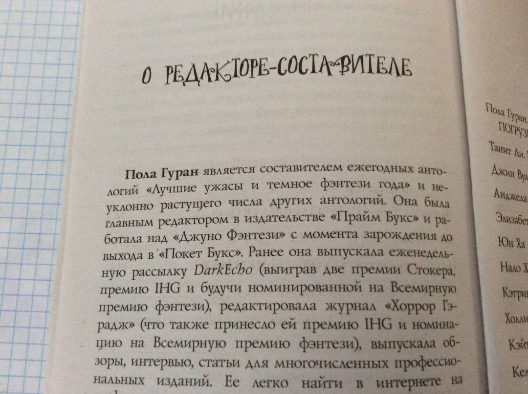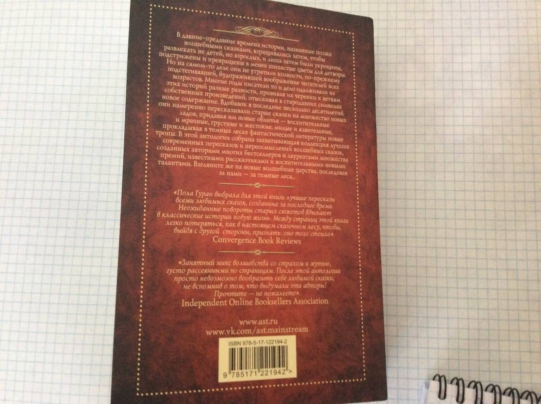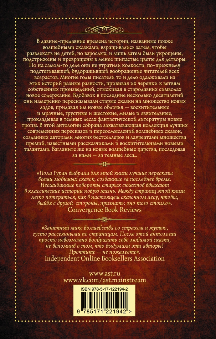 ОписаниеВ давние-предавние времена истории, названные позже «волшебными сказками», взращивались затем, чтобы развлекать не детей, но взрослых, и лишь затем были укрощены, подстрижены и превращены в менее шипастые цветы для детворы. Но на самом-то деле они не утратили колкости, по-прежнему подстегивавшей, будоражившей воображение читателей всех возрастов. Многие годы писатели то и дело одалживали из этих историй разные разности, прививая их черенки к ветвям собственных произведений, отыскивая в стародавних символах новое содержание. Вдобавок, в последние несколько десятилетий они намеренно пересказывали старые сказки на множество новых ладов, придавая им новые обличья — восхитительные и мрачные, грустные и жестокие, милые и язвительные, прокладывая в темных лесах фантастической литературы новые тропы. В этой антологии собрана захватывающая коллекция лучших современных пересказов и переосмыслений волшебных сказок, созданных авторами многих бестселлеров и лауреатами множества премий, известными рассказчиками и восхитительными новыми талантами. Взгляните же на новые волшебные царства, последовав за нами — за темные леса...Редактор-составитель Пола Гуран.СвернутьВ давние-предавние времена истории, названные позже «волшебными сказками», взращивались затем, чтобы развлекать не детей, но взрослых, и лишь затем были укрощены, подстрижены и превращены в менее шипастые цветы для детворы. Но на самом-то деле они не утратили колкости, по-прежнему подстегивавшей, будоражившей воображение читателей всех возрастов. Многие годы писатели то и дело одалживали из этих историй разные разности, прививая их черенки к ветвям собственных произведений, отыскивая в стародавних символах новое содержание. Вдобавок, в последние несколько десятилетий они намеренно пересказывали старые сказки на множество новых ладов, придавая им новые обличья — восхитительные и мрачные, грустные и жестокие, милые и язвительные, прокладывая в темных лесах фантастической литературы новые тропы. В этой антологии собрана захватывающая коллекция лучших современных пересказов и переосмыслений волшебных сказок, созданных авторами многих бестселлеров и лауреатами множества премий, известными рассказчиками и восхитительными новыми талантами. Взгляните же на новые волшебные царства, последовав за нами — за темные леса...Редактор-составитель Пола Гуран.СвернутьСвернуть