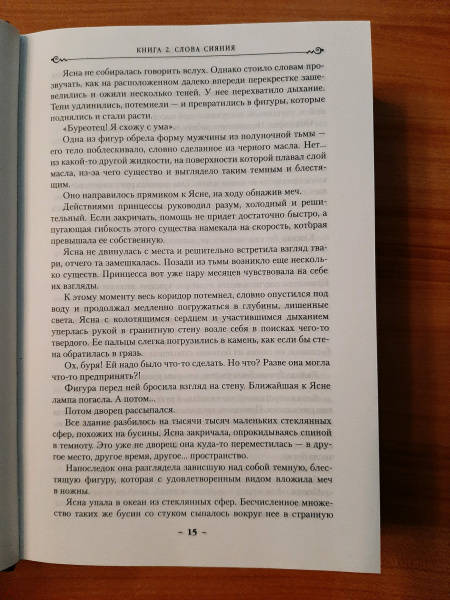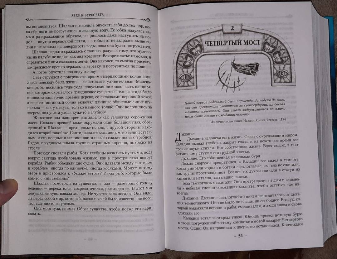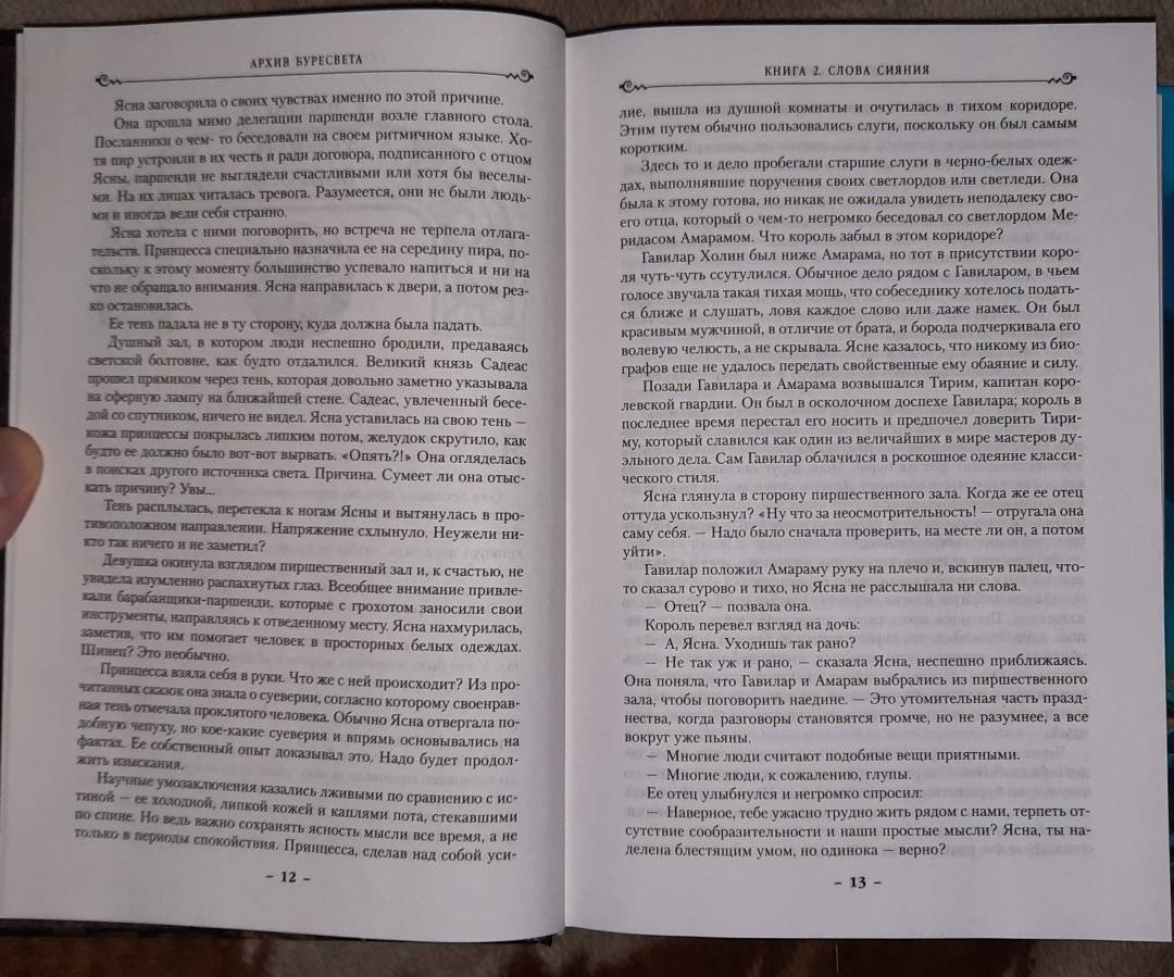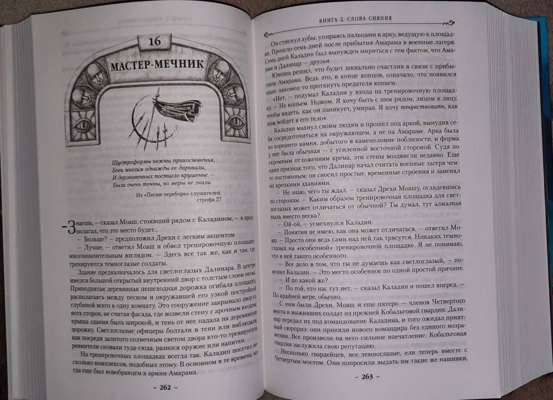 ОписаниеВопреки ожиданиям врагов Каладин Благословенный Бурей не умер рабом, но возглавил личную гвардию великого князя, и теперь на его плечах лежит обязанность защищать самого короля. Убийца в Белом вновь сеет смерть по всему Рошару, шаг за шагом приближаясь к главной цели - Далинару Холину. Шаллан Давар ставит перед собой самую амбициозную цель из всех возможных: предотвратить возвращение Приносящих пустоту, за которым должна последовать гибель всего мира. А в это время в сердце Расколотых равнин паршенди, уставшие от многолетней войны, делают роковой выбор и обращаются за помощью к той самой силе, от которой некогда бежали их предки. Выдержат ли герои новые испытания? Станут ли новыми Сияющими рыцарями?Над Рошаром сгущаются тени: до конца света осталось всего-навсего шестьдесят два дня.Вопреки ожиданиям врагов Каладин Благословенный Бурей не умер рабом, но возглавил личную гвардию великого князя, и теперь на его плечах лежит обязанность защищать самого короля. Убийца в Белом вновь сеет смерть по всему Рошару, шаг за шагом приближаясь к главной цели - Далинару Холину. Шаллан Давар ставит перед собой самую амбициозную цель из всех возможных: предотвратить возвращение Приносящих пустоту, за которым должна последовать гибель всего мира. А в это время в сердце Расколотых равнин паршенди, уставшие от многолетней войны, делают роковой выбор и обращаются за помощью к той самой силе, от которой некогда бежали их предки. Выдержат ли герои новые испытания? Станут ли новыми Сияющими рыцарями?Над Рошаром сгущаются тени: до конца света осталось всего-навсего шестьдесят два дня.
