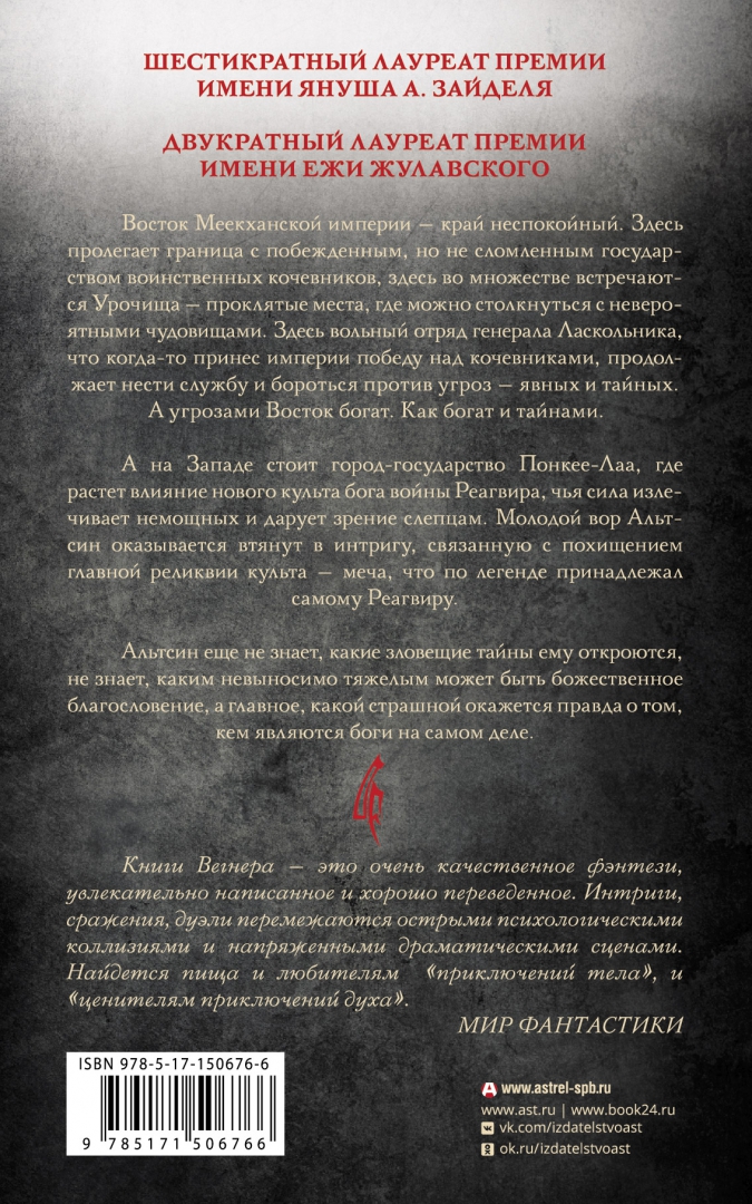 ОписаниеВосток Меекханской империи - край неспокойный. Здесь пролегает граница с побежденным, но не сломленным государством воинственных кочевников, здесь во множестве встречаются Урочища - проклятые места, где можно столкнуться с невероятными чудовищами. Здесь вольный отряд генерала Ласкольника, что когда-то принес империи победу над кочевниками, продолжает нести службу и бороться против угроз - явных и тайных. А угрозами Восток богат. Как богат и тайнами.А на Западе стоит город-государство Понкее-Лаа, где растет влияние нового культа бога войны Реагвира, чья сила излечивает немощных и дарует зрение слепцам. Молодой вор Альтсин оказывается втянут в интригу, связанную с похищением главной реликвии культа - меча, что по легенде принадлежал самому Реагвиру.Альтсин еще не знает, какие зловещие тайны ему откроются, не знает, каким невыносимо тяжелым может быть божественное благословение, а главное, какой страшной окажется правда о том, кем являются боги на самом деле.Книги Вегнера – это очень качественное фэнтези, увлекательно написанное и хорошо переведенное. Интриги, сражения, дуэли перемежаются острыми психологическими коллизиями и напряженными драматическими сценами. Найдется пища и любителям «приключений тела», и ценителям «приключений духа».