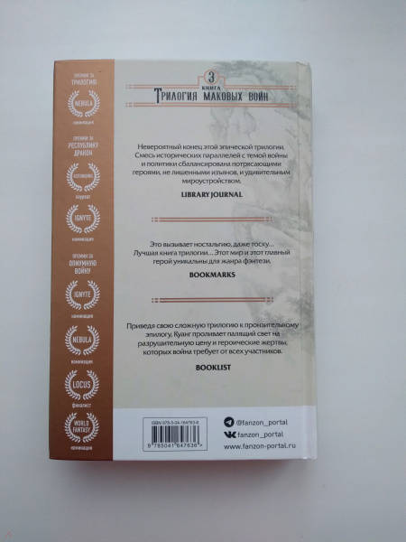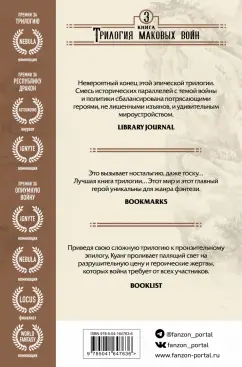 ОписаниеПремия "Astounding". Лучший новый автор. "Лучшая фантастика и фэнтези". Выбор редакции Amazon После кровавых сражений с остатками мугенской армии и союзниками гесперианцев, желающих присвоить никанские богатства, Рин снова остается ни с чем. Преданная и искалеченная, она бежит из Арлонга, чтобы собраться с силами и ударить по врагу. Но ее новые союзники в руководстве Южной коалиции лукавы и ненадежны, Рин быстро понимает, что настоящая сила в Никане - это миллионы простых людей, которые жаждут мести и почитают ее как богиню спасения. Однако по мере роста ее силы и влияния крепнет опьяняющий голос Феникса, призывающий ее сжечь весь мир. И противостоять ему все сложнее... Эффектное завершение трилогии "Опиумной войны", нашумевшего, отмеченного наградами эпического фэнтези Ребекки Куанг, которое сочетает в себе историю Китая как Средних веков, так и недавнего прошлого, с опасным миром богов и монстров. "Эта серия - просто чудо". - Виктория Шваб "Невероятный конец этой эпической трилогии. Смесь исторических параллелей с темой войны и политики сбалансирована потрясающими героями, не лишенными изъянов, и удивительным мироустройством". - Library Journal "Это вызывает ностальгию, даже тоску… "Пылающий бог" - лучшая книга трилогии… Этот мир и этот главный герой уникальны для жанра фэнтези". - Book Marks "Приведя свою сложную трилогию "Опиумной войны" к пронзительному эпилогу, Куанг проливает палящий свет на разрушительную цену и героические жертвы, которые война требует от всех участников". - BooklistСвернутьПремия "Astounding". Лучший новый автор. "Лучшая фантастика и фэнтези". Выбор редакции Amazon После кровавых сражений с остатками мугенской армии и союзниками гесперианцев, желающих присвоить никанские богатства, Рин снова остается ни с чем. Преданная и искалеченная, она бежит из Арлонга, чтобы собраться с силами и ударить по врагу. Но ее новые союзники в руководстве Южной коалиции лукавы и ненадежны, Рин быстро понимает, что настоящая сила в Никане - это миллионы простых людей, которые жаждут мести и почитают ее как богиню спасения. Однако по мере роста ее силы и влияния крепнет опьяняющий голос Феникса, призывающий ее сжечь весь мир. И противостоять ему все сложнее... Эффектное завершение трилогии "Опиумной войны", нашумевшего, отмеченного наградами эпического фэнтези Ребекки Куанг, которое сочетает в себе историю Китая как Средних веков, так и недавнего прошлого, с опасным миром богов и монстров. "Эта серия - просто чудо". - Виктория Шваб "Невероятный конец этой эпической трилогии. Смесь исторических параллелей с темой войны и политики сбалансирована потрясающими героями, не лишенными изъянов, и удивительным мироустройством". - Library Journal "Это вызывает ностальгию, даже тоску… "Пылающий бог" - лучшая книга трилогии… Этот мир и этот главный герой уникальны для жанра фэнтези". - Book Marks "Приведя свою сложную трилогию "Опиумной войны" к пронзительному эпилогу, Куанг проливает палящий свет на разрушительную цену и героические жертвы, которые война требует от всех участников". - BooklistСвернутьСвернуть