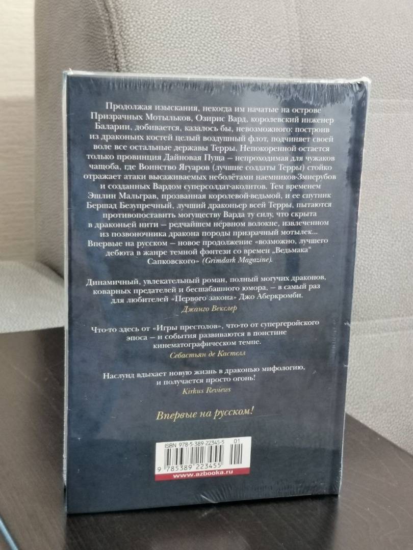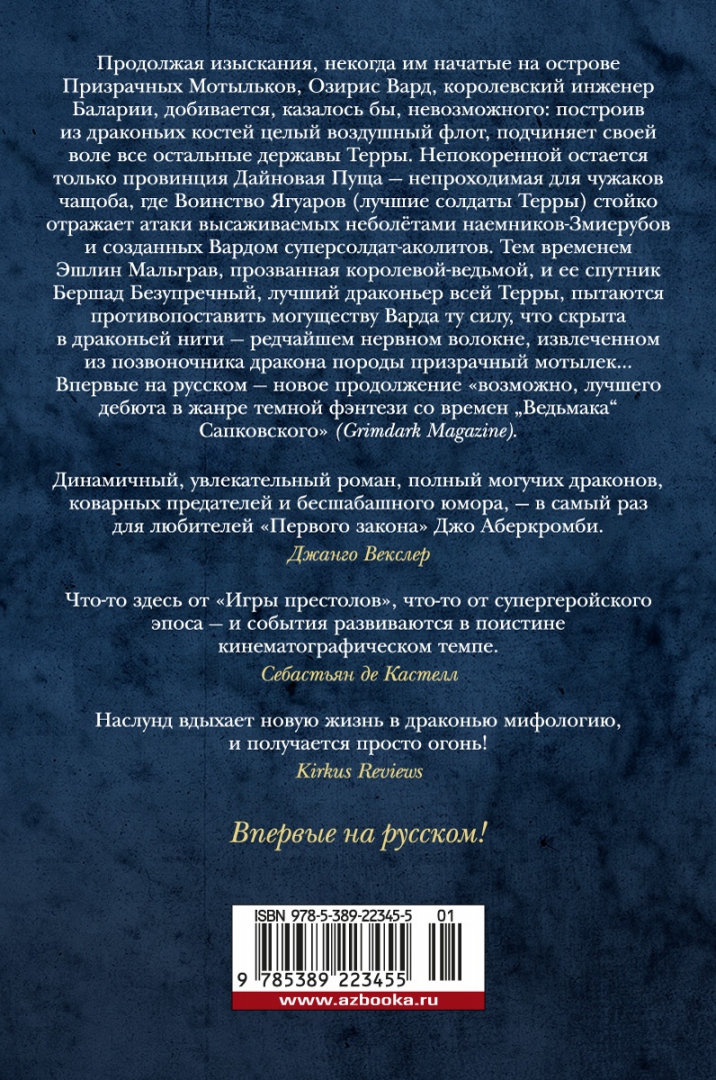 ОписаниеПродолжая изыскания, некогда им начатые на острове Призрачных Мотыльков, Озирис Вард, королевский инженер Баларии, добивается, казалось бы, невозможного: построив из драконьих костей целый воздушный флот, подчиняет своей воле все остальные державы Терры. Непокоренной остается только провинция Дайновая Пуща - непроходимая для чужаков чащоба, где Воинство Ягуаров (лучшие солдаты Терры) стойко отражает атаки высаживаемых неболётами наемников-Змиерубов и созданных Вардом суперсолдат-аколитов. Тем временем Эшлин Мальграв, прозванная королевой-ведьмой, и ее спутник Бершад Безупречный, лучший драконьер всей Терры, пытаются противопоставить могуществу Варда ту силу, что скрыта в драконьей нити - редчайшем нервном волокне, извлеченном из позвоночника дракона породы призрачный мотылек... Впервые на русском - новое продолжение "возможно, лучшего дебюта в жанре темной фэнтези со времен "Ведьмака" Сапковского" (Grimdark Magazine).Продолжая изыскания, некогда им начатые на острове Призрачных Мотыльков, Озирис Вард, королевский инженер Баларии, добивается, казалось бы, невозможного: построив из драконьих костей целый воздушный флот, подчиняет своей воле все остальные державы Терры. Непокоренной остается только провинция Дайновая Пуща - непроходимая для чужаков чащоба, где Воинство Ягуаров (лучшие солдаты Терры) стойко отражает атаки высаживаемых неболётами наемников-Змиерубов и созданных Вардом суперсолдат-аколитов. Тем временем Эшлин Мальграв, прозванная королевой-ведьмой, и ее спутник Бершад Безупречный, лучший драконьер всей Терры, пытаются противопоставить могуществу Варда ту силу, что скрыта в драконьей нити - редчайшем нервном волокне, извлеченном из позвоночника дракона породы призрачный мотылек... Впервые на русском - новое продолжение "возможно, лучшего дебюта в жанре темной фэнтези со времен "Ведьмака" Сапковского" (Grimdark Magazine).