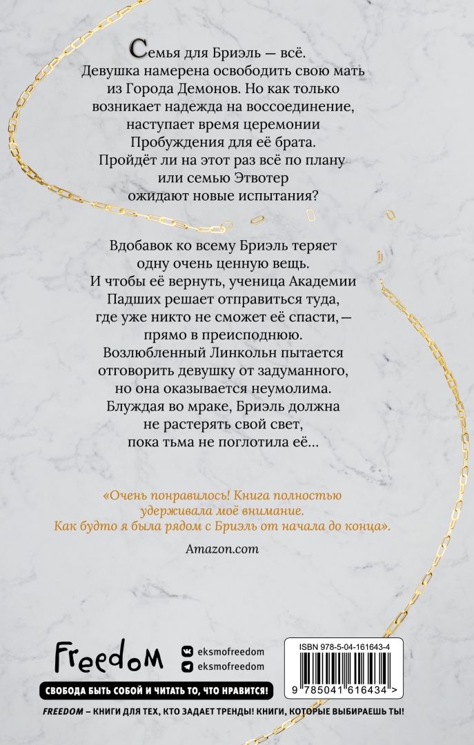 ОписаниеДля тех, кому понравились "Ангельская сага" Мары Вульф и "Изара" Юлии Диппель! Совершенно новая история об ангелах и демонах, действие которой происходит на территории современного Лос-Анджелеса!Серия была продана суммарным тиражом более 500 000 экземпляров. Готовится экранизация!Семья для Бриэль - всё. Девушка намерена освободить свою мать из Города Демонов. Но как только возникает надежда на воссоединение, наступает время церемонии Пробуждения для её брата. Пройдёт ли на этот раз все по плану, или семью Этвотер ожидают новые испытания?Вдобавок ко всему Бриэль теряет одну очень ценную вещь. И чтобы её вернуть, ученица Академии Падших решает отправиться туда, где уже никто не сможет её спасти, - прямо в преисподнюю. Возлюбленный Линкольн пытается отговорить девушку от задуманного плана, но она оказывается неумолима. Блуждая во мраке, Бриэль должна не растерять свой свет, пока тьма не поглотила её…Для тех, кому понравились "Ангельская сага" Мары Вульф и "Изара" Юлии Диппель! Совершенно новая история об ангелах и демонах, действие которой происходит на территории современного Лос-Анджелеса!Серия была продана суммарным тиражом более 500 000 экземпляров. Готовится экранизация!Семья для Бриэль - всё. Девушка намерена освободить свою мать из Города Демонов. Но как только возникает надежда на воссоединение, наступает время церемонии Пробуждения для её брата. Пройдёт ли на этот раз все по плану, или семью Этвотер ожидают новые испытания?Вдобавок ко всему Бриэль теряет одну очень ценную вещь. И чтобы её вернуть, ученица Академии Падших решает отправиться туда, где уже никто не сможет её спасти, - прямо в преисподнюю. Возлюбленный Линкольн пытается отговорить девушку от задуманного плана, но она оказывается неумолима. Блуждая во мраке, Бриэль должна не растерять свой свет, пока тьма не поглотила её…