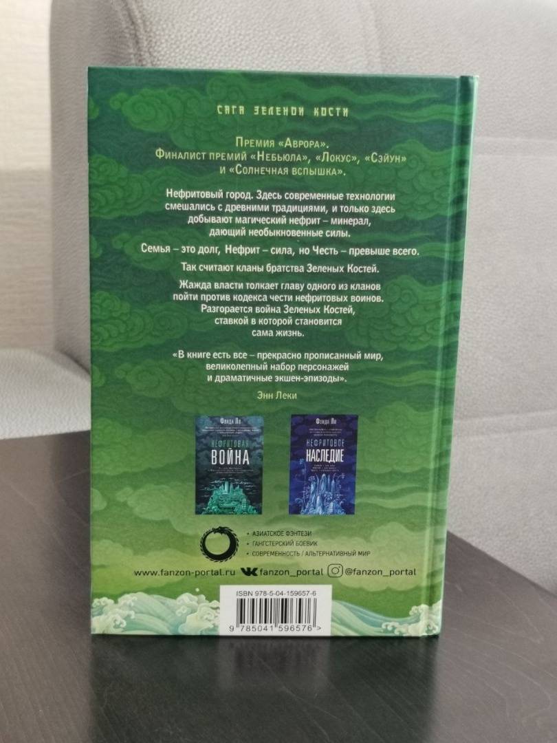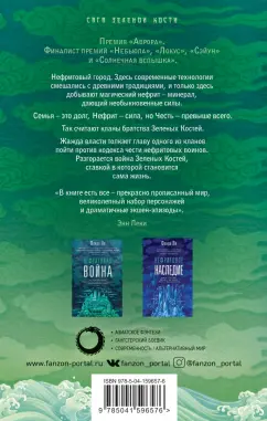 ОписаниеФиналист премий: "Небьюла", 2017 - Лучший роман; "Локус", 2018 - Лучший роман-фэнтези. Нефритовый город. Только здесь современные технологии смешались с древними традициями, и только здесь добывают магический нефрит - минерал, дающий необыкновенные силы. Семья - это долг, Нефрит - сила, но Честь - превыше всего. Так считает братство Зеленых Костей, разделенное на кланы. Жажда власти толкает главу одного из кланов пойти против кодекса чести нефритовых воинов. Ответ не заставит себя ждать. Когда воюют Зеленые Кости, остаться в стороне не получится, и ставкой в сражении будет уже не зеленый камешек, а жизнь. "Стильная и наполненная действием... эпическая драма, напоминающая лучшие классические гонконгские гангстерские фильмы, но в фэнтезийном мегаполисе". - Кен ЛюФиналист премий: "Небьюла", 2017 - Лучший роман; "Локус", 2018 - Лучший роман-фэнтези. Нефритовый город. Только здесь современные технологии смешались с древними традициями, и только здесь добывают магический нефрит - минерал, дающий необыкновенные силы. Семья - это долг, Нефрит - сила, но Честь - превыше всего. Так считает братство Зеленых Костей, разделенное на кланы. Жажда власти толкает главу одного из кланов пойти против кодекса чести нефритовых воинов. Ответ не заставит себя ждать. Когда воюют Зеленые Кости, остаться в стороне не получится, и ставкой в сражении будет уже не зеленый камешек, а жизнь. "Стильная и наполненная действием... эпическая драма, напоминающая лучшие классические гонконгские гангстерские фильмы, но в фэнтезийном мегаполисе". - Кен Лю