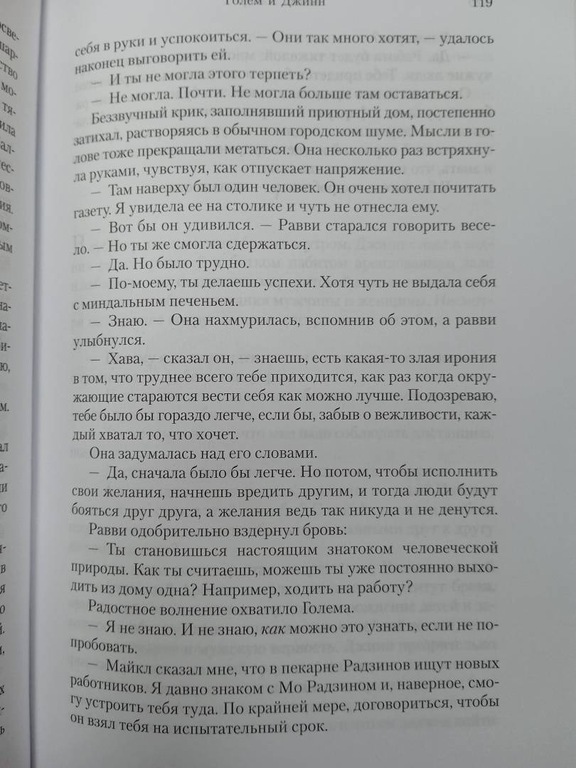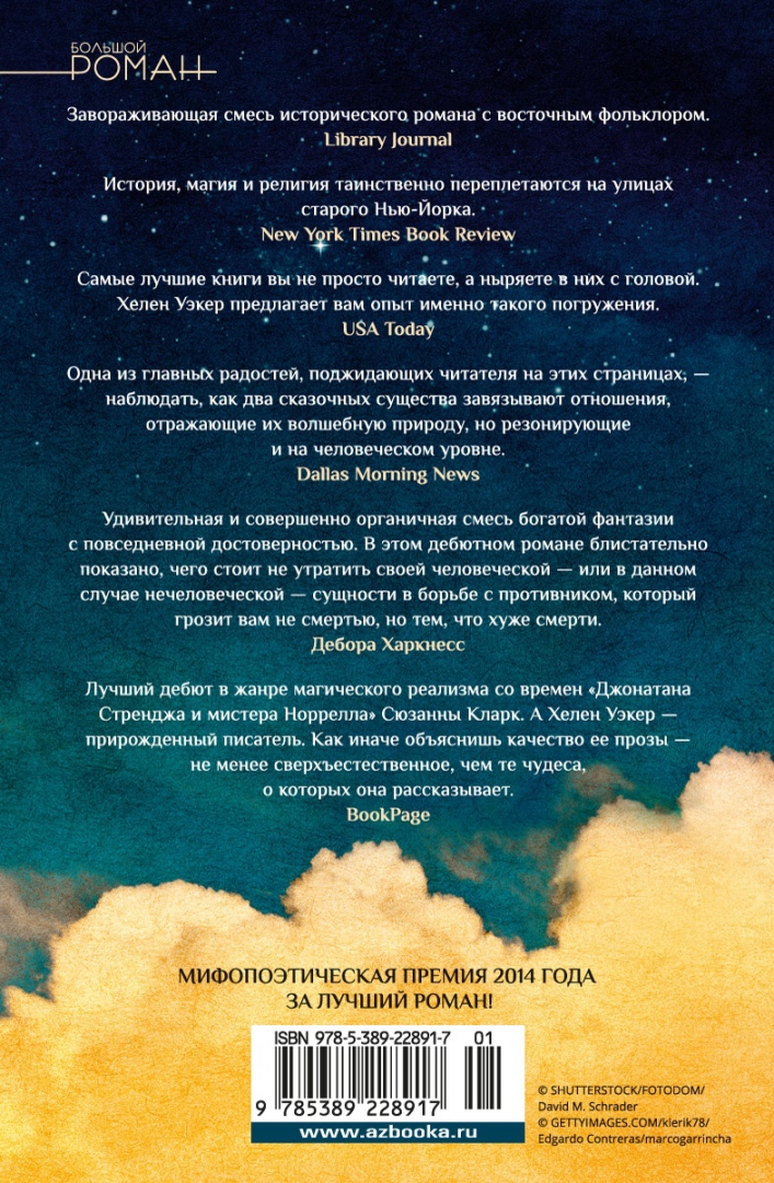 ОписаниеТрудно быть чужим среди людей, еще труднее быть чужеродным. Как освоиться в незнакомой стране, как преодолеть непонимание, одиночество и страх, как найти свой путь, начать новую жизнь?.. В 1899 году в Нью-Йорке оказываются два мифических существа. Голем, созданный из глины в женском облике, призван верно служить хозяину, но теряет его по дороге в Америку, и внезапная свобода оборачивается сущим мучением. Джинна после тысячелетнего заточения случайно выпускает на волю жестянщик из нью-йоркского района Маленькая Сирия. Могущественный дух пустыни, напрочь забывший прошлое, предшествовавшее его пленению, бессилен в человеческом теле и мечтает вырваться из этих оков. Ожившие персонажи древних преданий очень одиноки, но однажды ночью посреди опустевшего города их пути пересекутся... «Голем и Джинн» представляет собой «метафорическую автобиографию» — по признанию автора, роман основан на ее личной истории и она вдохновлялась сходством между двумя семьями, принадлежащими к различным культурным традициям. В 2014 году книга была удостоена Мифопоэтической премии за лучший роман.СвернутьТрудно быть чужим среди людей, еще труднее быть чужеродным. Как освоиться в незнакомой стране, как преодолеть непонимание, одиночество и страх, как найти свой путь, начать новую жизнь?.. В 1899 году в Нью-Йорке оказываются два мифических существа. Голем, созданный из глины в женском облике, призван верно служить хозяину, но теряет его по дороге в Америку, и внезапная свобода оборачивается сущим мучением. Джинна после тысячелетнего заточения случайно выпускает на волю жестянщик из нью-йоркского района Маленькая Сирия. Могущественный дух пустыни, напрочь забывший прошлое, предшествовавшее его пленению, бессилен в человеческом теле и мечтает вырваться из этих оков. Ожившие персонажи древних преданий очень одиноки, но однажды ночью посреди опустевшего города их пути пересекутся... «Голем и Джинн» представляет собой «метафорическую автобиографию» — по признанию автора, роман основан на ее личной истории и она вдохновлялась сходством между двумя семьями, принадлежащими к различным культурным традициям. В 2014 году книга была удостоена Мифопоэтической премии за лучший роман.СвернутьСвернуть