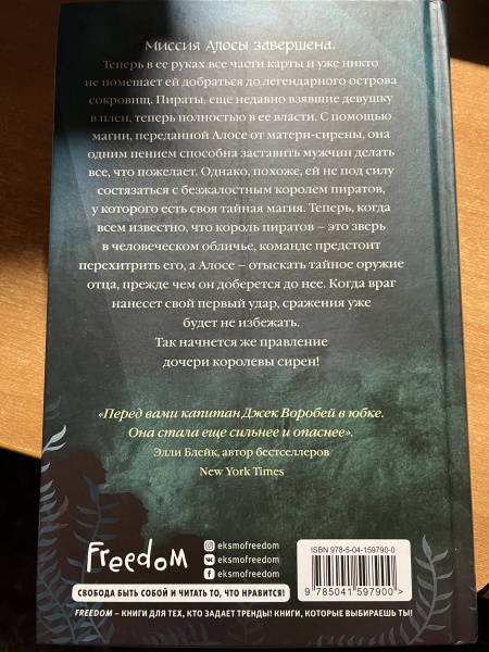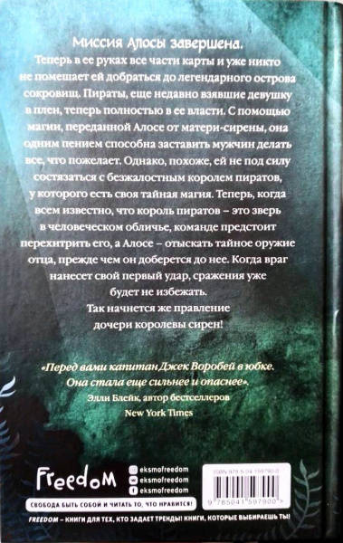 ОписаниеТриша Левенселлер - американская писательница, автор романа "Тени между нами", который стал бестселлером Amazon в разделе "Фэнтези YA". "Дочь королевы сирен" - вторая часть дебютного романа писательницы "Дочь короля пиратов", получившего почти 4 тыс. отзывов на Amazon и подаривший ей всемирную известность. Дилогия вышла в пяти странах!Сильная, уверенная и безжалостная Алоса возвращается в открытое море, чтобы отправиться в новое захватывающее приключение.Все готово к тому, чтобы отправиться к легендарному острову сокровищ, ведь на руках у Алосы все части карты. Но никто еще не догадывается, с какими испытаниями всем предстоит столкнуться и от кого придется бежать. Все героини Триши дерзкие, отважные и беспринципные. Их не всегда можно назвать положительными, но это и делает их такими интересными. Они в одиночку способны противостоять врагам, защитить себя и выиграть сражение. "Триша Левенселлер вновь приглашает вас в увлекательное романтическое и опасное путешествие по морским волнам". - Amazon.com Миссия Алосы завершена. Теперь в ее руках все части карты, и уже никто не помешает ей добраться до легендарного острова сокровищ. Пираты, еще недавно взявшие девушку в плен, теперь полностью в ее власти. С помощью магии, переданной Алосе от матери-сирены, она одним пением способна заставить мужчин делать всё, что пожелает. Однако, похоже, ей не под силу состязаться с безжалостным королем пиратов, у которого есть своя тайная магия. Теперь, когда всем известно, что король пиратов - это зверь в человеческом обличье, способный предать родную дочь и добраться до острова Канта любой ценой, команде предстоит перехитрить его, а Алосе - отыскать тайное оружие отца прежде, чем он доберется до нее. Когда враг нанесет свой первый удар, сражения уже будет не избежать. Так начнется же правление дочери королевы сирен!СвернутьТриша Левенселлер - американская писательница, автор романа "Тени между нами", который стал бестселлером Amazon в разделе "Фэнтези YA". "Дочь королевы сирен" - вторая часть дебютного романа писательницы "Дочь короля пиратов", получившего почти 4 тыс. отзывов на Amazon и подаривший ей всемирную известность. Дилогия вышла в пяти странах!Сильная, уверенная и безжалостная Алоса возвращается в открытое море, чтобы отправиться в новое захватывающее приключение.Все готово к тому, чтобы отправиться к легендарному острову сокровищ, ведь на руках у Алосы все части карты. Но никто еще не догадывается, с какими испытаниями всем предстоит столкнуться и от кого придется бежать. Все героини Триши дерзкие, отважные и беспринципные. Их не всегда можно назвать положительными, но это и делает их такими интересными. Они в одиночку способны противостоять врагам, защитить себя и выиграть сражение. "Триша Левенселлер вновь приглашает вас в увлекательное романтическое и опасное путешествие по морским волнам". - Amazon.com Миссия Алосы завершена. Теперь в ее руках все части карты, и уже никто не помешает ей добраться до легендарного острова сокровищ. Пираты, еще недавно взявшие девушку в плен, теперь полностью в ее власти. С помощью магии, переданной Алосе от матери-сирены, она одним пением способна заставить мужчин делать всё, что пожелает. Однако, похоже, ей не под силу состязаться с безжалостным королем пиратов, у которого есть своя тайная магия. Теперь, когда всем известно