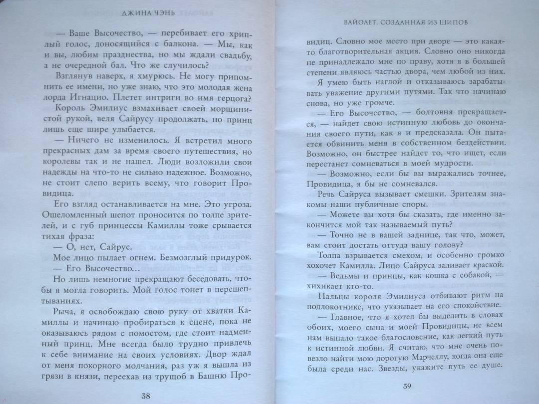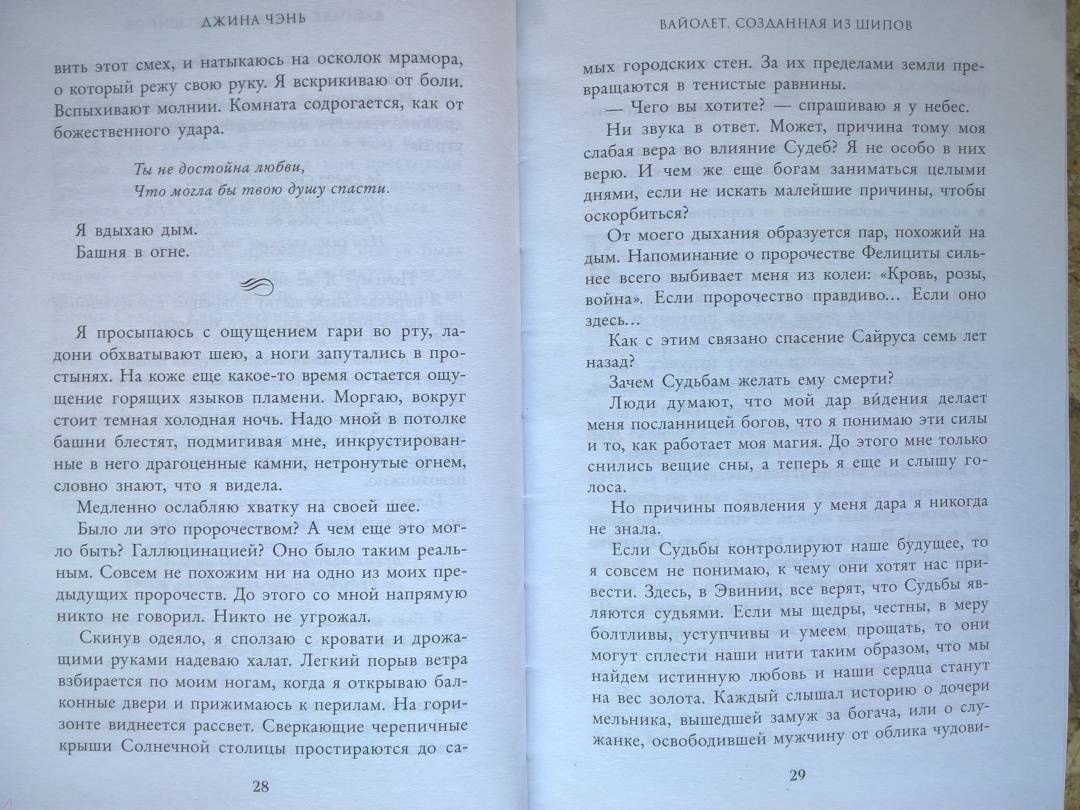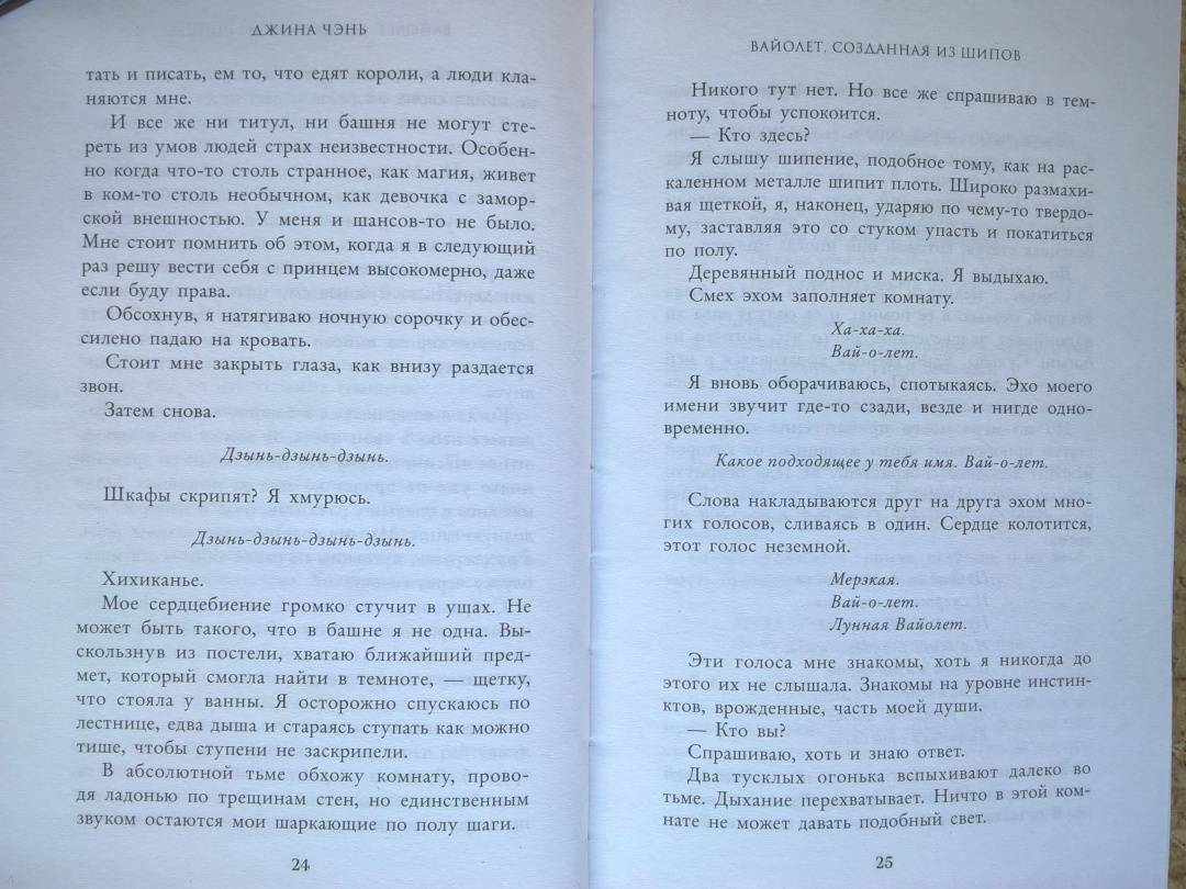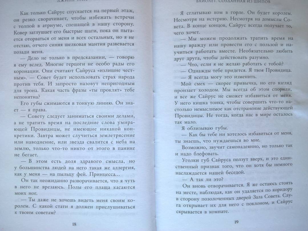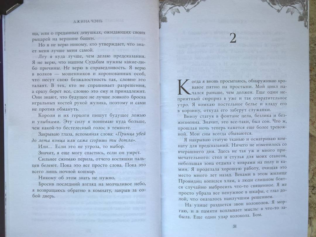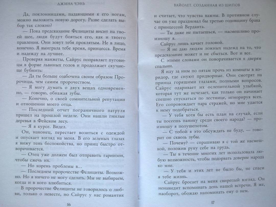 ОписаниеЧарующее фэнтези о злой ведьме, проклятом принце и зловещем пророчестве. Идеально подходит для поклонников «Жестокого принца» Холли Блэк и «Змея и голубки» Шелби Махёрин! История про девушку, которая обладает даром прорицания! Ее видения или спасут королевство, или погубят… Таинственные предсказания, ведьмы и магия, которая уколет в самое сердце! Вайолет — предсказательница. Но никто не знает, что ее пророчества сплошная ложь. С давних пор правитель использует дар Вайолет, чтобы манипулировать жителями государства. Девушку не волнует судьба других людей. Честность придумана для простаков вроде принца Сайруса, который планирует стать новым королем. Но после коронации и без того шаткая репутация Вайолет окажется под угрозой, если девушка срочно не придумает хитроумный план. Коварство Вайолет всегда помогало ей, но изменить судьбу оно не может. Разрываясь между ненавистью и любовью к принцу, девушка должна распутать паутину обмана, чтобы спасти себя и королевство или обречь всех на смерть. «Захватывает от начала и до конца. Вайолет — уникальная главная героиня, а Джина Чэнь создала непревзойденную историю, от которой читатели будут задыхаться и визжать по очереди». — Джоан Хэ, автор бестселлера New York Times «Наследница журавля» «Чэнь создала восхитительную, блистательную историю об остроумной антигероине, за которую читатели будут болеть с первой страницы». — Джун Ч. Л. Тан, автор книги «Нефрит. Огонь. Золото»СвернутьЧарующее фэнтези о злой ведьме, проклятом принце и зловещем пророчестве. Идеально подходит для поклонников «Жестокого принца» Холли Блэк и «Змея и голубки» Шелби Махёрин! История про девушку, которая обладает даром прорицания! Ее видения или спасут королевство, или погубят… Таинственные предсказания, ведьмы и магия, которая уколет в самое сердце! Вайолет — предсказательница. Но никто не знает, что ее пророчества сплошная ложь. С давних пор правитель использует дар Вайолет, чтобы манипулировать жителями государства. Девушку не волнует судьба других людей. Честность придумана для простаков вроде принца Сайруса, который планирует стать новым королем. Но после коронации и без того шаткая репутация Вайолет окажется под угрозой, если девушка срочно не придумает хитроумный план. Коварство Вайолет всегда помогало ей, но изменить судьбу оно не может. Разрываясь между ненавистью и любовью к принцу, девушка должна распутать паутину обмана, чтобы спасти себя и королевство или обречь всех на смерть. «Захватывает от начала и до конца. Вайолет — уникальная главная героиня, а Джина Чэнь создала непревзойденную историю, от которой читатели будут задыхаться и визжать по очереди». — Джоан Хэ, автор бестселлера New York Times «Наследница журавля» «Чэнь создала восхитительную, блистательную историю об остроумной антигероине, за которую читатели будут болеть с первой страницы». — Джун Ч. Л. Тан, автор книги «Нефрит. Огонь. Золото»СвернутьСвернуть