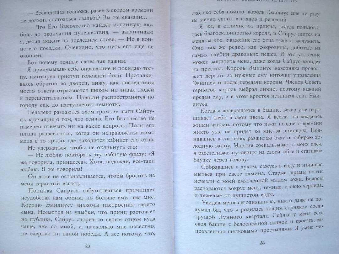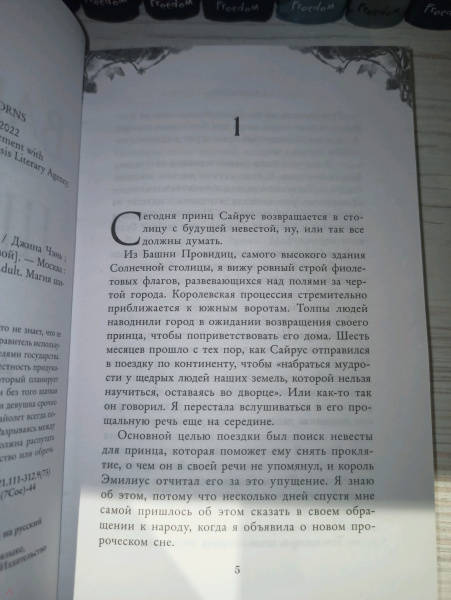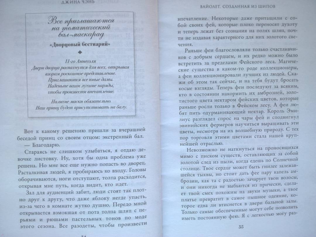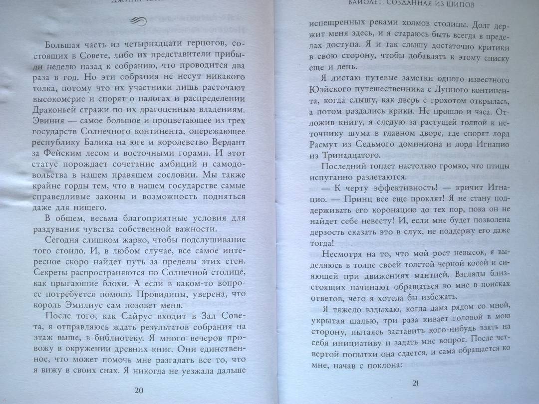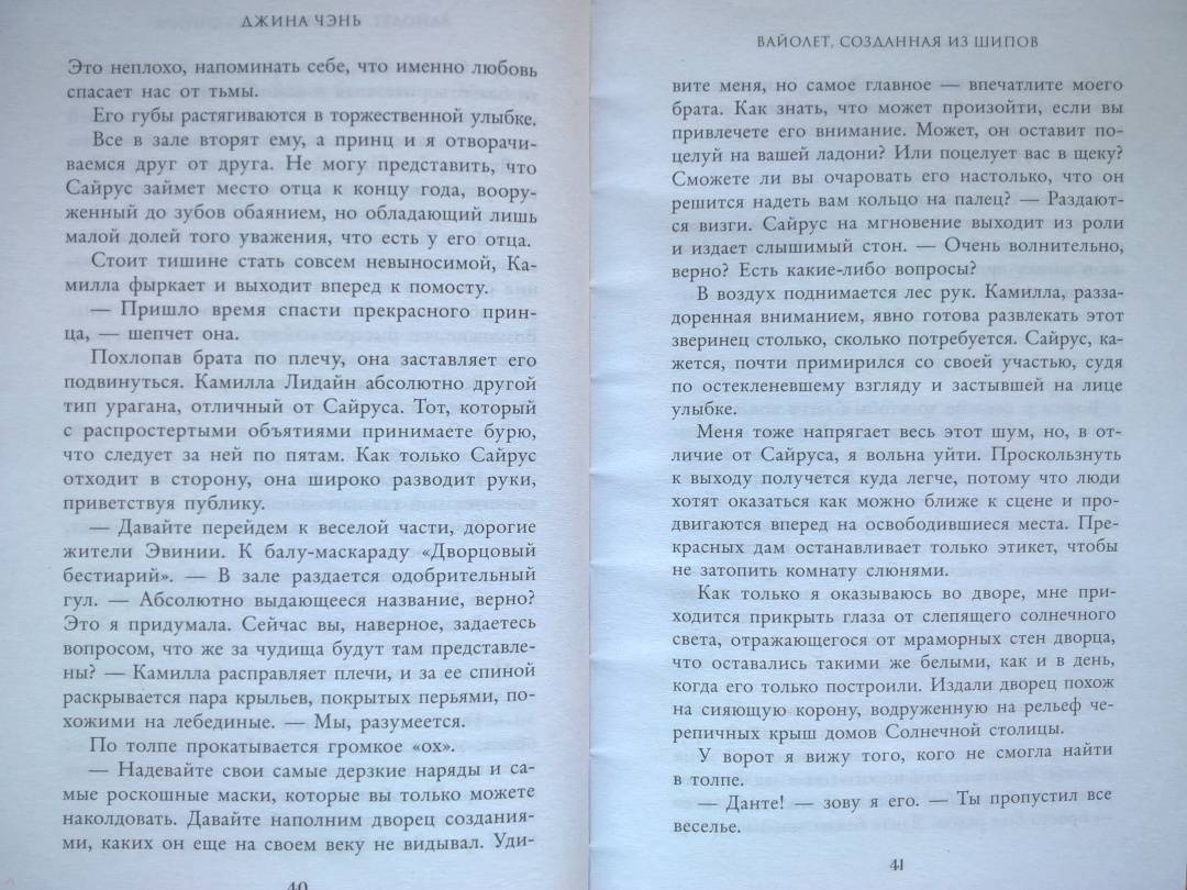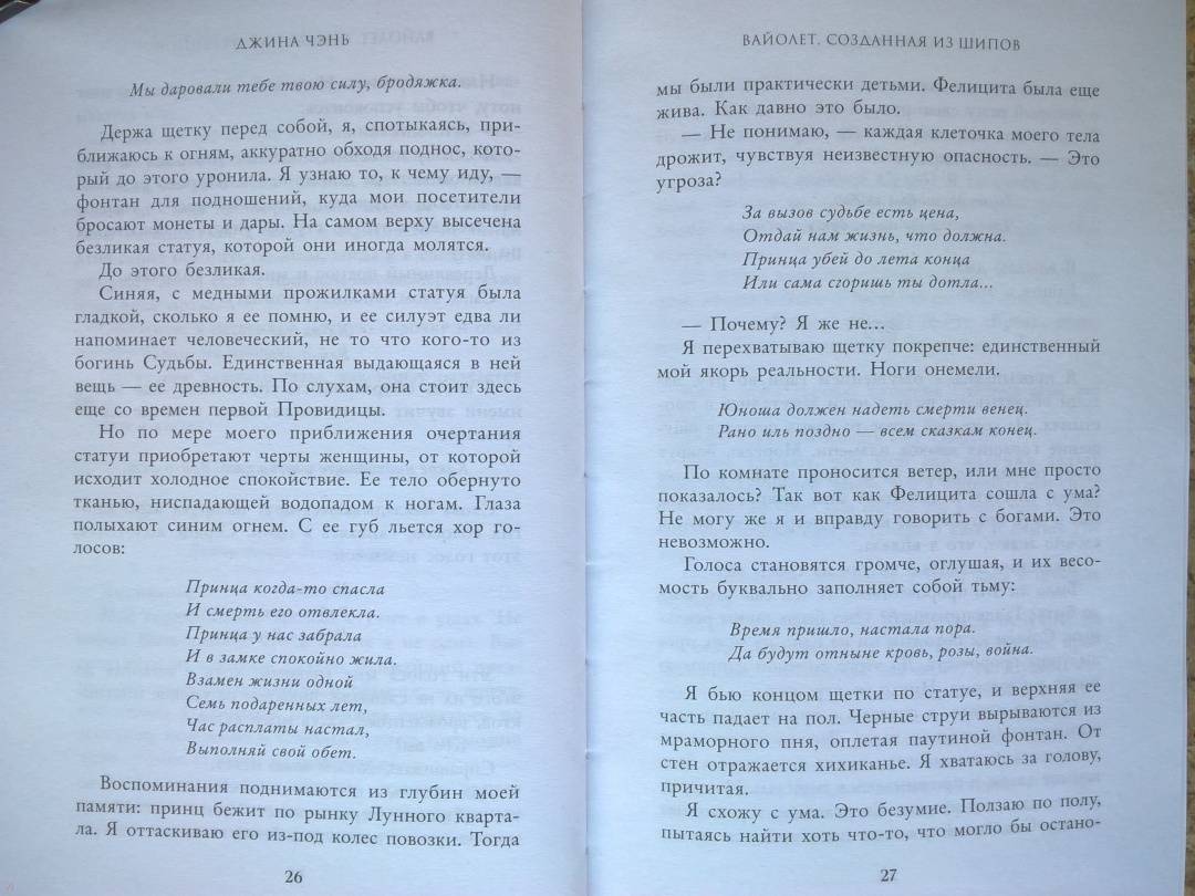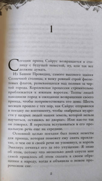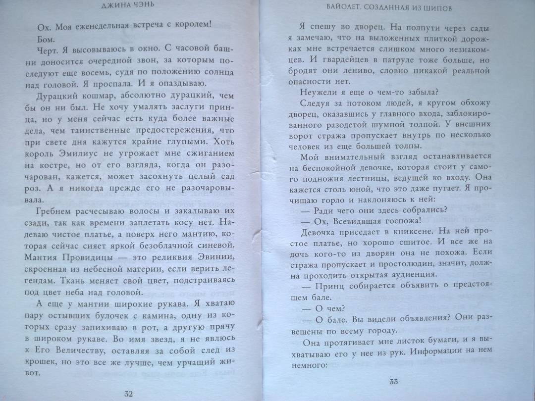 ОписаниеЧарующее фэнтези о злой ведьме, проклятом принце и зловещем пророчестве. Идеально подходит для поклонников «Жестокого принца» Холли Блэк и «Змея и голубки» Шелби Махёрин! История про девушку, которая обладает даром прорицания! Ее видения или спасут королевство, или погубят… Таинственные предсказания, ведьмы и магия, которая уколет в самое сердце! Вайолет — предсказательница. Но никто не знает, что ее пророчества сплошная ложь. С давних пор правитель использует дар Вайолет, чтобы манипулировать жителями государства. Девушку не волнует судьба других людей. Честность придумана для простаков вроде принца Сайруса, который планирует стать новым королем. Но после коронации и без того шаткая репутация Вайолет окажется под угрозой, если девушка срочно не придумает хитроумный план. Коварство Вайолет всегда помогало ей, но изменить судьбу оно не может. Разрываясь между ненавистью и любовью к принцу, девушка должна распутать паутину обмана, чтобы спасти себя и королевство или обречь всех на смерть. «Захватывает от начала и до конца. Вайолет — уникальная главная героиня, а Джина Чэнь создала непревзойденную историю, от которой читатели будут задыхаться и визжать по очереди». — Джоан Хэ, автор бестселлера New York Times «Наследница журавля» «Чэнь создала восхитительную, блистательную историю об остроумной антигероине, за которую читатели будут болеть с первой страницы». — Джун Ч. Л. Тан, автор книги «Нефрит. Огонь. Золото»СвернутьЧарующее фэнтези о злой ведьме, проклятом принце и зловещем пророчестве. Идеально подходит для поклонников «Жестокого принца» Холли Блэк и «Змея и голубки» Шелби Махёрин! История про девушку, которая обладает даром прорицания! Ее видения или спасут королевство, или погубят… Таинственные предсказания, ведьмы и магия, которая уколет в самое сердце! Вайолет — предсказательница. Но никто не знает, что ее пророчества сплошная ложь. С давних пор правитель использует дар Вайолет, чтобы манипулировать жителями государства. Девушку не волнует судьба других людей. Честность придумана для простаков вроде принца Сайруса, который планирует стать новым королем. Но после коронации и без того шаткая репутация Вайолет окажется под угрозой, если девушка срочно не придумает хитроумный план. Коварство Вайолет всегда помогало ей, но изменить судьбу оно не может. Разрываясь между ненавистью и любовью к принцу, девушка должна распутать паутину обмана, чтобы спасти себя и королевство или обречь всех на смерть. «Захватывает от начала и до конца. Вайолет — уникальная главная героиня, а Джина Чэнь создала непревзойденную историю, от которой читатели будут задыхаться и визжать по очереди». — Джоан Хэ, автор бестселлера New York Times «Наследница журавля» «Чэнь создала восхитительную, блистательную историю об остроумной антигероине, за которую читатели будут болеть с первой страницы». — Джун Ч. Л. Тан, автор книги «Нефрит. Огонь. Золото»СвернутьСвернуть