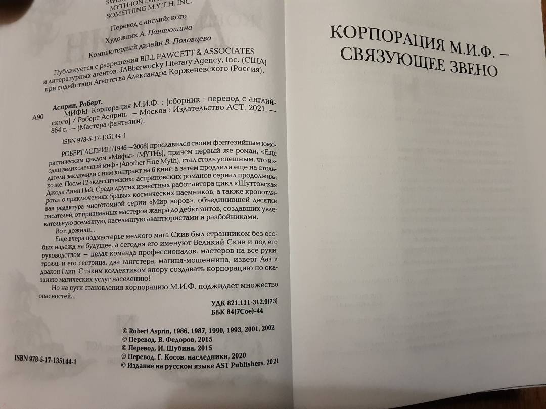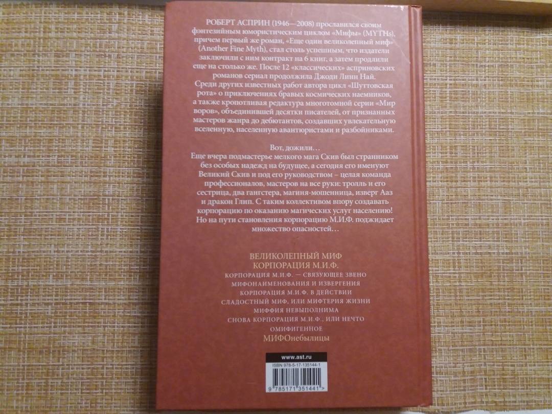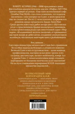 ОписаниеРоберт Асприн (1946-2008) прославился своим фэнтезийным юмористическим циклом "Мифы" (MYTHs), причем первый же роман, "Еще один великолепный миф" (Another Fine Myth), стал столь успешным, что издатели заключили с ним контракт на 6 книг, а затем продлили еще на столько же. После 12 "классических" асприновских романов сериал продолжила Джоди Линн Най. Среди других известных работ автора цикл "Шуттовская рота" о приключениях бравых космических наемников, а также кропотливая редактура многотомной серии "Мир воров", объединившей десятки писателей, от признанных мастеров жанра до дебютантов, создавших увлекательную вселенную, населенную авантюристами и разбойниками. Вот, дожили…Еще вчера подмастерье мелкого мага Скив был странником без особых надежд на будущее, а сегодня его именуют Великий Скив и под его руководством - целая команда профессионалов, мастеров на все руки: тролль и его сестрица, два гангстера, магиня-мошенница, изверг Ааз и дракон Глип. С таким коллективом впору создавать корпорацию по оказанию магических услуг населению!Но на пути становления корпорацию М.И.Ф. поджидает множество опасностей…СвернутьРоберт Асприн (1946-2008) прославился своим фэнтезийным юмористическим циклом "Мифы" (MYTHs), причем первый же роман, "Еще один великолепный миф" (Another Fine Myth), стал столь успешным, что издатели заключили с ним контракт на 6 книг, а затем продлили еще на столько же. После 12 "классических" асприновских романов сериал продолжила Джоди Линн Най. Среди других известных работ автора цикл "Шуттовская рота" о приключениях бравых космических наемников, а также кропотливая редактура многотомной серии "Мир воров", объединившей десятки писателей, от признанных мастеров жанра до дебютантов, создавших увлекательную вселенную, населенную авантюристами и разбойниками. Вот, дожили…Еще вчера подмастерье мелкого мага Скив был странником без особых надежд на будущее, а сегодня его именуют Великий Скив и под его руководством - целая команда профессионалов, мастеров на все руки: тролль и его сестрица, два гангстера, магиня-мошенница, изверг Ааз и дракон Глип. С таким коллективом впору создавать корпорацию по оказанию магических услуг населению!Но на пути становления корпорацию М.И.Ф. поджидает множество опасностей…СвернутьСвернуть