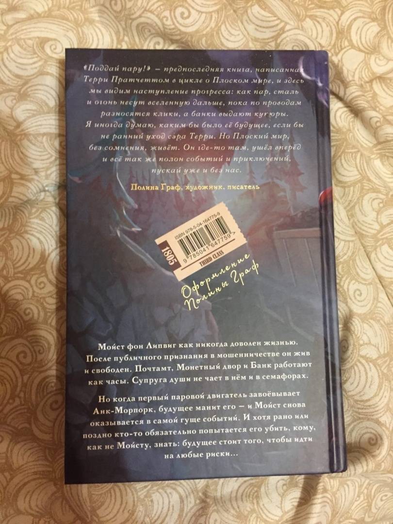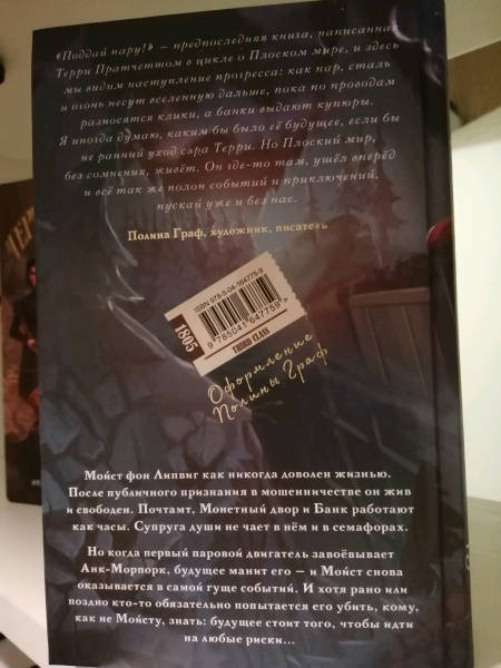 ОписаниеМойст фон Липвиг как никогда доволен жизнью. После публичного признания в мошенничестве он жив и свободен. Почтамт, Монетный двор и Банк работают как часы. Супруга души не чает в нём и в семафорах.Но когда первый паровой двигатель завоёвывает Анк-Морпорк, будущее манит его - и Мойст снова оказывается в самой гуще событий. И хотя рано или поздно кто-то обязательно попытается его убить, кому как не Мойсту знать: будущее стоит того, чтобы идти на любые риски...Третья и заключительная книга о приключениях обаятельного мошенника Мойста фон Липвига. Переиздание знаменитого цикла "Плоский мир" сэра Терри Пратчетта, который стал легендой и классиком еще при жизни. Оформление суперпопулярной в России художницы и писательницы Полины Граф. Внутри эскизы персонажей и сюжетных сцен, рельсы, строящиеся на страницах, портрет автора и дополнительная цветная иллюстрация.Мойст фон Липвиг как никогда доволен жизнью. После публичного признания в мошенничестве он жив и свободен. Почтамт, Монетный двор и Банк работают как часы. Супруга души не чает в нём и в семафорах.Но когда первый паровой двигатель завоёвывает Анк-Морпорк, будущее манит его - и Мойст снова оказывается в самой гуще событий. И хотя рано или поздно кто-то обязательно попытается его убить, кому как не Мойсту знать: будущее стоит того, чтобы идти на любые риски...Третья и заключительная книга о приключениях обаятельного мошенника Мойста фон Липвига. Переиздание знаменитого цикла "Плоский мир" сэра Терри Пратчетта, который стал легендой и классиком еще при жизни. Оформление суперпопулярной в России художницы и писательницы Полины Граф. Внутри эскизы персонажей и сюжетных сцен, рельсы, строящиеся на страницах, портрет автора и дополнительная цветная иллюстрация.