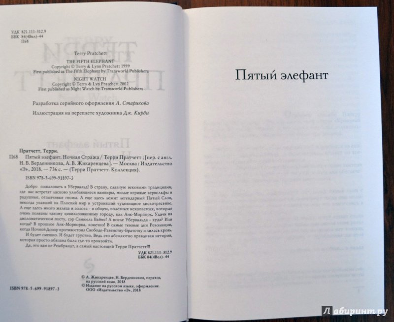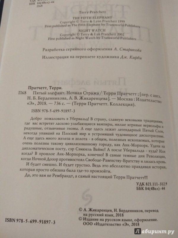 ОписаниеДобро пожаловать в Убервальд! В страну, славную вековыми традициями, где вас встретят ласково улыбающиеся вампиры, милые игривые вервольфы и радушные, отзывчивые гномы. А еще здесь лежит легендарный Пятый Слон, некогда упавший на Плоский мир и устроивший чудовищное дискотрясение. А еще здесь много железа и золота - в общем, полезных ископаемых, которые очень полезны такому цивилизованному городу, как Анк-Морпорк. Удачи на дипломатическом посту, сэр Сэмюель Ваймс! А после Убервальда - куда? Или когда? В прошлое Анк-Морпорка, конечно! В самые темные дни Революции, когда Ночной Дозор противостоял Свободе-Равенству-Братству и лилась кровь.И будет смешно. И будет грустно. Ведь это абсолютно правдивая история, которая просто обязана была где-то произойти.Да, это вам не Рембрандт, а самый настоящий Терри Пратчетт!!!Добро пожаловать в Убервальд! В страну, славную вековыми традициями, где вас встретят ласково улыбающиеся вампиры, милые игривые вервольфы и радушные, отзывчивые гномы. А еще здесь лежит легендарный Пятый Слон, некогда упавший на Плоский мир и устроивший чудовищное дискотрясение. А еще здесь много железа и золота - в общем, полезных ископаемых, которые очень полезны такому цивилизованному городу, как Анк-Морпорк. Удачи на дипломатическом посту, сэр Сэмюель Ваймс! А после Убервальда - куда? Или когда? В прошлое Анк-Морпорка, конечно! В самые темные дни Революции, когда Ночной Дозор противостоял Свободе-Равенству-Братству и лилась кровь.И будет смешно. И будет грустно. Ведь это абсолютно правдивая история, которая просто обязана была где-то произойти.Да, это вам не Рембрандт, а самый настоящий Терри Пратчетт!!!