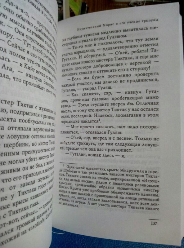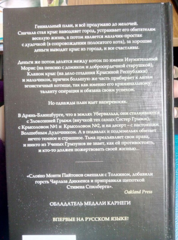 ОписаниеГениальный план и всё продумано до мелочей. Сначала стая крыс наводняет город, устраивает его обитателям веселую жизнь, а потом является мальчик-простак с дудочкой (в сопровождении полосатого кота), за хорошие деньги выводит крыс из города, и все счастливы. Деньги же потом делятся между котом по имени Изумительный Морис (на пенсию с домиком и добросердечной старушкой), Кланом крыс (на дело создания Крысиной Республики) и мальчиком, причем большую же часть прибирает к лапам эгоистичный котище, так как именно его криминальному таланту операция и обязана своим успехом. Но однажды план идет наперекосяк.В Дрянь-Блинцбурге, что в землях Убервальда, они сталкиваются с Злокознией Грымм (внучкой тех самых Сестер Грымм), с Крысоловом №1 и Крысоловом №2, и на десерт - с настоящим Волшебным Дудочником. А в подвалах и подземельях обитает нечто темное и страшное. Тьма предъявляет свои права, и никто из Ученых Грызунов не знает, как ей противостоять и кто-то должен пожертвовать своей жизнью.СвернутьГениальный план и всё продумано до мелочей. Сначала стая крыс наводняет город, устраивает его обитателям веселую жизнь, а потом является мальчик-простак с дудочкой (в сопровождении полосатого кота), за хорошие деньги выводит крыс из города, и все счастливы. Деньги же потом делятся между котом по имени Изумительный Морис (на пенсию с домиком и добросердечной старушкой), Кланом крыс (на дело создания Крысиной Республики) и мальчиком, причем большую же часть прибирает к лапам эгоистичный котище, так как именно его криминальному таланту операция и обязана своим успехом. Но однажды план идет наперекосяк.В Дрянь-Блинцбурге, что в землях Убервальда, они сталкиваются с Злокознией Грымм (внучкой тех самых Сестер Грымм), с Крысоловом №1 и Крысоловом №2, и на десерт - с настоящим Волшебным Дудочником. А в подвалах и подземельях обитает нечто темное и страшное. Тьма предъявляет свои права, и никто из Ученых Грызунов не знает, как ей противостоять и кто-то должен пожертвовать своей жизнью.СвернутьСвернуть