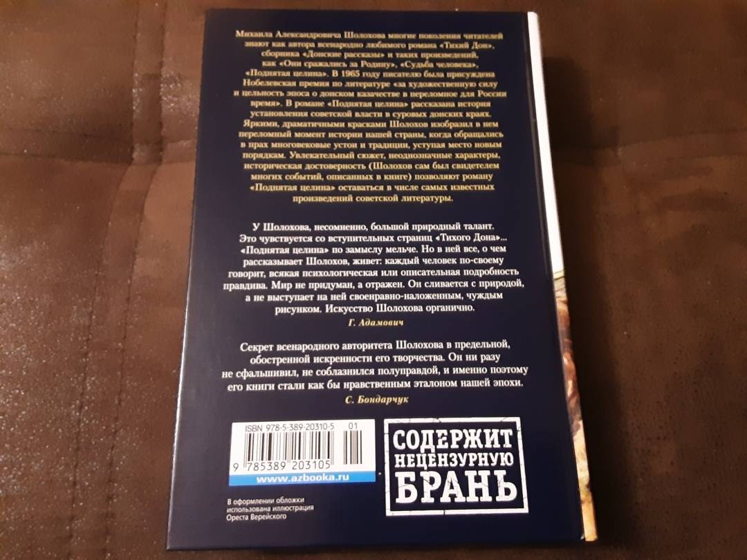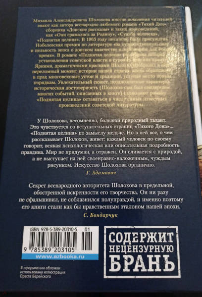ОписаниеМихаила Александровича Шолохова многие поколения читателей знают как автора всенародно любимого романа "Тихий Дон", сборника "Донских рассказов" и таких произведений, как "Они сражались за Родину", "Судьба человека", "Поднятая целина". В 1965 году писателю была присуждена Нобелевская премия по литературе "за художественную силу и цельность эпоса о донском казачестве в переломное для России время". В романе "Поднятая целина" рассказана история установления советской власти в суровых донских краях. Яркими, драматичными красками Шолохов изобразил в нем переломный момент истории нашей страны, когда обращались в прах многовековые устои и традиции, уступая место новым порядкам. Увлекательный сюжет, неоднозначные характеры, историческая достоверность (Шолохов сам был свидетелем многих событий, описанных в книге) позволяют роману "Поднятая целина" оставаться в числе самых известных произведений советской литературы.Михаила Александровича Шолохова многие поколения читателей знают как автора всенародно любимого романа "Тихий Дон", сборника "Донских рассказов" и таких произведений, как "Они сражались за Родину", "Судьба человека", "Поднятая целина". В 1965 году писателю была присуждена Нобелевская премия по литературе "за художественную силу и цельность эпоса о донском казачестве в переломное для России время". В романе "Поднятая целина" рассказана история установления советской власти в суровых донских краях. Яркими, драматичными красками Шолохов изобразил в нем переломный момент истории нашей страны, когда обращались в прах многовековые устои и традиции, уступая место новым порядкам. Увлекательный сюжет, неоднозначные характеры, историческая достоверность (Шолохов сам был свидетелем многих событий, описанных в книге) позволяют роману "Поднятая целина" оставаться в числе самых известных произведений советской литературы.