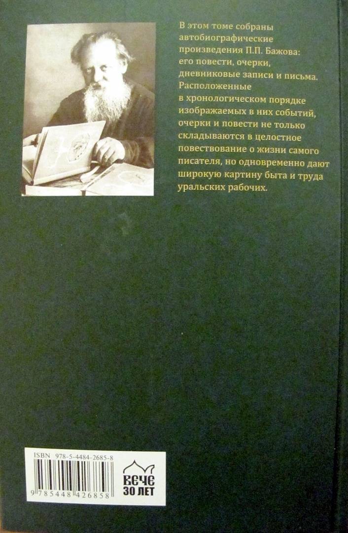 ОписаниеВ этом томе собраны автобиографические произведения П.П. Бажова: его повести, очерки, дневниковые записи и письма. Расположенные в хронологическом порядке изображаемых в них событий, очерки и повести не только складываются в целостное повествование о жизни самого писателя, но одновременно дают широкую картину быта и труда уральских рабочих.В этом томе собраны автобиографические произведения П.П. Бажова: его повести, очерки, дневниковые записи и письма. Расположенные в хронологическом порядке изображаемых в них событий, очерки и повести не только складываются в целостное повествование о жизни самого писателя, но одновременно дают широкую картину быта и труда уральских рабочих.