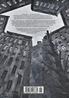 ОписаниеЭта книга - авторский проект замечательного петербургского художника Михаила Бычкова, чьи иллюстрации помогают нам ярче и конкретнее представить мир одного из самых значительных романов Ф. М. Достоевского. Роман "Преступление и наказание" (1866) оказал колоссальное влияние на развитие русской и мировой литературы. Он был задуман как "психологический отчет одного преступления", однако писатель далеко отступил от первоначальных планов. "Преступление и наказание" ставит перед читателем важнейшие нравственно-мировоззренческие вопросы о вере, совести, грехе и об искуплении через страдание и разворачивается как грандиозное философское исследование человеческой природы, как христианская трагедия о смерти и воскресении души. "Атмосфера романа часто важнее конкретных сцен. Ощущение безысходности, трагичности бытия я провел через все иллюстрации", - пишет М. Бычков.Эта книга - авторский проект замечательного петербургского художника Михаила Бычкова, чьи иллюстрации помогают нам ярче и конкретнее представить мир одного из самых значительных романов Ф. М. Достоевского. Роман "Преступление и наказание" (1866) оказал колоссальное влияние на развитие русской и мировой литературы. Он был задуман как "психологический отчет одного преступления", однако писатель далеко отступил от первоначальных планов. "Преступление и наказание" ставит перед читателем важнейшие нравственно-мировоззренческие вопросы о вере, совести, грехе и об искуплении через страдание и разворачивается как грандиозное философское исследование человеческой природы, как христианская трагедия о смерти и воскресении души. "Атмосфера романа часто важнее конкретных сцен. Ощущение безысходности, трагичности бытия я провел через все иллюстрации", - пишет М. Бычков.