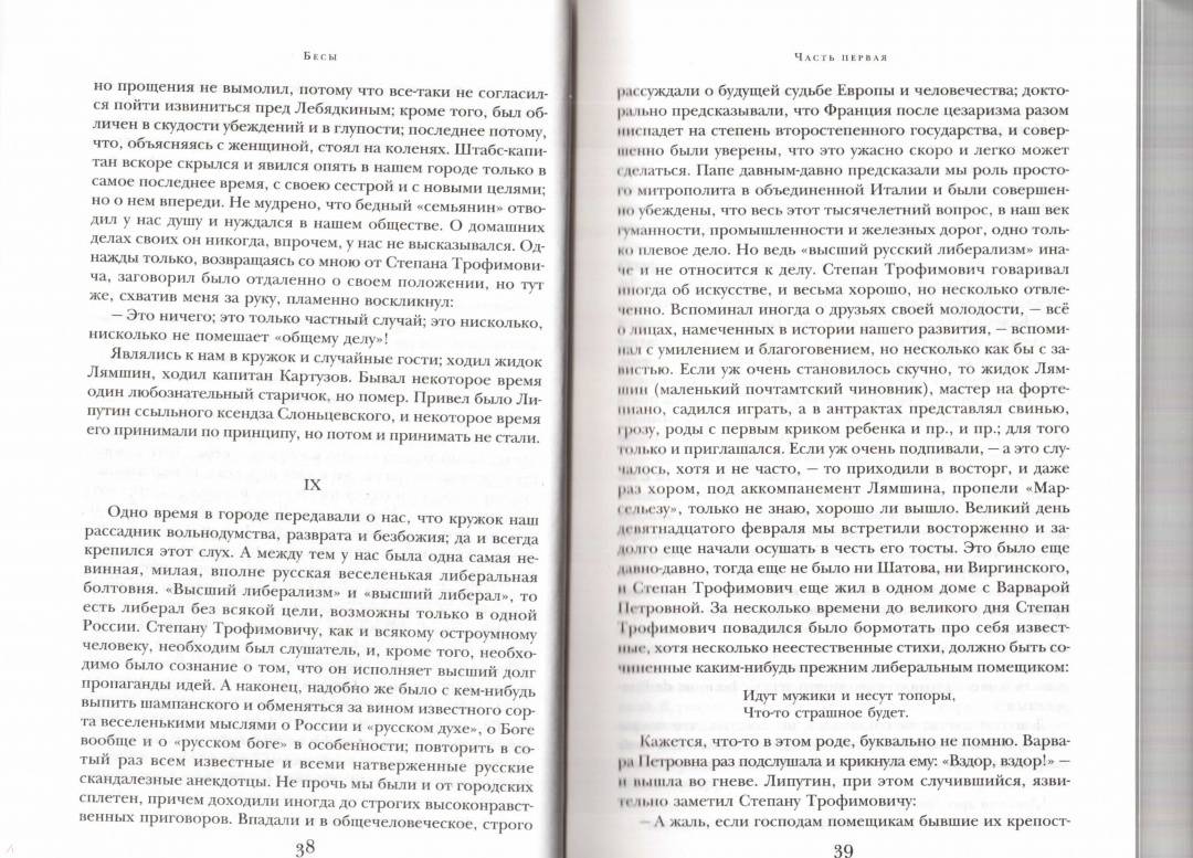 Свернуть"Бесы" (1872) - безусловно роман-предостережение и роман-пророчество, в котором великий писатель и мыслитель указывает на грядущие социальные катастрофы. История подтвердила правоту писателя, и неоднократно. Кровавая русская революция, деспотические режимы Гитлера и Сталина - страшные и точные подтверждения идеи о том, что ждет общество, в котором партийная мораль замещает человеческую.Но, взяв эпиграфом к роману евангельский текст, Достоевский предлагает и метафизическую трактовку описываемых событий. Не только и не столько о "неправильном" общественном устройстве идет речь в романе - душе человека грозит разложение и гибель, души в первую очередь должны исцелиться. Ибо любые теории о переустройстве мира могут привести к духовной слепоте и безумию, если утрачивается способность различения добра и зла.Долгое время после написания «Бесы» оставались романом, прочтение которого зависело от политических взглядов читателя и нередко от того, по какую сторону советской границы читатель находился. Задумав произведение на