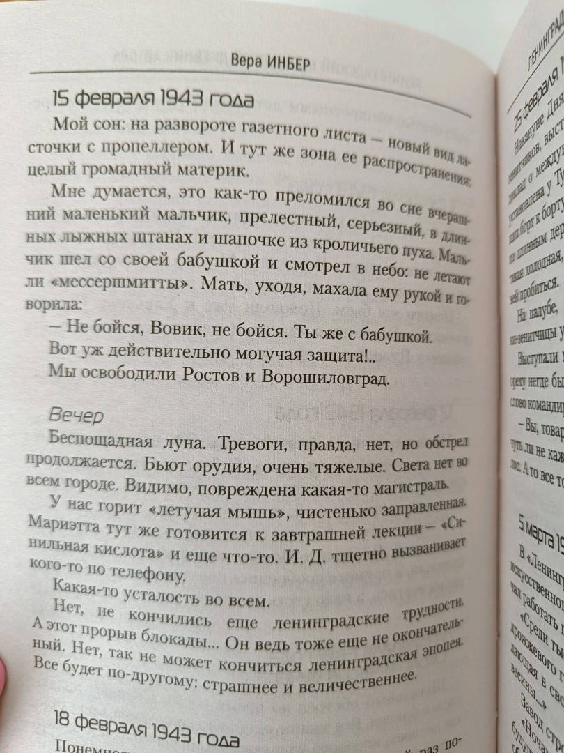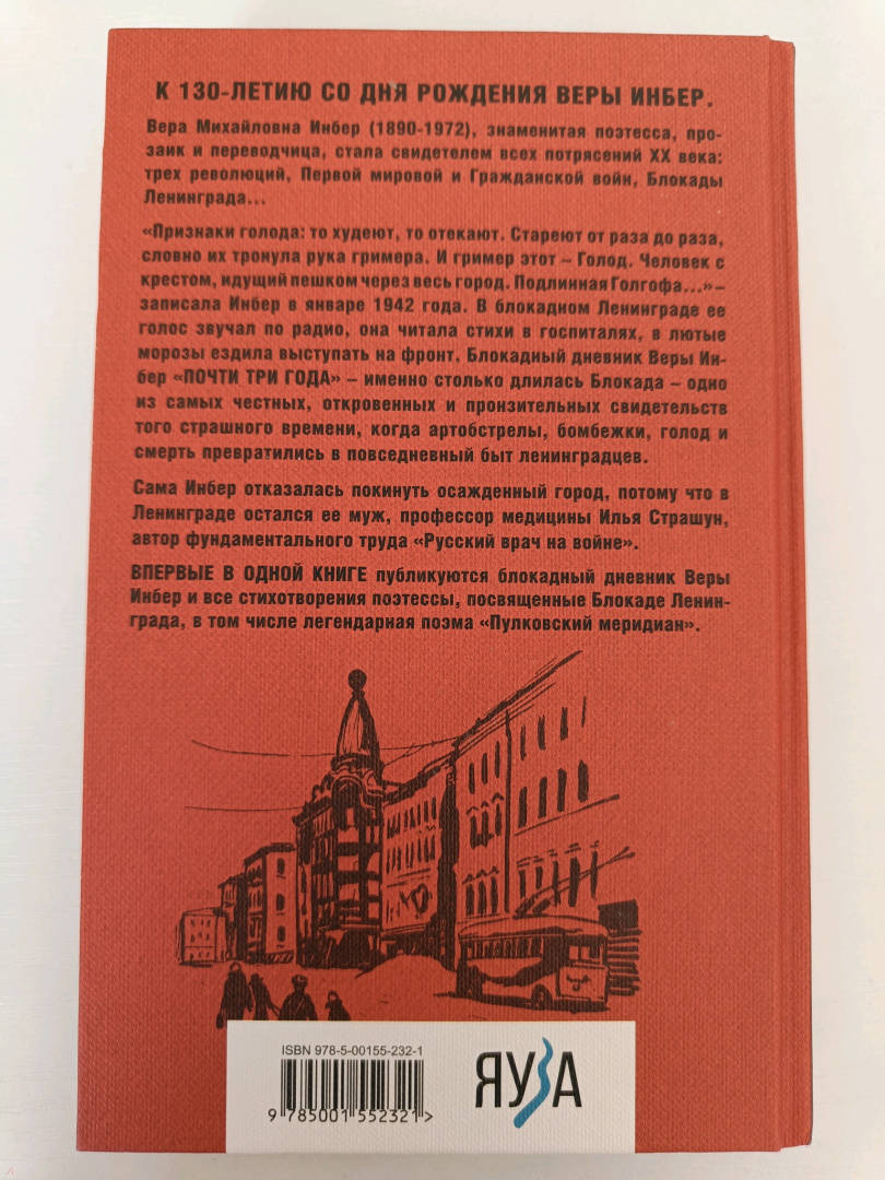ОписаниеВера Михайловна Инбер (1890-1972), знаменитая поэтесса, прозаик и переводчица, стала свидетелем всех потрясений XX века: трех революций, Первой мировой и Гражданской войн, Блокады Ленинграда... "Признаки голода: то худеют, то отекают. Стареют от раза до раза, словно их тронула рука гримера. И гример этот - Голод. Человек с крестом, идущий пешком через весь город. Подлинная Голгофа" - записала Инбер в январе 1942 года. В блокадном Ленинграде ее голос звучал по радио, она читала стихи в госпиталях, в лютые морозы ездила выступать на фронт. Блокадный дневник Веры Инбер "ПОЧТИ ТРИ ГОДА" - именно столько длилась Блокада - одно из самых честных, откровенных и пронзительных свидетельств того страшного времени, когда артобстрелы, бомбежки, голод и смерть превратились в повседневный быт ленинградцев.Сама Инбер отказалась покинуть осажденный город, потому что в Ленинграде остался ее муж, профессор медицины Илья Страшун, автор фундаментального труда "Русский врач на войне".ВПЕРВЫЕ В ОДНОЙ КНИГЕ публикуются блокадный дневник Веры Инбер и все стихотворения поэтессы, посвященные Блокаде Ленинграда, в том числе легендарная поэма "Пулковский меридиан".СвернутьВера Михайловна Инбер (1890-1972), знаменитая поэтесса, прозаик и переводчица, стала свидетелем всех потрясений XX века: трех революций, Первой мировой и Гражданской войн, Блокады Ленинграда... "Признаки голода: то худеют, то отекают. Стареют от раза до раза, словно их тронула рука гримера. И гример этот - Голод. Человек с крестом, идущий пешком через весь город. Подлинная Голгофа" - записала Инбер в январе 1942 года. В блокадном Ленинграде ее голос звучал по радио, она читала стихи в госпиталях, в лютые морозы ездила выступать на фронт. Блокадный дневник Веры Инбер "ПОЧТИ ТРИ ГОДА" - именно столько длилась Блокада - одно из самых честных, откровенных и пронзительных свидетельств того страшного времени, когда артобстрелы, бомбежки, голод и смерть превратились в повседневный быт ленинградцев.Сама Инбер отказалась покинуть осажденный город, потому что в Ленинграде остался ее муж, профессор медицины Илья Страшун, автор фундаментального труда "Русский врач на войне".ВПЕРВЫЕ В ОДНОЙ КНИГЕ публикуются блокадный дневник Веры Инбер и все стихотворения поэтессы, посвященные Блокаде Ленинграда, в том числе легендарная поэма "Пулковский меридиан".СвернутьСвернуть
