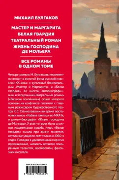 ОписаниеЧетыре романа М. Булгакова несомненно входят в золотой фонд русской классики ХХ века: и культовые блистательные - "Мастер и Маргарита" и "Белая гвардия", во многом автобиографичный, и загадочный - "Театральный роман" ("Записки покойника"), сюжет которого во многом основан на конфликте писателя с главным режиссером Художественного театра К. С. Станиславским во время постановки пьесы "Кабала святош" во МХАТе, и увлекательный - "Жизнь господина де Мольера". У всех четырех была сложная издательская судьба: лишь один роман "Белая гвардия" был напечатан при жизни писателя, остальные появились в печати только в 60-х годах. Попадая в удивительный мир произведений писателя читатель остается покоренными талантом, мастерством, фантазией писателя с первых до последних строк.Четыре романа М. Булгакова несомненно входят в золотой фонд русской классики ХХ века: и культовые блистательные - "Мастер и Маргарита" и "Белая гвардия", во многом автобиографичный, и загадочный - "Театральный роман" ("Записки покойника"), сюжет которого во многом основан на конфликте писателя с главным режиссером Художественного театра К. С. Станиславским во время постановки пьесы "Кабала святош" во МХАТе, и увлекательный - "Жизнь господина де Мольера". У всех четырех была сложная издательская судьба: лишь один роман "Белая гвардия" был напечатан при жизни писателя, остальные появились в печати только в 60-х годах. Попадая в удивительный мир произведений писателя читатель остается покоренными талантом, мастерством, фантазией писателя с первых до последних строк.
