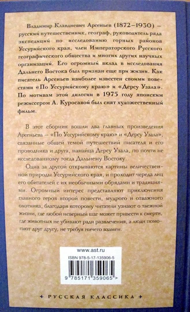ОписаниеВ этот сборник вошли два главных произведения Арсеньева - "По Уссурийскому краю" и "Дерсу Узала", связанные общей темой путешествий писателя и его проводника и друга, нанайца Дерсу Узала, по почти неисследованному тогда Дальнему Востоку.Одна за другой открываются картины величественной природы Уссурийского края, и проходит череда лиц его обитателей с их необычными обрядами и традициями. Огромный интерес представляют приключения главного героя второй повести, мудрого и отважного охотника, благодаря которому читатели узнают о таежной жизни, где любой неверный шаг может привести к смерти, где животных не убивают ради развлечения, а люди помогают друг другу, не требуя ничего взамен.В этот сборник вошли два главных произведения Арсеньева - "По Уссурийскому краю" и "Дерсу Узала", связанные общей темой путешествий писателя и его проводника и друга, нанайца Дерсу Узала, по почти неисследованному тогда Дальнему Востоку.Одна за другой открываются картины величественной природы Уссурийского края, и проходит череда лиц его обитателей с их необычными обрядами и традициями. Огромный интерес представляют приключения главного героя второй повести, мудрого и отважного охотника, благодаря которому читатели узнают о таежной жизни, где любой неверный шаг может привести к смерти, где животных не убивают ради развлечения, а люди помогают друг другу, не требуя ничего взамен.