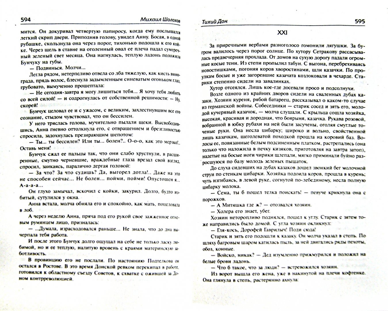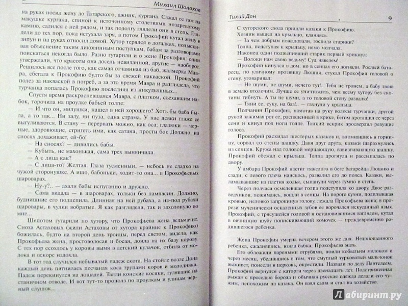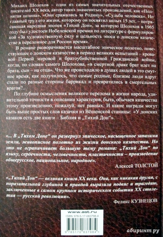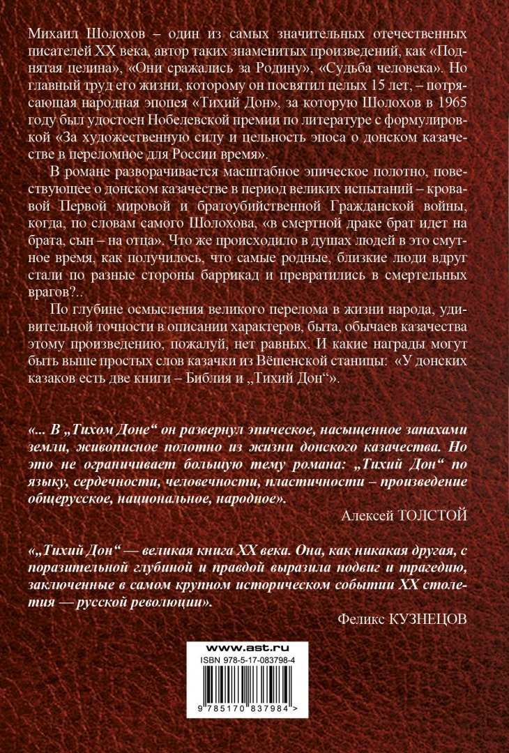 ОписаниеВ романе разворачивается масштабное эпическое полотно, повествующее о донском казачестве в период великих испытаний - кровавой Первой мировой и братоубийственной Гражданской войны, когда, по словам самого Шолохова, "в смертной драке брат идет на брата, сын - на отца". Что же происходило в душах людей в это смутное время, как получилось, что самые родные, близкие люди вдруг стали по разные стороны баррикад и превратились в смертельных врагов?..По глубине осмысления великого перелома в жизни народа, удивительной точности в описании характеров, быта, обычаев казачества этому произведению, пожалуй, нет равных. И какие награды могут быть выше простых слов казачки из Вешенской станицы: "У донских казаков есть две книги - Библия и "Тихий Дон"".В романе разворачивается масштабное эпическое полотно, повествующее о донском казачестве в период великих испытаний - кровавой Первой мировой и братоубийственной Гражданской войны, когда, по словам самого Шолохова, "в смертной драке брат идет на брата, сын - на отца". Что же происходило в душах людей в это смутное время, как получилось, что самые родные, близкие люди вдруг стали по разные стороны баррикад и превратились в смертельных врагов?..По глубине осмысления великого перелома в жизни народа, удивительной точности в описании характеров, быта, обычаев казачества этому произведению, пожалуй, нет равных. И какие награды могут быть выше простых слов казачки из Вешенской станицы: "У донских казаков есть две книги - Библия и "Тихий Дон"".