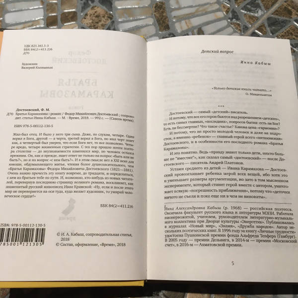 ОписаниеЖил-был отец. И было у него три сына. Даже, по слухам, четыре. Один верил в Бога, другой - в черта, третий верил в Бога, но жил черт знает как, а четвертый был уверен, что если Бога нет, то все позволено. Четыре кредо, четыре жизненных стратегии. С тех пор прошло почти полтора столетия - до неузнаваемости изменился мир, но человек остался прежним. Он, как и прежде, ищет ответ не только на вопрос "быть или не быть?", но и на вопрос "с кем быть?". И в этом смысле нет в ХХI веке для юноши, обдумывающего житье, чтения более душеспасительного, чем "Братья Карамазовы" Федора Михайловича Достоевского (1821-1881). Очень важно прочесть эту книгу вовремя, до тридцати, и определиться, с кем из братьев тебе по пути. И, возможно, кто-нибудь из новых читателей, перевернув последнюю страницу великого романа, воскликнет, как знаменитый русский живописец Иван Крамской: "Ну, если и после этого мир не перевернется на оси туда, куда желает художник, то умирай человеческое сердце!" Сопроводительная статья Инны Кабыш Инна Александровна Кабыш (р. 1968) - российская поэтесса. Окончила факультет русского языка и литературы МЗПИ. Работала пионервожатой, учителем, руководителем литературно-музыкального коллектива при Дворце культуры "Энергетик". Публиковалась в журналах "Новый мир", "Знамя", "Дружба народов". Автор нескольких поэтических книг. В 1996 году за книгу "Личные трудности" удостоена Пушкинской премии фонда Альфреда Тепфера (Гамбург). В 2005 году - премии Дельвига, в 2014-м - премии "Московский счет", в 2016-м - Ахматовской премии.СвернутьЖил-был отец. И было у него три сына. Даже, по слухам, четыре. Один верил в Бога, другой - в черта, третий верил в Бога, но жил черт знает как, а четвертый был уверен, что если Бога нет, то все позволено. Четыре кредо, четыре жизненных стратегии. С тех пор прошло почти полтора столетия - до неузнаваемости изменился мир, но человек остался прежним. Он, как и прежде, ищет ответ не только на вопрос "быть или не быть?", но и на вопрос "с кем быть?". И в этом смысле нет в ХХI веке для юноши, обдумывающего житье, чтения более душеспасительного, чем "Братья Карамазовы" Федора Михайловича Достоевского (1821-1881). Очень важно прочесть эту книгу вовремя, до тридцати, и определиться, с кем из братьев тебе по пути. И, возможно, кто-нибудь из новых читателей, перевернув последнюю страницу великого романа, воскликнет, как знаменитый русский живописец Иван Крамской: "Ну, если и после этого мир не перевернется на оси туда, куда желает художник, то умирай человеческое сердце!" Сопроводительная статья Инны Кабыш Инна Александровна Кабыш (р. 1968) - российская поэтесса. Окончила факультет русского языка и литературы МЗПИ. Работала пионервожатой, учителем, руководителем литературно-музыкального коллектива при Дворце культуры "Энергетик". Публиковалась в журналах "Новый мир", "Знамя", "Дружба народов". Автор нескольких поэтических книг. В 1996 году за книгу "Личные трудности" удостоена Пушкинской премии фонда Альфреда Тепфера (Гамбург). В 2005 году - премии Дельвига, в 2014-м - премии "Московский счет", в 2016-м - Ахматовской премии.СвернутьСвернуть