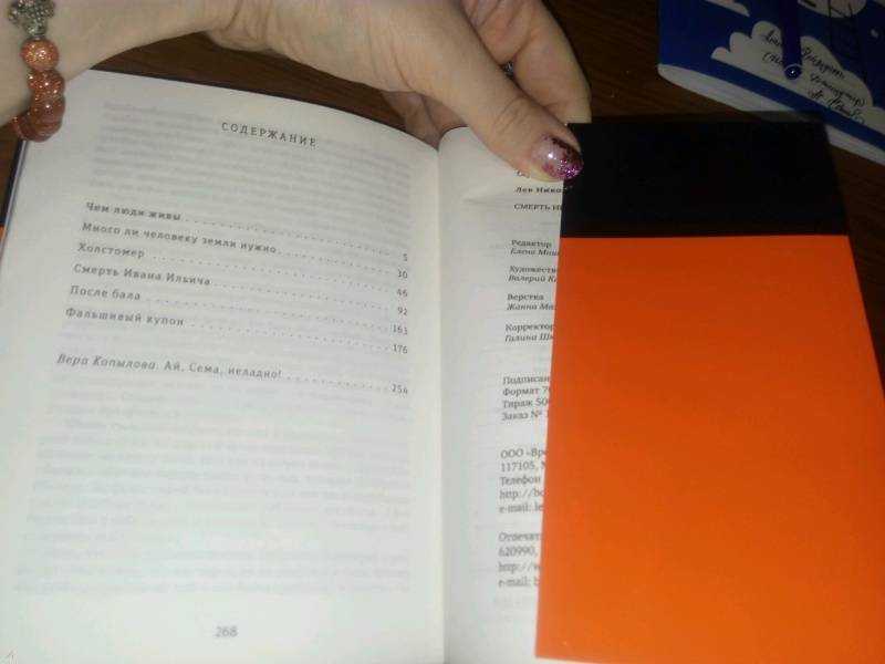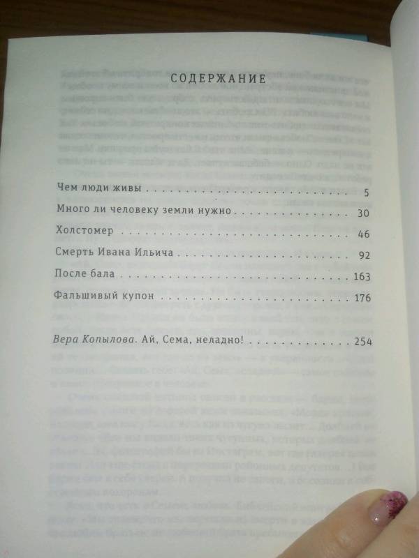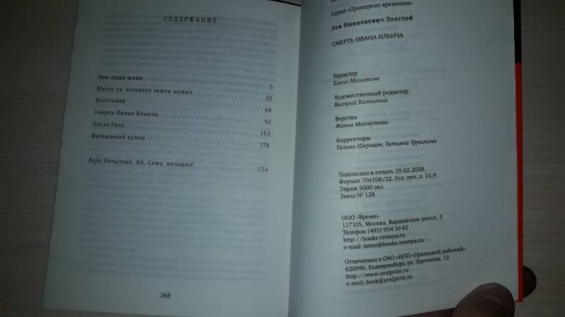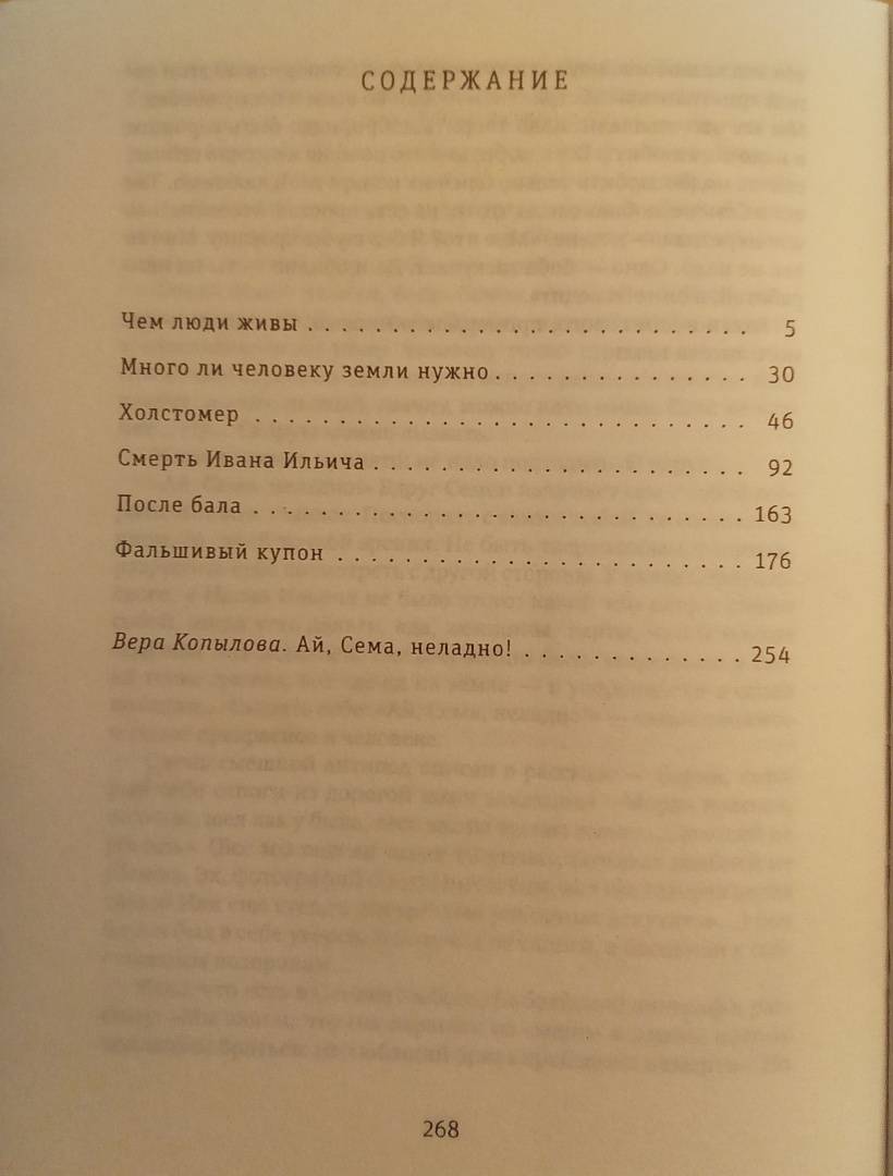 ОписаниеВ книге собраны рассказы и повести Льва Толстого (1828-1910), которые написаны им на исходе ХIХ века и представляют Толстого-психолога, Толстого-философа, Толстого-советчика, размышляющего на темы из частной человеческой жизни: эгоизм и душевная широта, собственность, искушения, насилие, жадность... Словом, те темы, которые волнуют любого, даже самого "маленького" человека, просто проживающего свою жизнь. Обиженного, больного, несчастного, влюбленного, брошенного - и, конечно, смертного. "Прошедшая история жизни Ивана Ильича была самая простая и обыкновенная и самая ужасная". Эту знаменитую толстовскую фразу такой человек ощущает, как укол в сердце, и думает: "Это про меня". Программные повести и рассказы "Смерть Ивана Ильича", "Холстомер" и "После бала" дополнены не столь широко известным "Фальшивым купоном", а также притчевыми "Чем люди живы" и "Сколько человеку земли нужно".Сопроводительная статья Веры КопыловойВера Копылова (род. в 1985 году в Москве) - журналист, редактор, драматург. Окончила Литературный институт им. А. М. Горького. Автор нескольких пьес и инсценировок. В течение семи лет работала литературным обозревателем газеты "Московский Комсомолец". Публиковала статьи в изданиях и на информационных порталах "РИА Новости", "Аргументы и факты", РБК, "Российская газета", "Вечерняя Москва", "Эксперт", "Книжное обозрение", "Русская мысль", "Читаем вместе" и др. В настоящее время - редактор издательства "Время".СвернутьВ книге собраны рассказы и повести Льва Толстого (1828-1910), которые написаны им на исходе ХIХ века и представляют Толстого-психолога, Толстого-философа, Толстого-советчика, размышляющего на темы из частной человеческой жизни: эгоизм и душевная широта, собственность, искушения, насилие, жадность... Словом, те темы, которые волнуют любого, даже самого "маленького" человека, просто проживающего свою жизнь. Обиженного, больного, несчастного, влюбленного, брошенного - и, конечно, смертного. "Прошедшая история жизни Ивана Ильича была самая простая и обыкновенная и самая ужасная". Эту знаменитую толстовскую фразу такой человек ощущает, как укол в сердце, и думает: "Это про меня". Программные повести и рассказы "Смерть Ивана Ильича", "Холстомер" и "После бала" дополнены не столь широко известным "Фальшивым купоном", а также притчевыми "Чем люди живы" и "Сколько человеку земли нужно".Сопроводительная статья Веры КопыловойВера Копылова (род. в 1985 году в Москве) - журналист, редактор, драматург. Окончила Литературный институт им. А. М. Горького. Автор нескольких пьес и инсценировок. В течение семи лет работала литературным обозревателем газеты "Московский Комсомолец". Публиковала статьи в изданиях и на информационных порталах "РИА Новости", "Аргументы и факты", РБК, "Российская газета", "Вечерняя Москва", "Эксперт", "Книжное обозрение", "Русская мысль", "Читаем вместе" и др. В настоящее время - редактор издательства "Время".СвернутьСвернуть