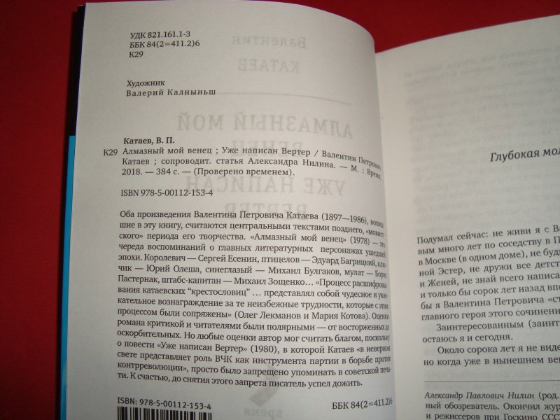 ОписаниеОба произведения Валентина Петровича Катаева (1897-1986), вошедшие в эту книгу, считаются центральными текстами позднего, "мовистского" периода его творчества. "Алмазный мой венец" (1978) - это череда воспоминаний о главных литературных персонажах ушедшей эпохи. Королевич - Сергей Есенин, птицелов - Эдуард Багрицкий, ключик - Юрий Олеша, синеглазый - Михаил Булгаков, мулат - Борис Пастернак, штабс-капитан - Михаил Зощенко… "Процесс расшифровывания катаевских "крестословиц" … представлял собой чудесное и увлекательное вознаграждение за те неизбежные трудности, которые с этим процессом были сопряжены". Оценки романа критикой и читателями были полярными - от восторженных до оскорбительных. Но любые оценки автор мог считать благом, поскольку о повести "Уже написан Вертер" (1980), в которой Катаев "в неверном свете представляет роль ВЧК как инструмента партии в борьбе против контрреволюции", просто было запрещено упоминать в советской печати. К счастью, до снятия этого запрета писатель успел дожить. Сопроводительная статья Александра Нилина Александр Павлович Нилин (род. 1940) - прозаик, журналист, спортивный обозреватель. Окончил журфак МГУ и Высшие курсы сценаристов и режиссеров при Госкино СССР. Автор книг "Зимняя дача", "Станция Переделкино: поверх заборов", "Спортивный интерес", "Красная машина", "Стрельцов: человек без локтей" и др. В настоящее время живет и работает в Москве и Переделкине.СвернутьОба произведения Валентина Петровича Катаева (1897-1986), вошедшие в эту книгу, считаются центральными текстами позднего, "мовистского" периода его творчества. "Алмазный мой венец" (1978) - это череда воспоминаний о главных литературных персонажах ушедшей эпохи. Королевич - Сергей Есенин, птицелов - Эдуард Багрицкий, ключик - Юрий Олеша, синеглазый - Михаил Булгаков, мулат - Борис Пастернак, штабс-капитан - Михаил Зощенко… "Процесс расшифровывания катаевских "крестословиц" … представлял собой чудесное и увлекательное вознаграждение за те неизбежные трудности, которые с этим процессом были сопряжены". Оценки романа критикой и читателями были полярными - от восторженных до оскорбительных. Но любые оценки автор мог считать благом, поскольку о повести "Уже написан Вертер" (1980), в которой Катаев "в неверном свете представляет роль ВЧК как инструмента партии в борьбе против контрреволюции", просто было запрещено упоминать в советской печати. К счастью, до снятия этого запрета писатель успел дожить. Сопроводительная статья Александра Нилина Александр Павлович Нилин (род. 1940) - прозаик, журналист, спортивный обозреватель. Окончил журфак МГУ и Высшие курсы сценаристов и режиссеров при Госкино СССР. Автор книг "Зимняя дача", "Станция Переделкино: поверх заборов", "Спортивный интерес", "Красная машина", "Стрельцов: человек без локтей" и др. В настоящее время живет и работает в Москве и Переделкине.СвернутьСвернуть